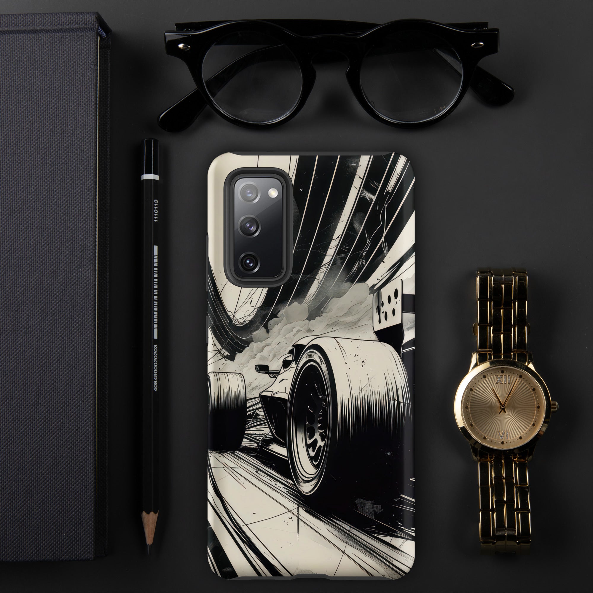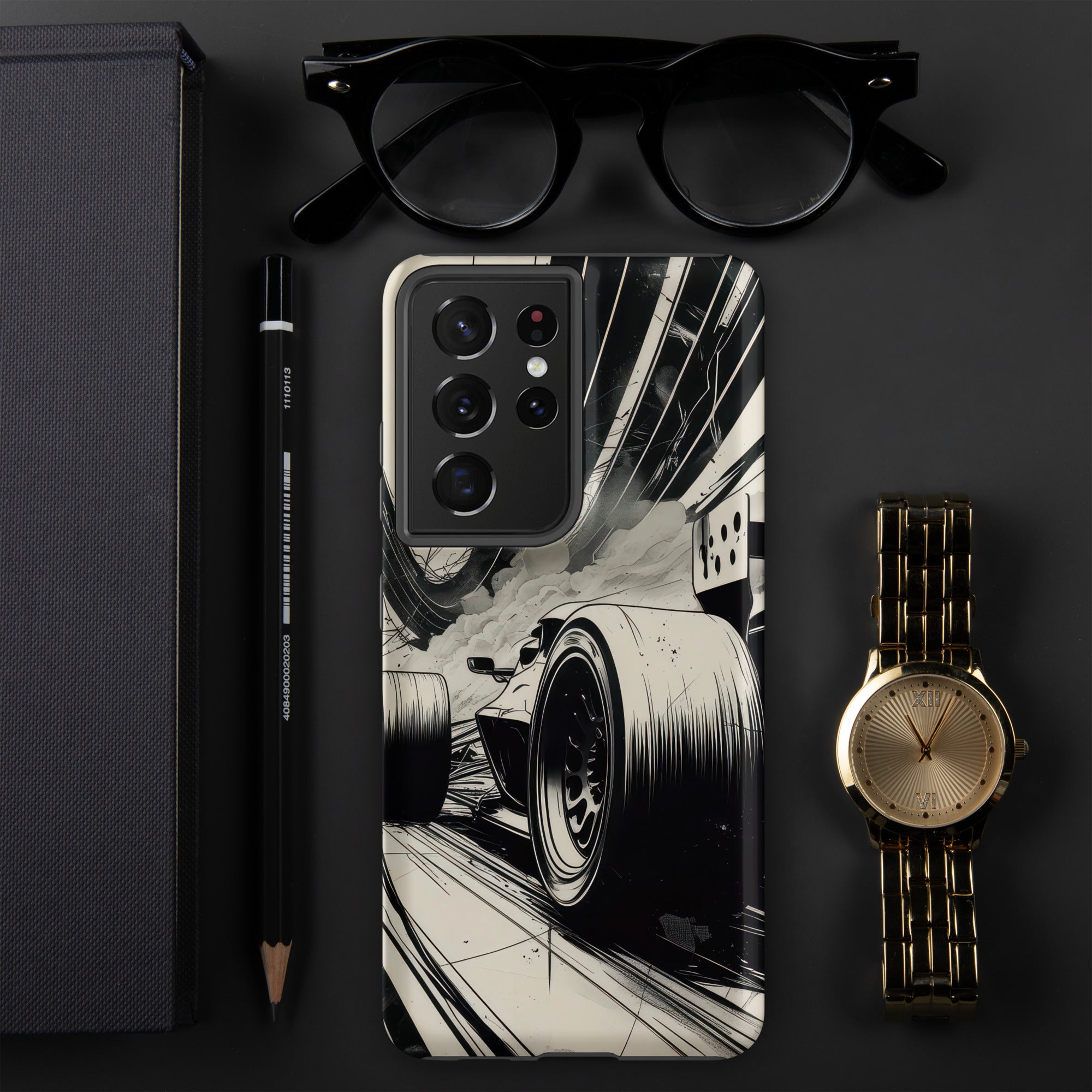 Dynamic race car silhouettes and sweeping track curves bring motorsport drama to your Samsung device. The monochrome art stands out against a tough, smooth shell that adds grip without extra bulk. Perfect for daily commutes, road trips, and late night scrolling, it turns your phone into a portable pit lane. Enjoy durable dual layer protection with this Tough Case for Samsung®.
