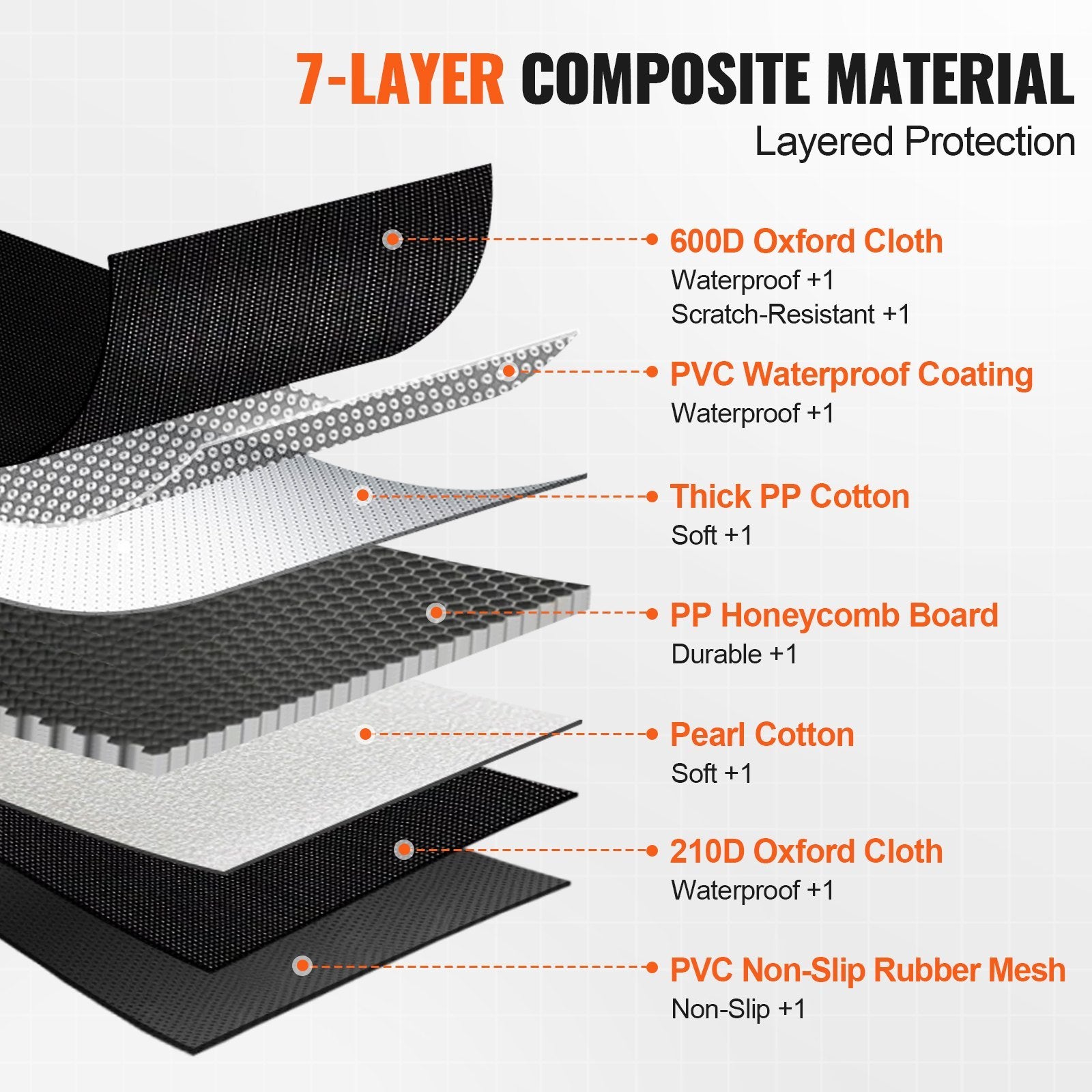 • Durable 600D Oxford cloth with PVC waterproof coating for reliable spill and mud protection