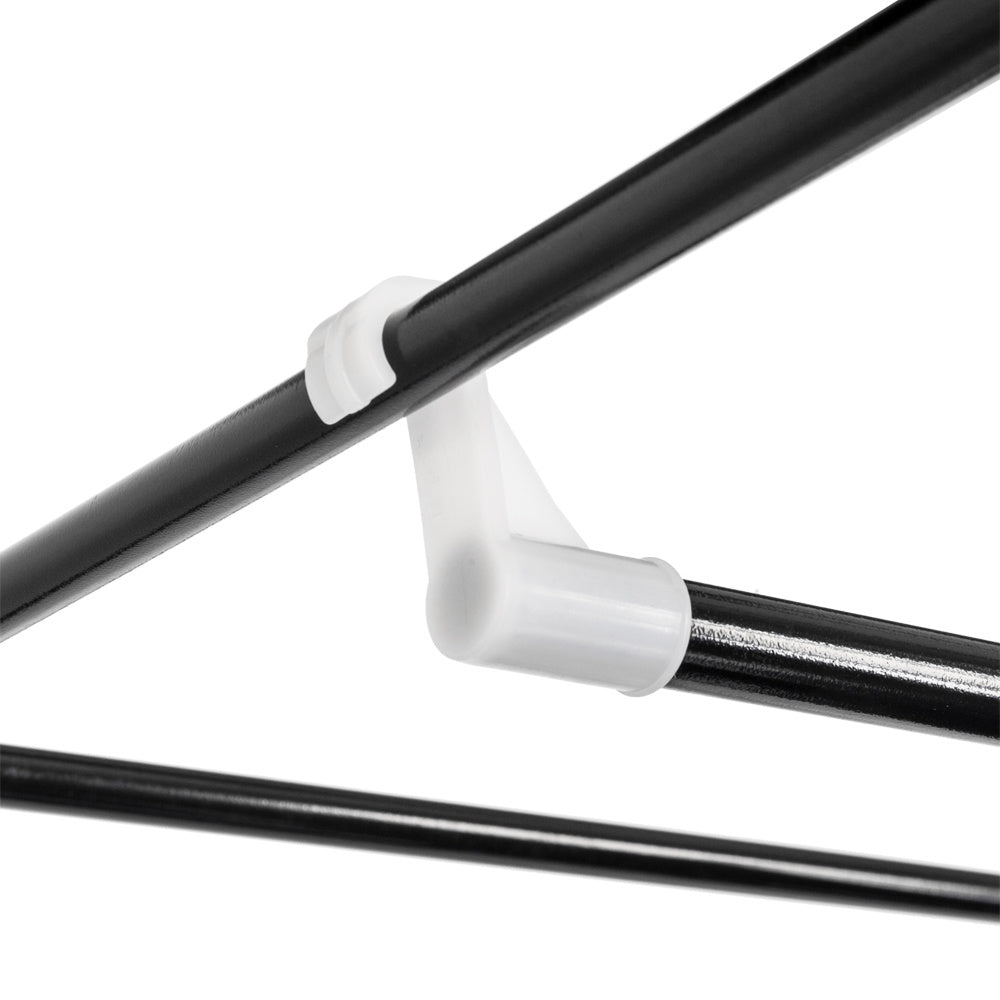 Coocosh Support Frame Connector with durable black steel tubes and white plastic joints, designed for exceptional stability and seamless assembly in outdoor settings, viewed from a close-up angle.