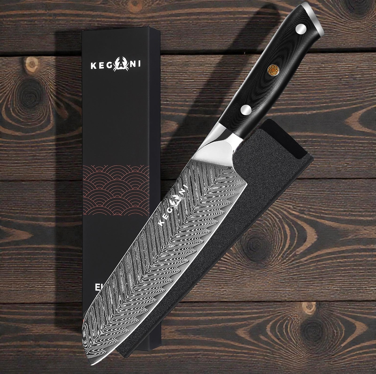 KEGANI Damascus Chef Knife with black pakkawood handle showcasing the distinctive wavy pattern of the blade, presented with its black box and protective sheath on a dark wood surface.