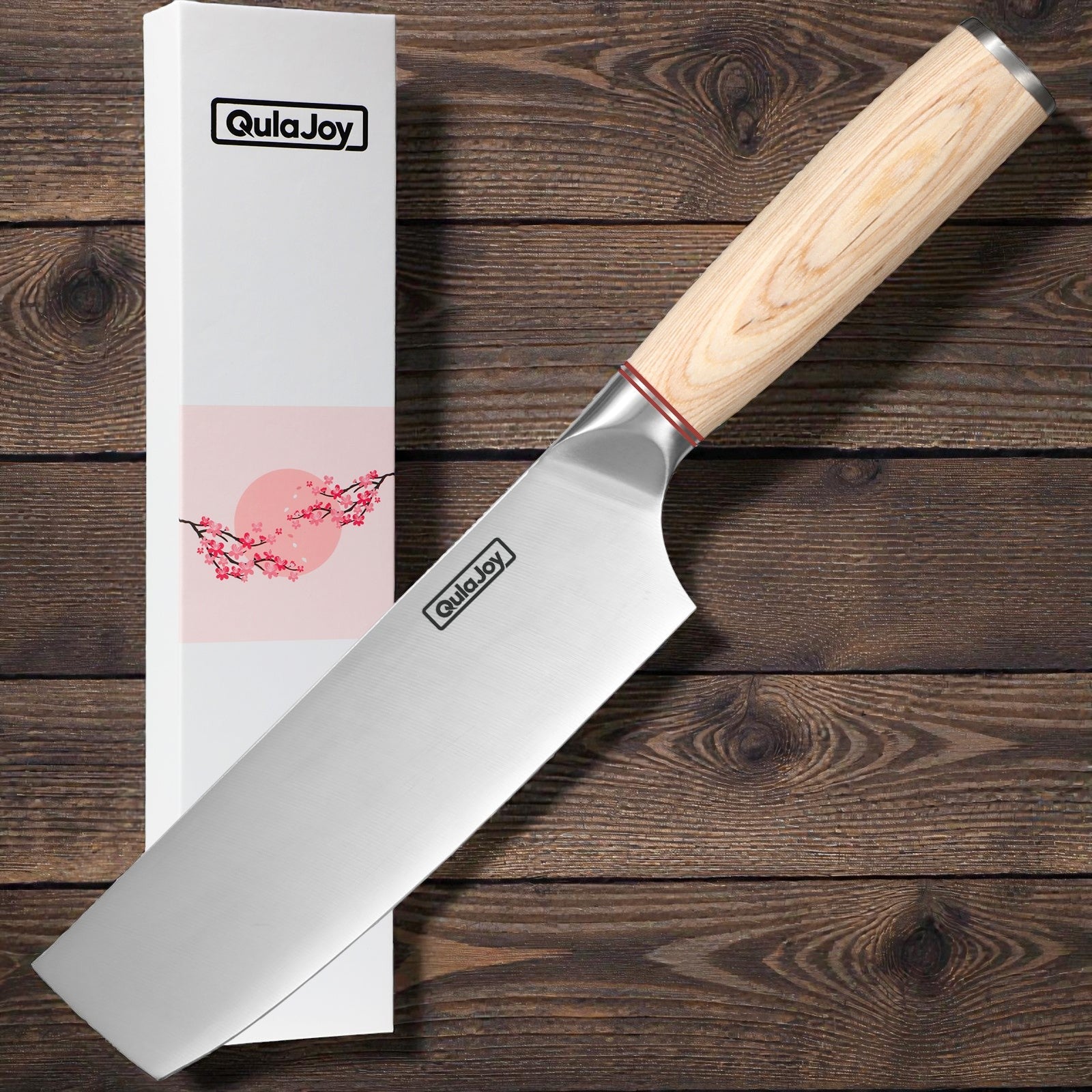 QulaJoy chef's knife with a light wood handle and stainless steel blade, presented diagonally next to its white packaging featuring cherry blossoms, on a rustic wooden surface.