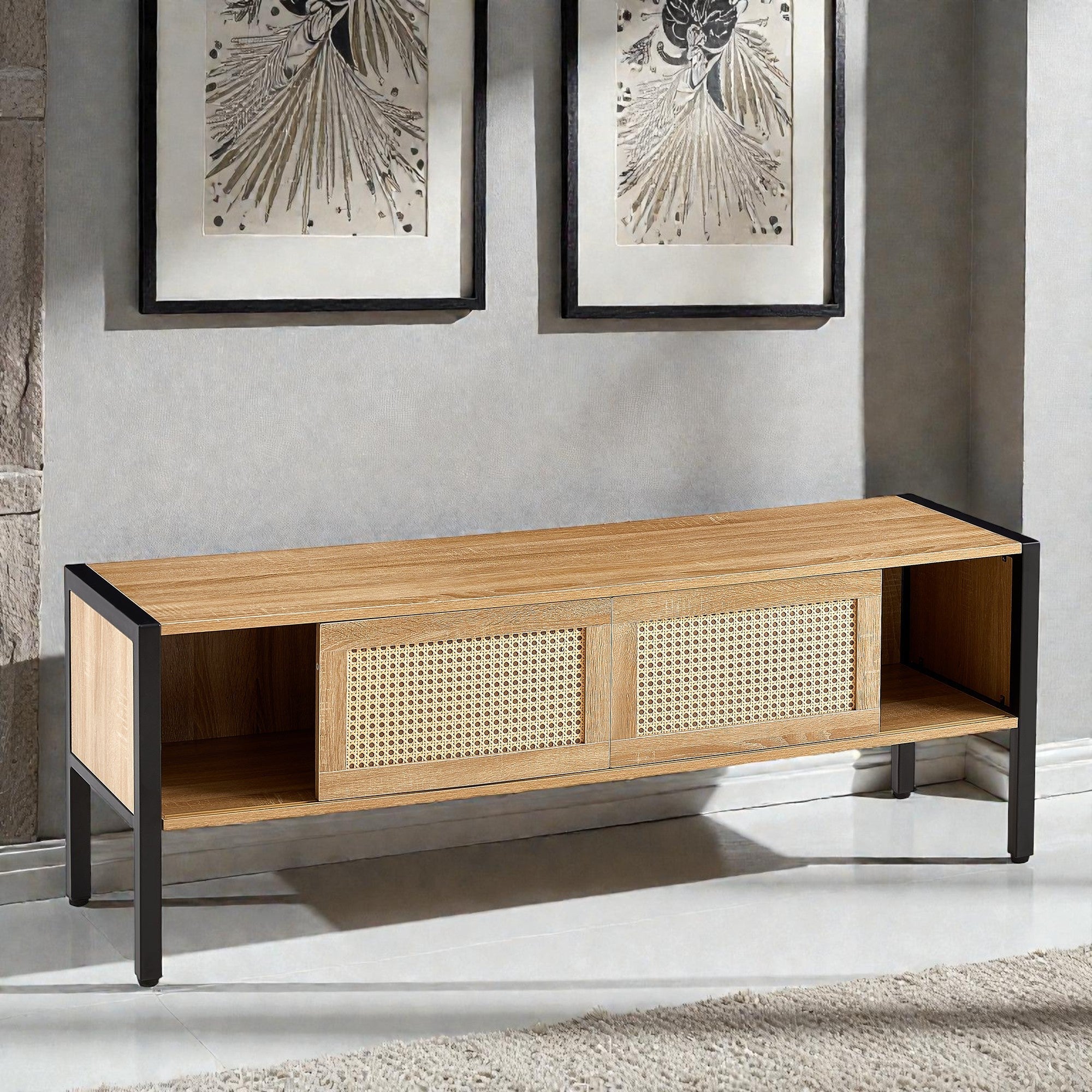 Transform your living space with this stylish TV stand that seamlessly blends natural elements with contemporary design. Featuring a warm rattan front, this piece not only provides ample storage but also adds a touch of elegance to your home decor.