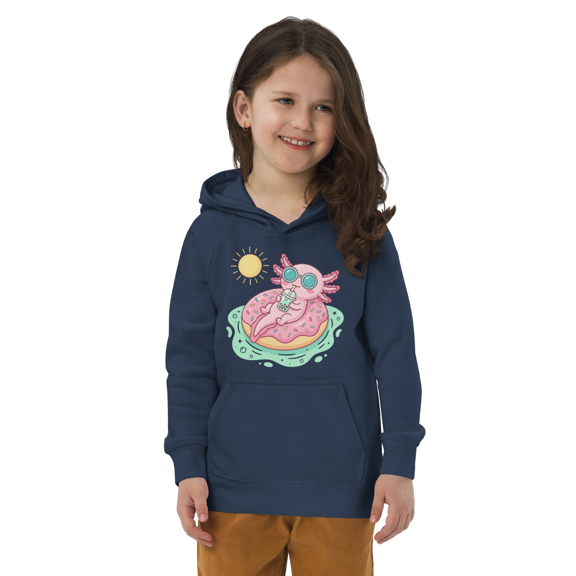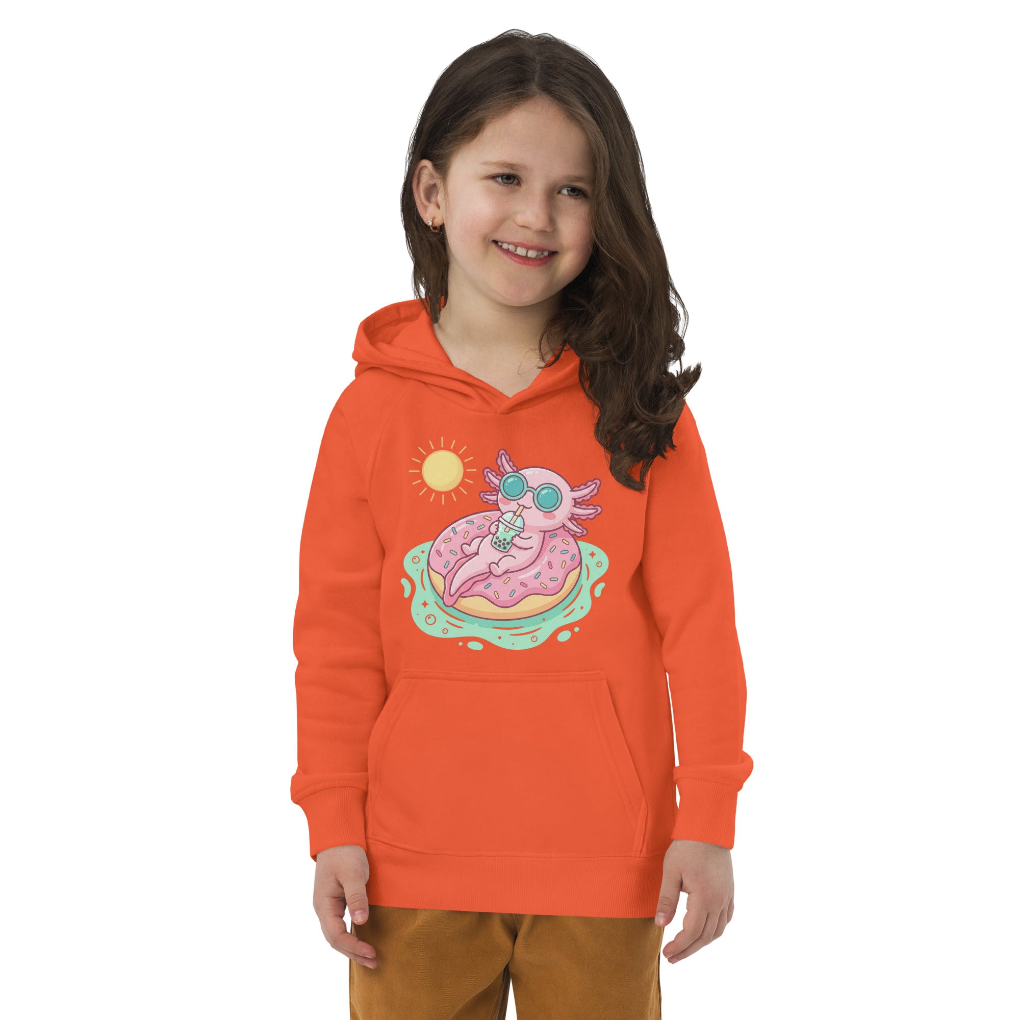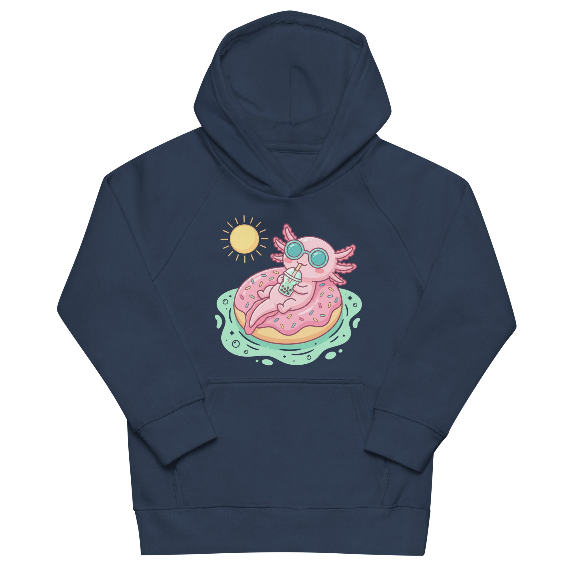 Dive into cuteness with this adorable hoodie featuring a pastel pink axolotl chilling on a sprinkle-covered donut floatie, sipping boba under a bright yellow sun. The whimsical design captures a perfectly relaxed summer vibe, set against serene light green water. Crafted for comfort, this hoodie is snug and soft to the touch, perfect for keeping your little one cozy during any season. Its premium quality makes it ideal for everyday wear, offering both warmth and a playful style. Enjoy effortless comfort and sustainable fashion with this Kids' Organic Eco-Friendly Hoodie, designed for happy adventures.