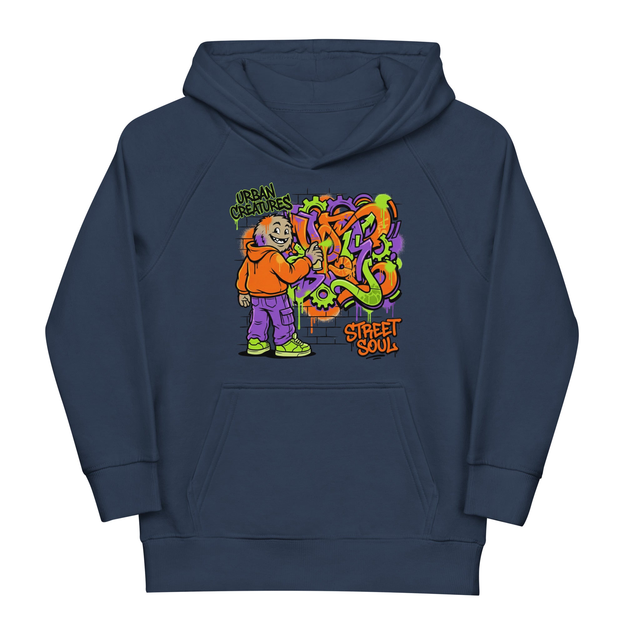 This vibrant kids eco hoodie showcases a cool, furry character with a wide smile, spray-painting colorful graffiti on a brick wall background. The dynamic artwork features bold splashes of bright green, purple, and orange, along with the phrases 'URBAN CREATURES' and 'STREET SOUL'. Crafted for comfort and warmth, this hoodie is made from soft organic cotton and recycled polyester, providing a snug fit for active kids. It's a premium quality garment, perfect for everyday wear, offering an earth-friendly fashion choice.