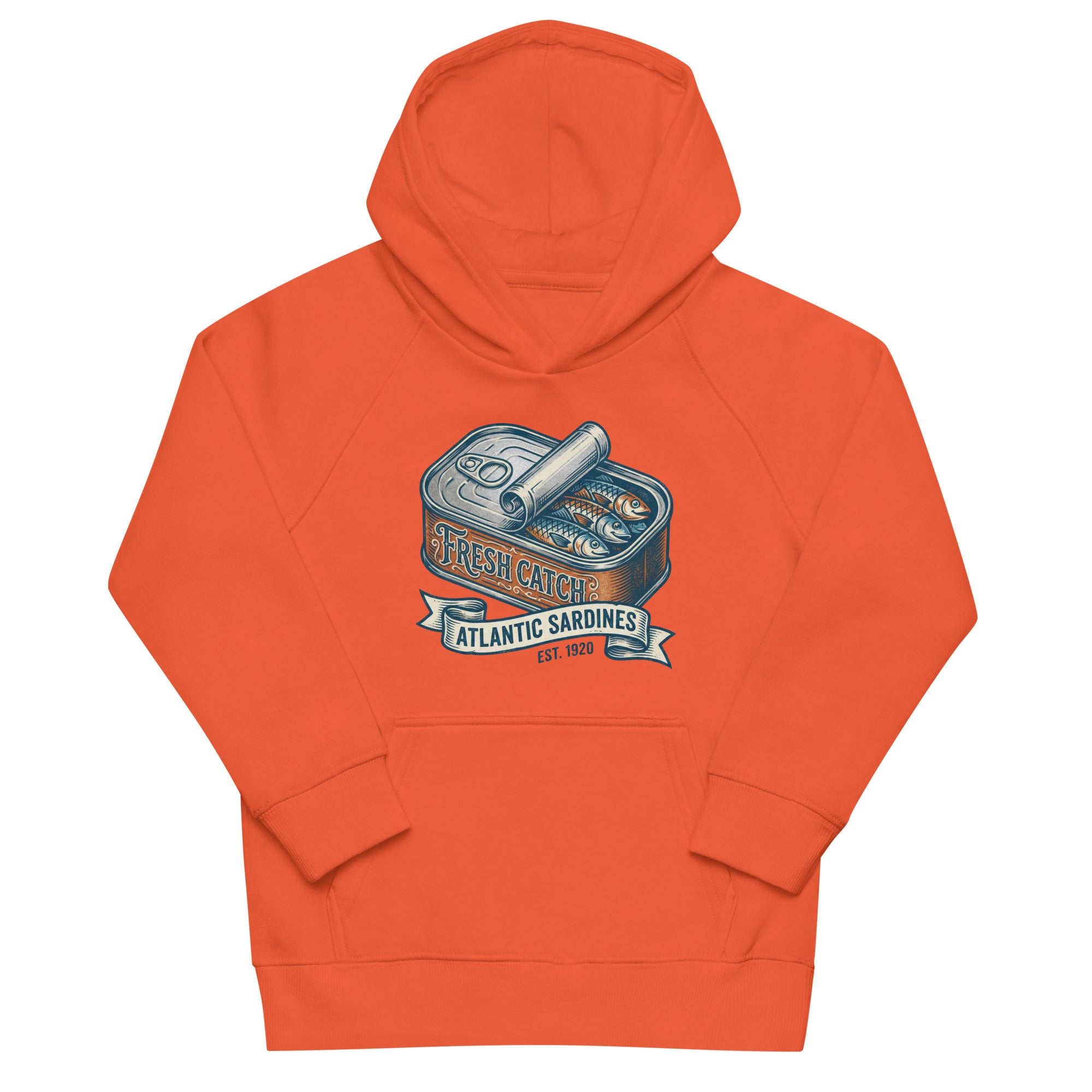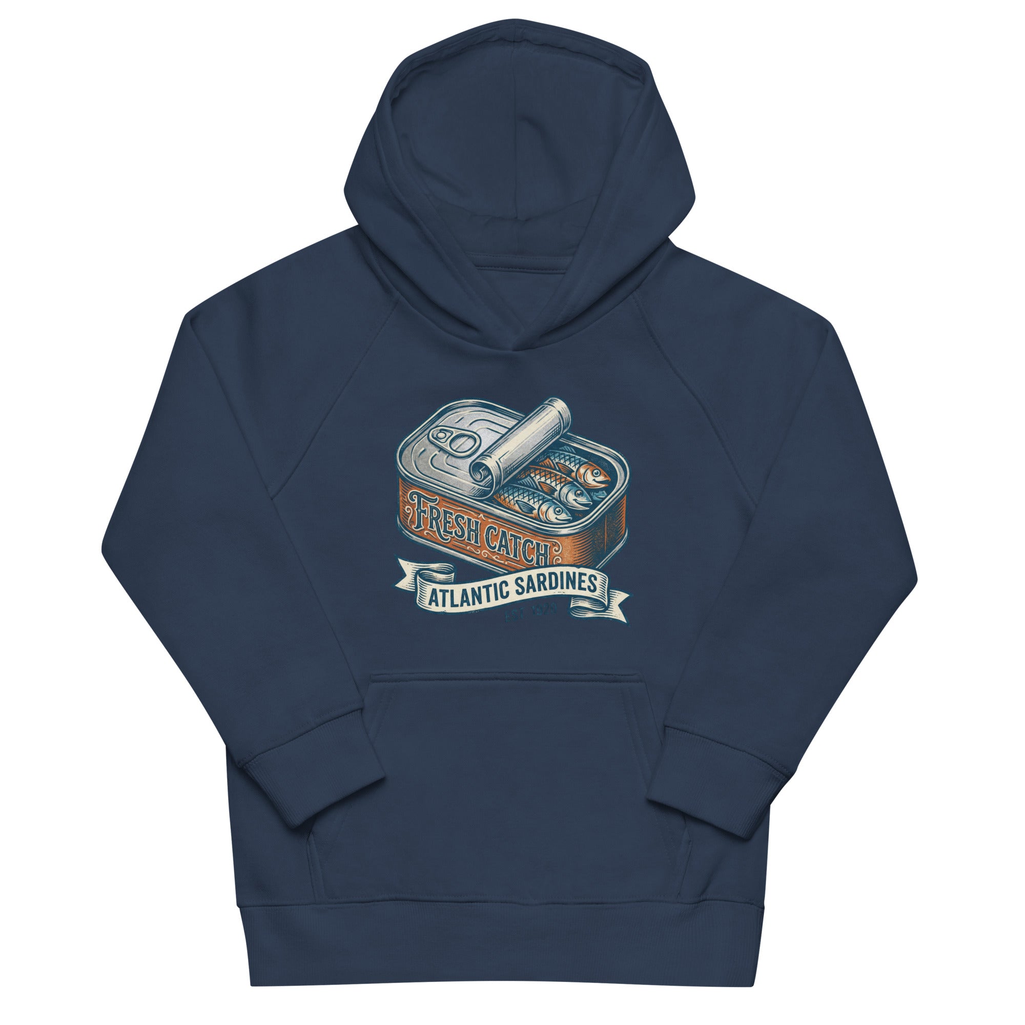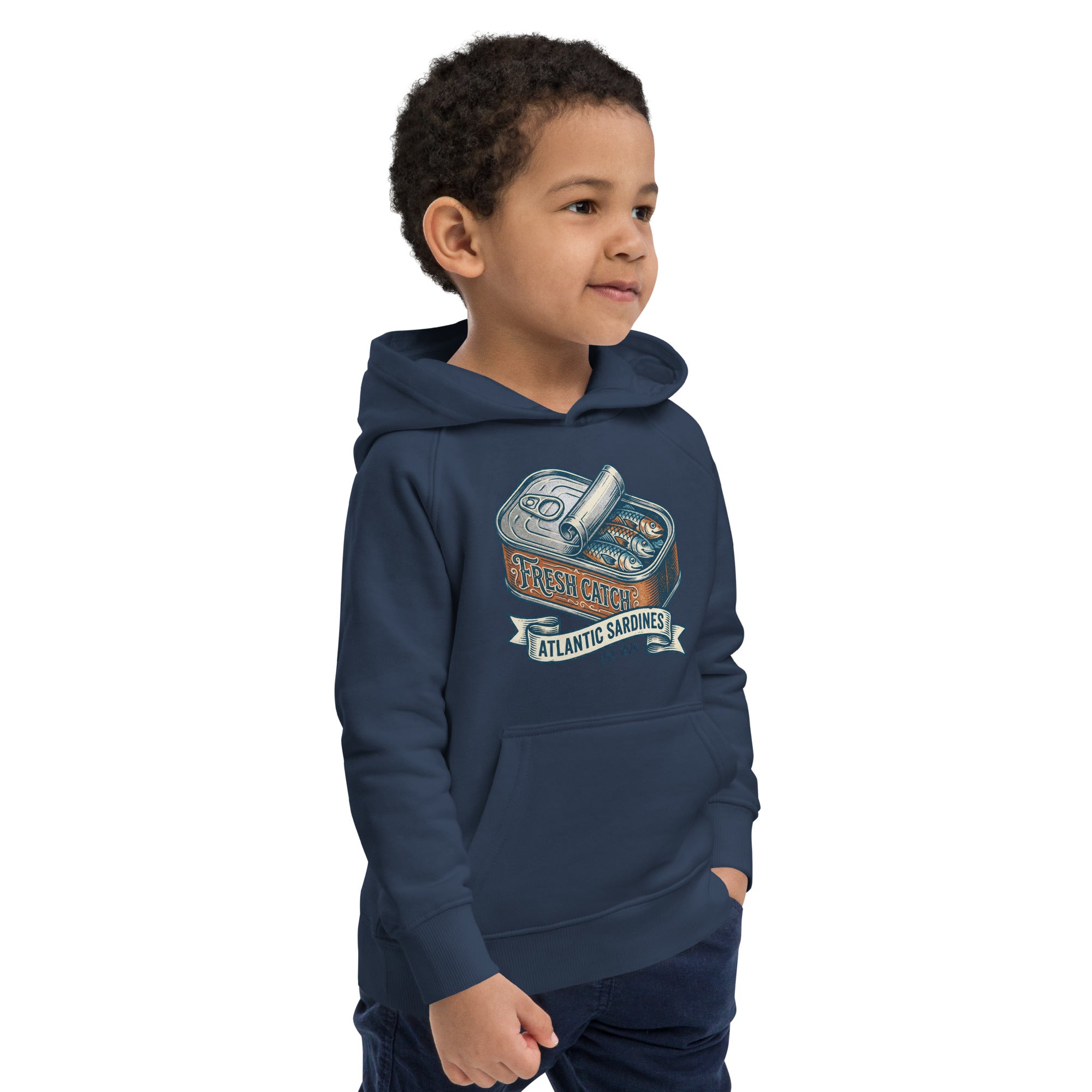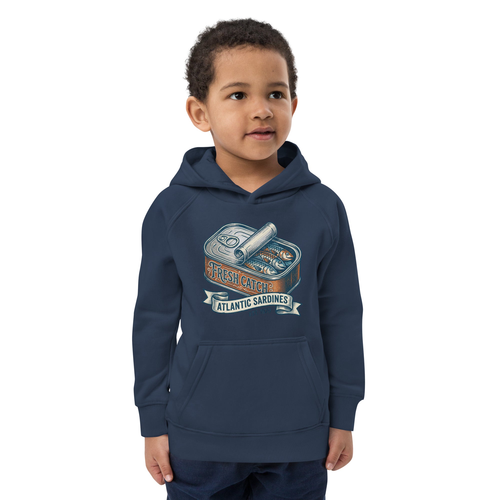 This kids' hoodie features a charming vintage-style illustration of an open sardine can, revealing three Atlantic sardines nestled inside. The can's label proudly displays 'FRESH CATCH' in an inviting script, while a banner below reads 'ATLANTIC SARDINES' in a clear, bold font. The design brings a touch of maritime whimsy to a cozy garment. Crafted for comfort, this hoodie is snug and soft, perfect for everyday adventures. With a lined hood for warmth and a convenient front pouch pocket, it's designed to keep your little one comfortable and stylish. It's an ideal choice for playful days, offering both supreme comfort and an eco-friendly statement in one soft Kids Eco-Friendly Hoodie.