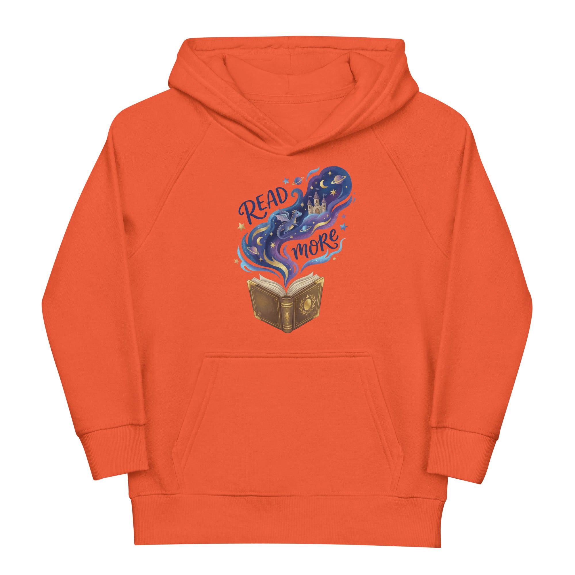 Encourage imagination with this captivating design featuring an open book from which a magical, starry realm unfurls. A fantastical castle, planets, moons, and a graceful dragon emerge from the pages, accompanied by the encouraging text 'READ more' in whimsical script. This premium quality hoodie is snug and soft to the touch, perfect for cozy adventures or everyday wear. Your little one will love the comfort and magic of this Kids Eco Hoodie.