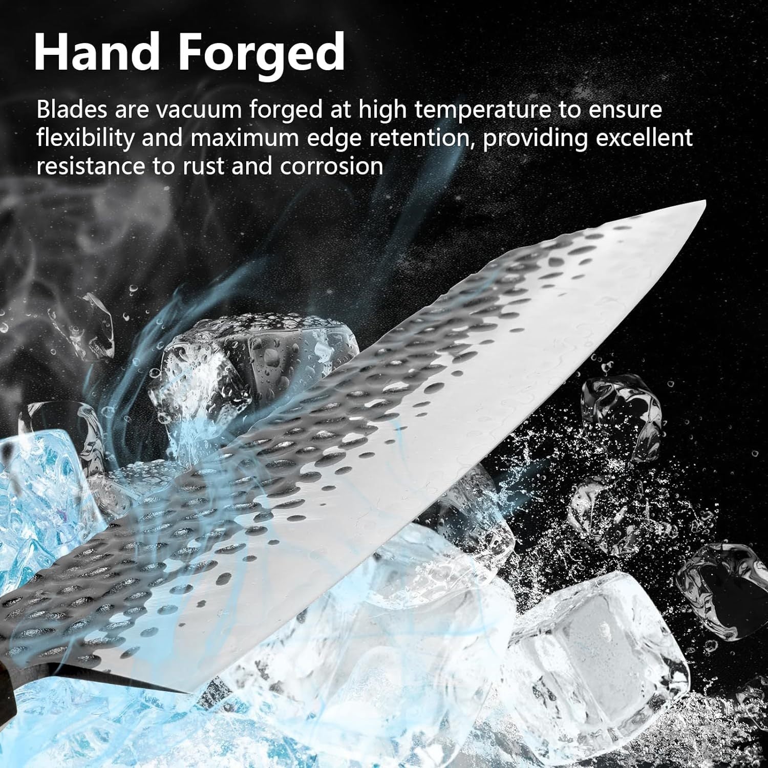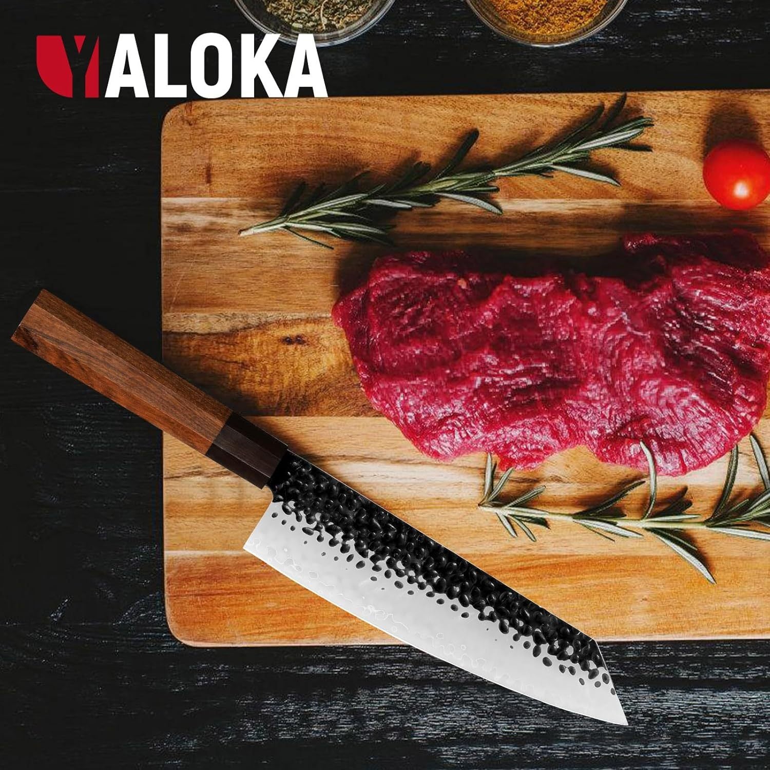 Experience precision cutting with this professional 8" Gyuto chef knife featuring a 3-layer 9Cr18MoV high-carbon steel blade, hand-hammered finish, and an octagonal rosewood handle for balanced control and lasting comfort. Vacuum heat-treated for superior edge retention (Rockwell 60+), the hammered surface reduces food sticking—perfect for slicing, dicing, chopping meat, fish, vegetables and fruit.