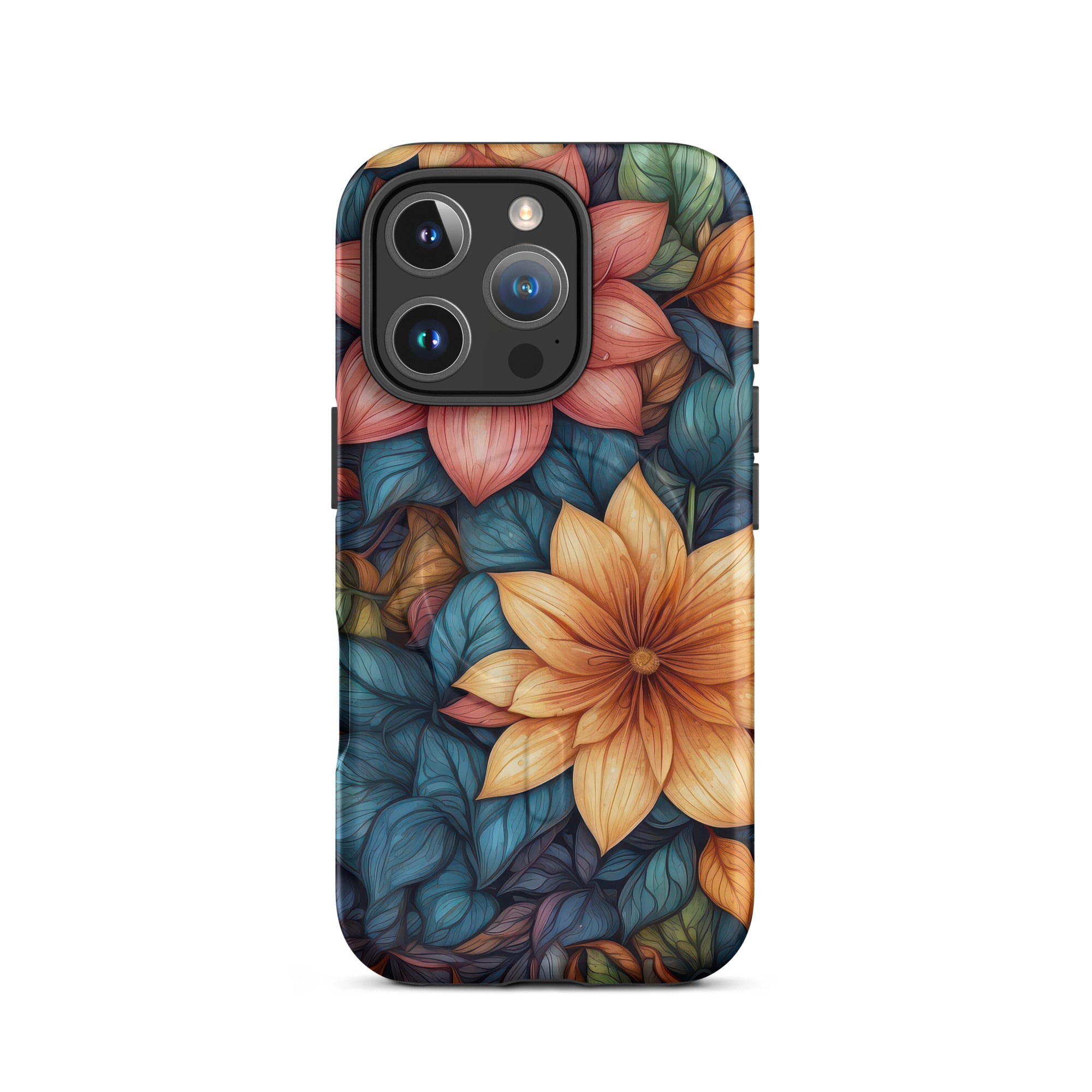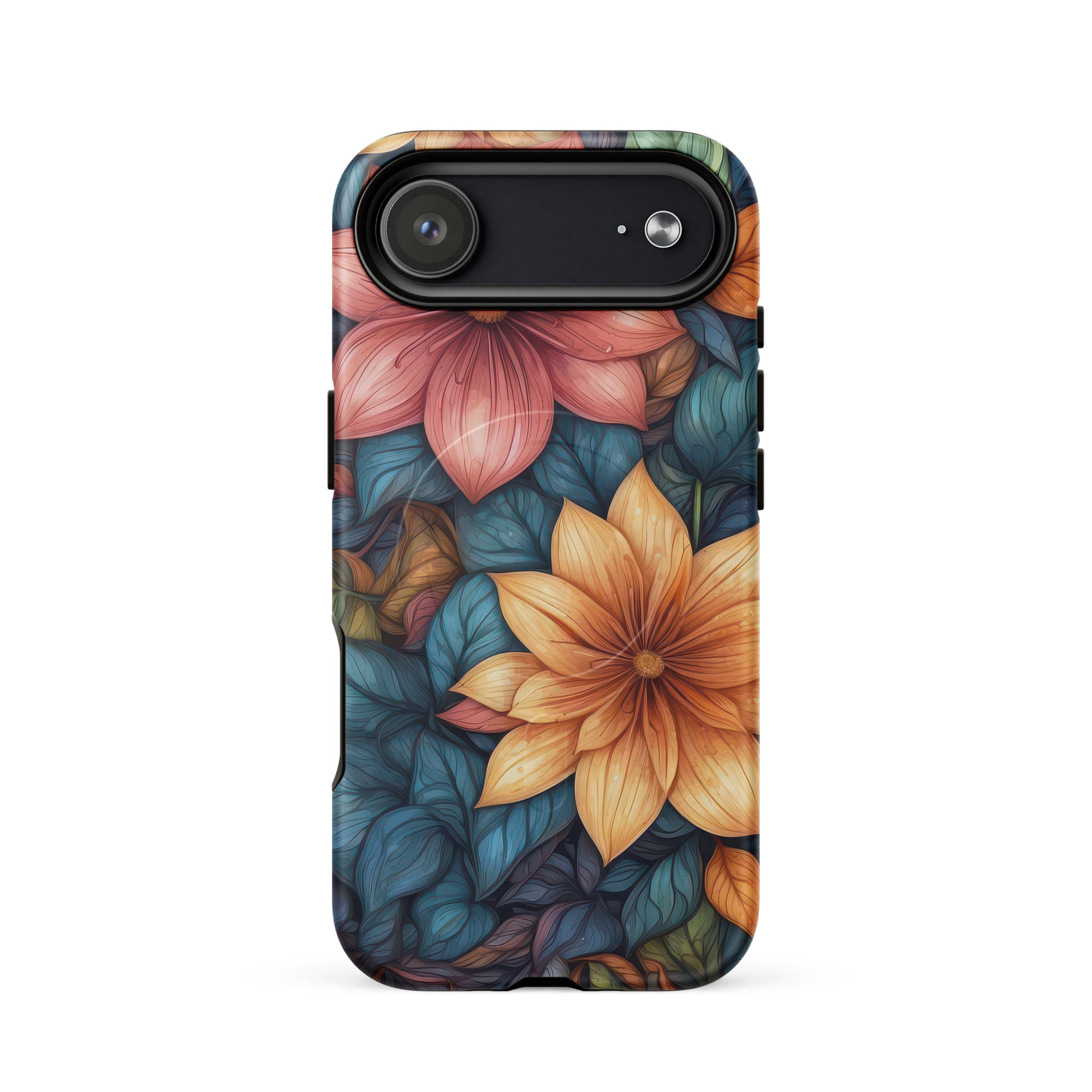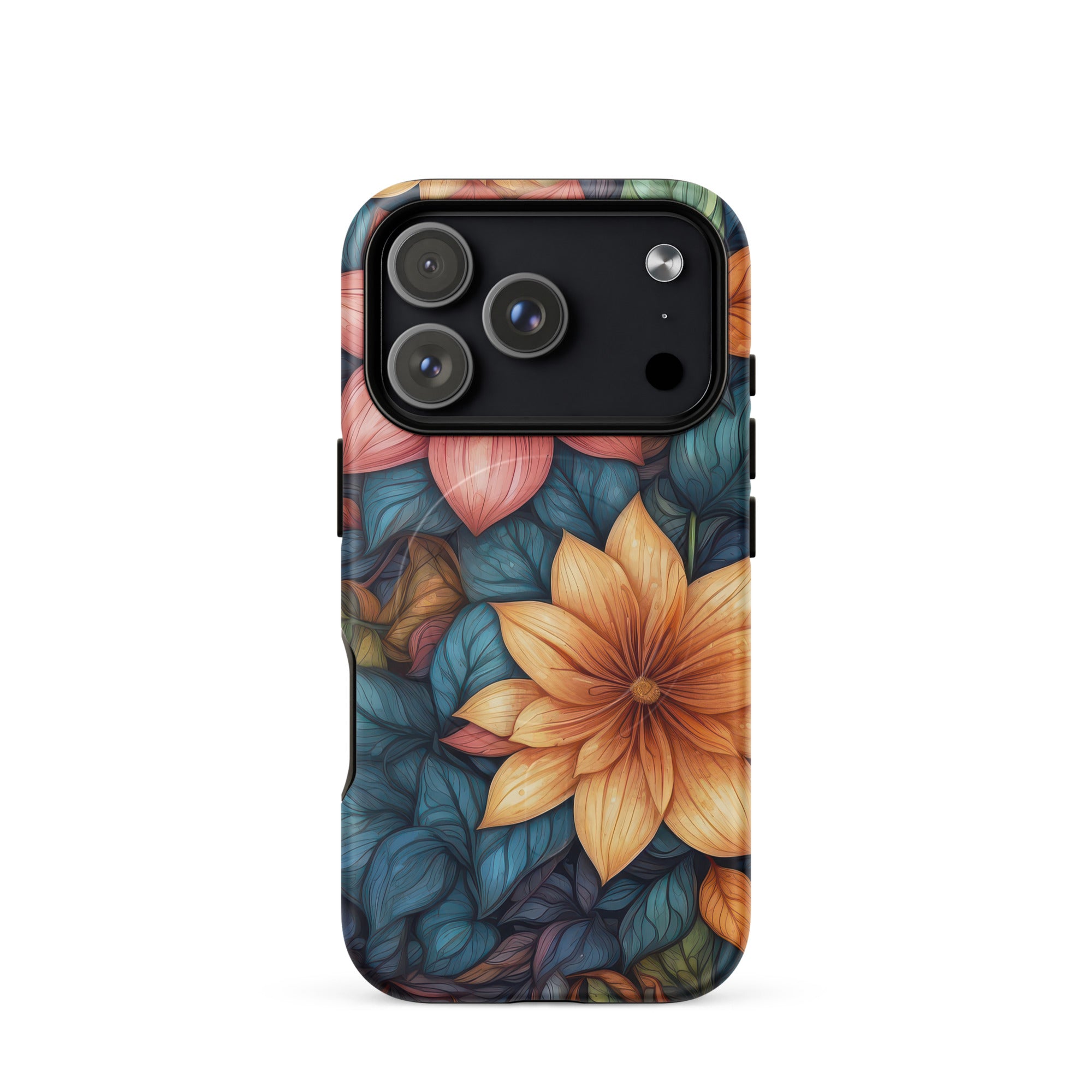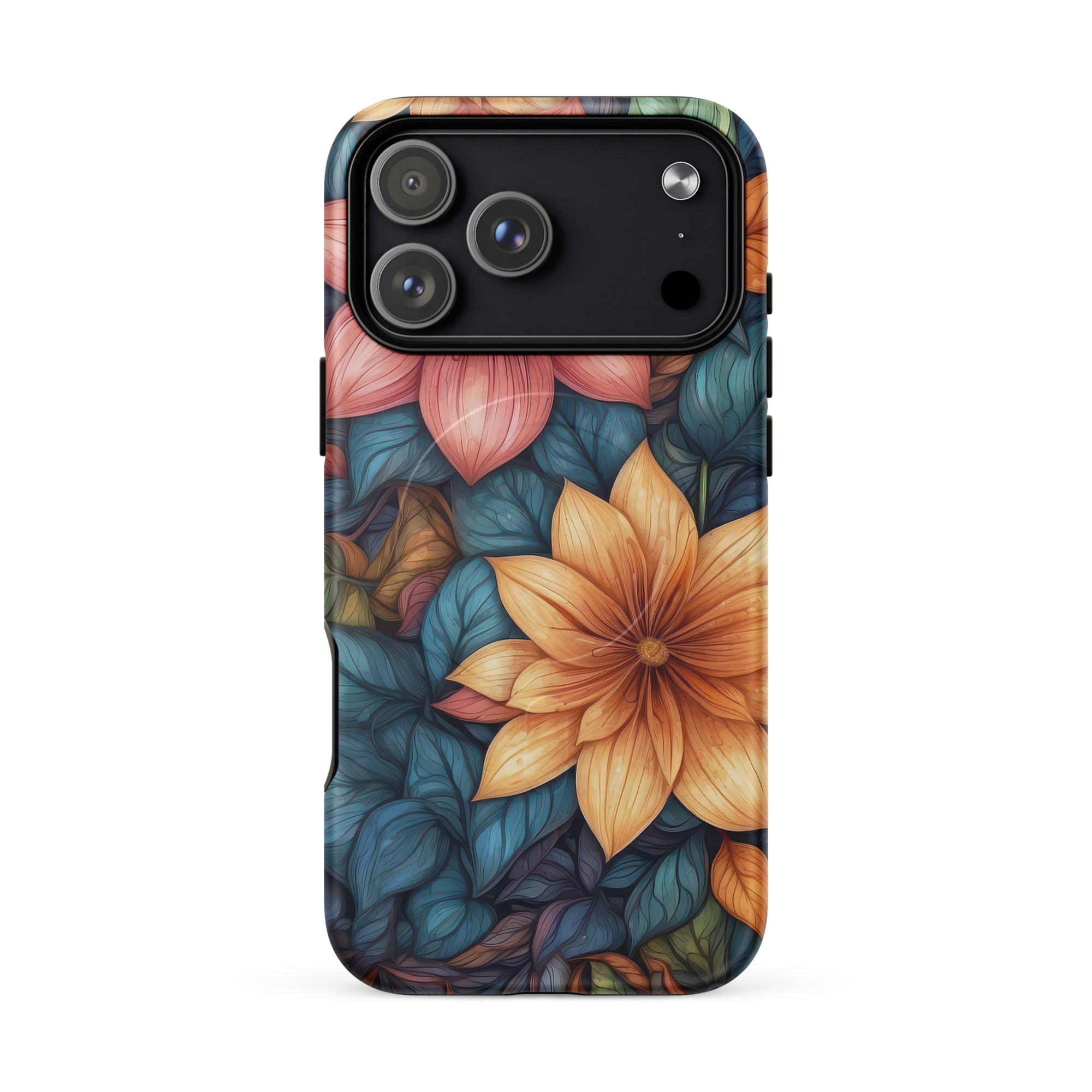 This stunning case features a dense, layered tapestry of stylized flowers in warm terracotta and burnt orange, beautifully contrasted by deep teal and muted green leaves. The rich, earthy palette evokes an elegant autumnal mood, perfect for those who appreciate sophisticated botanical designs. Its robust yet ergonomic design feels secure in hand, offering a chic accessory for any fashion-forward individual. Enjoy dependable dual-layer defense with this MagSafe® Tough Case for iPhone®.