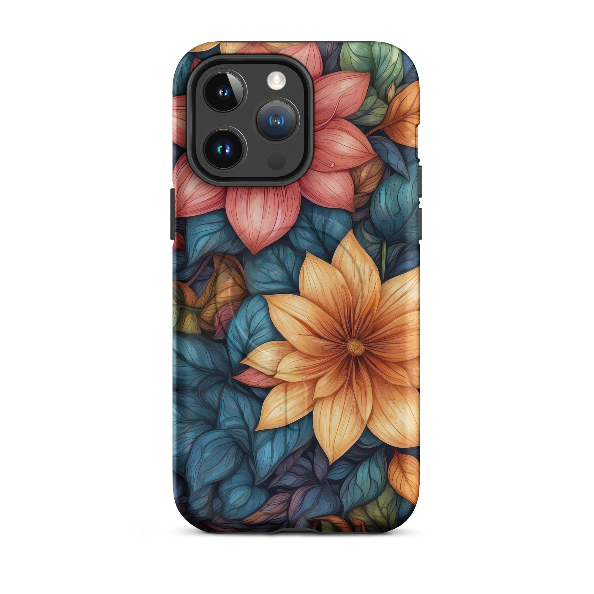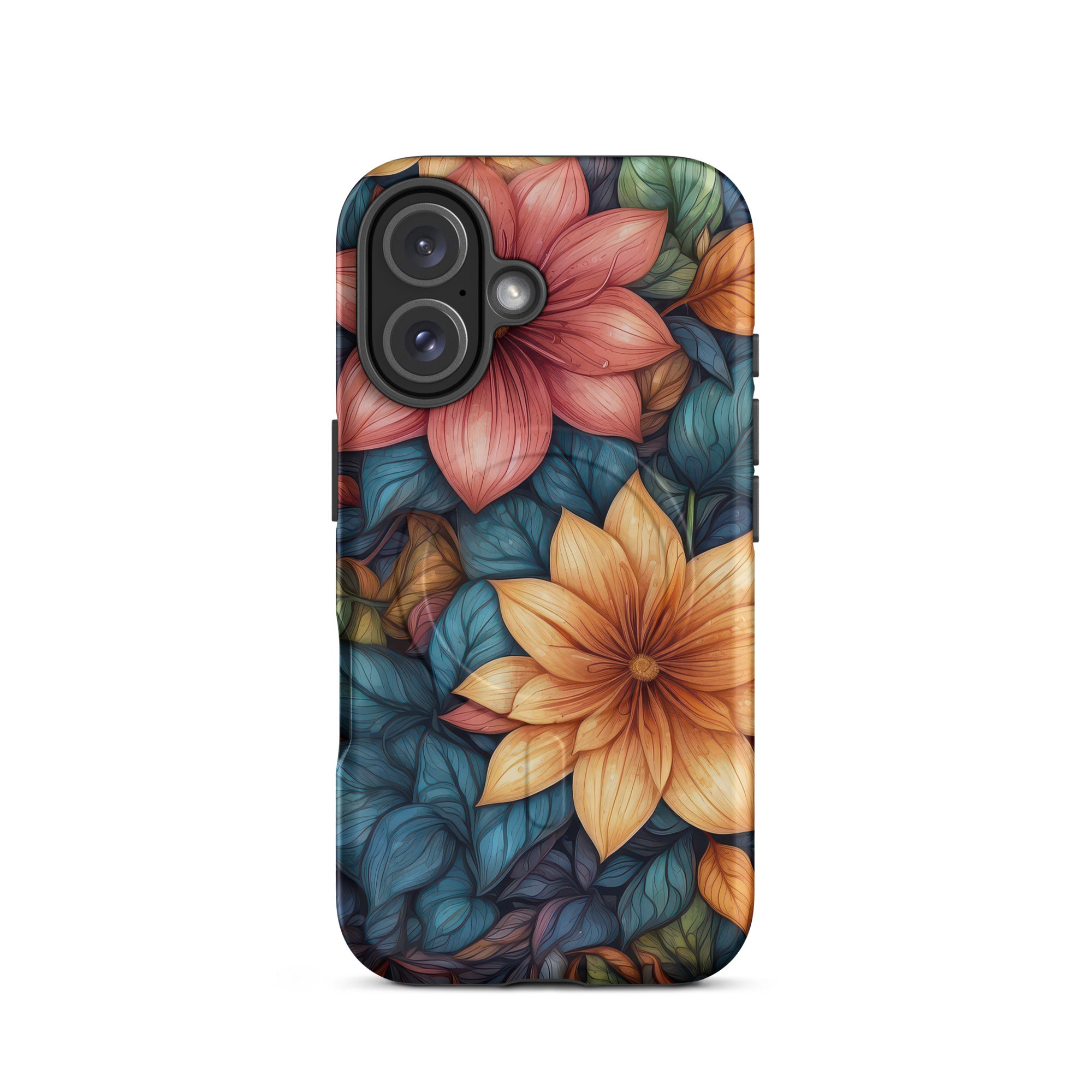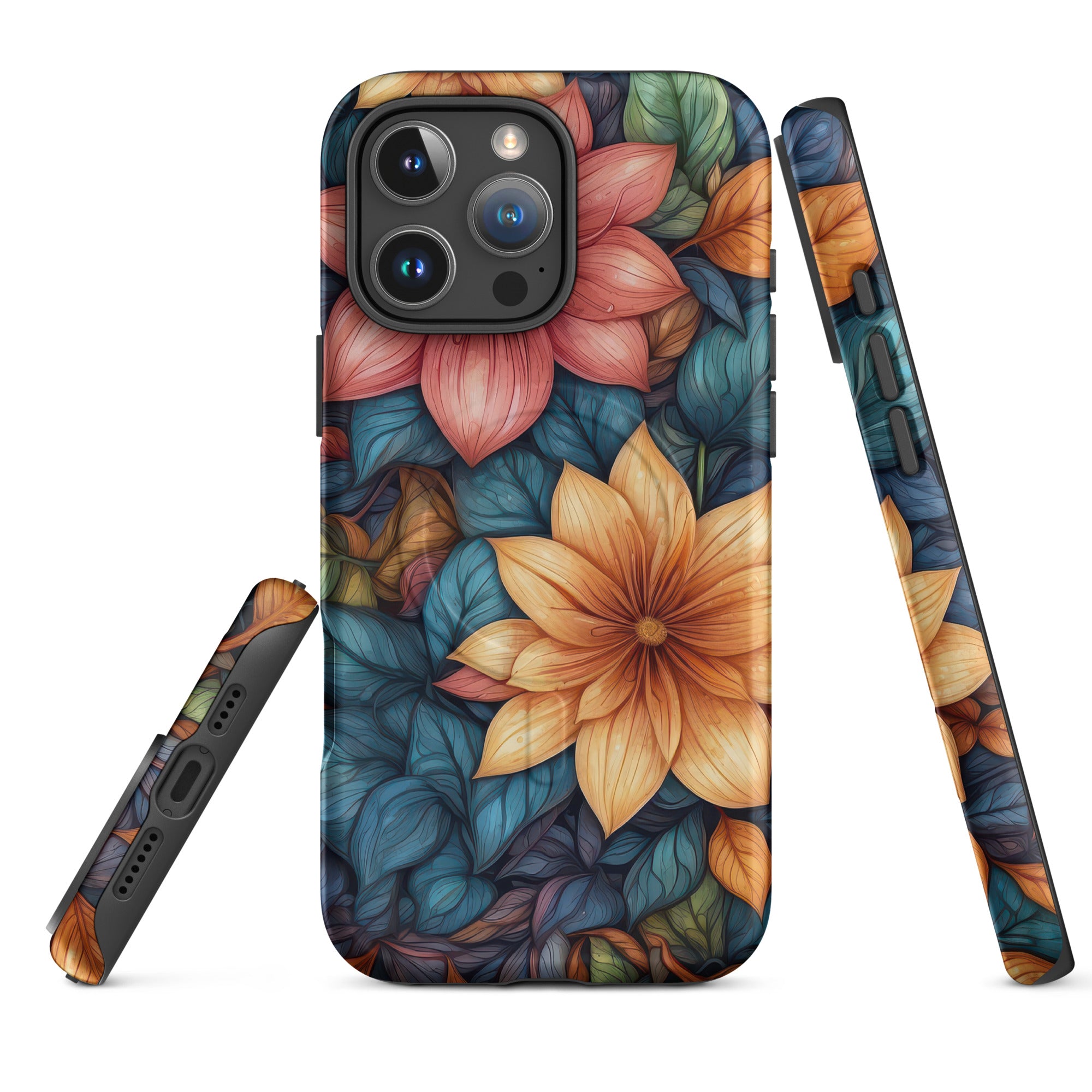 This stunning case features a dense, layered tapestry of stylized flowers in warm terracotta and burnt orange, beautifully contrasted by deep teal and muted green leaves. The rich, earthy palette evokes an elegant autumnal mood, perfect for those who appreciate sophisticated botanical designs. Its robust yet ergonomic design feels secure in hand, offering a chic accessory for any fashion-forward individual. Enjoy dependable dual-layer defense with this MagSafe® Tough Case for iPhone®.