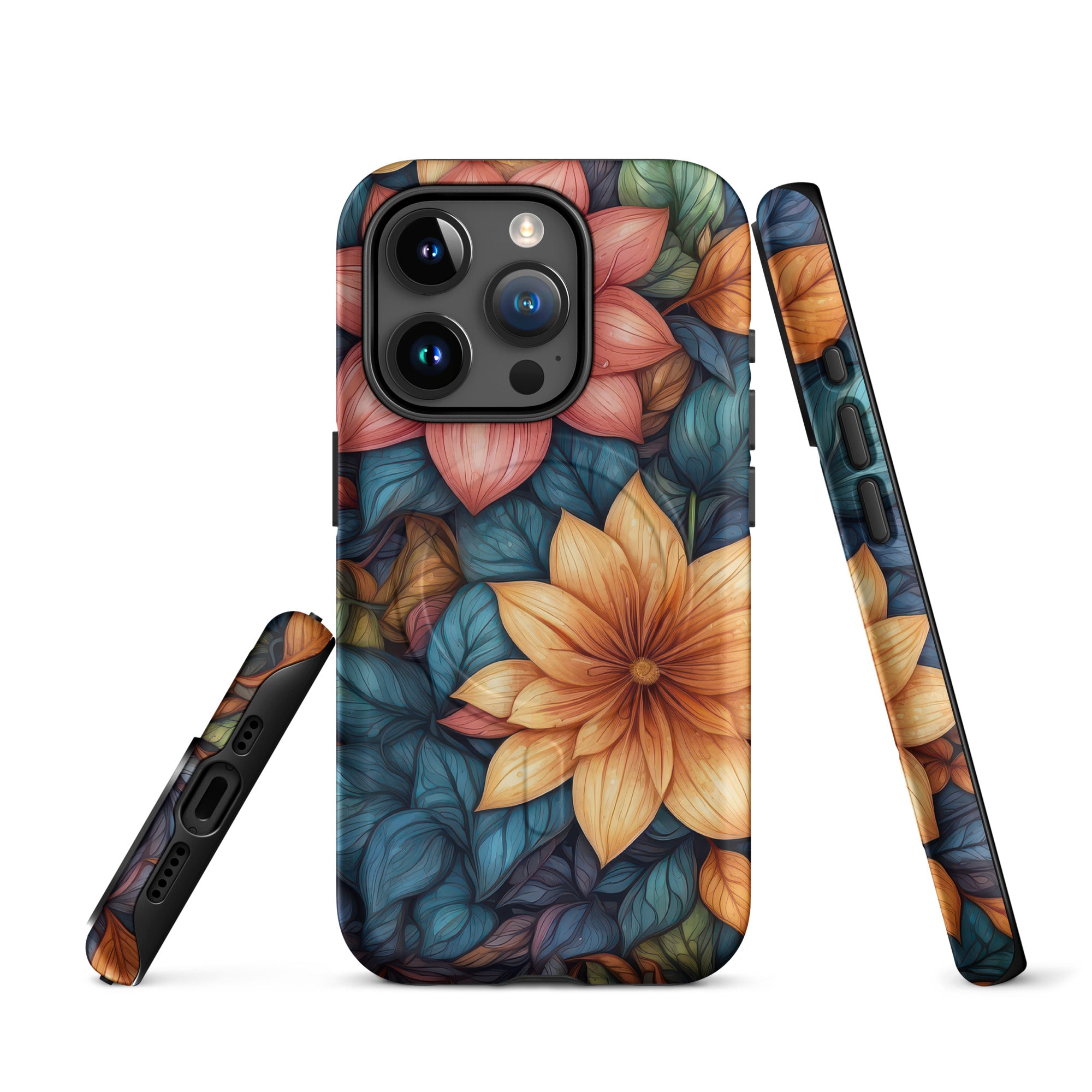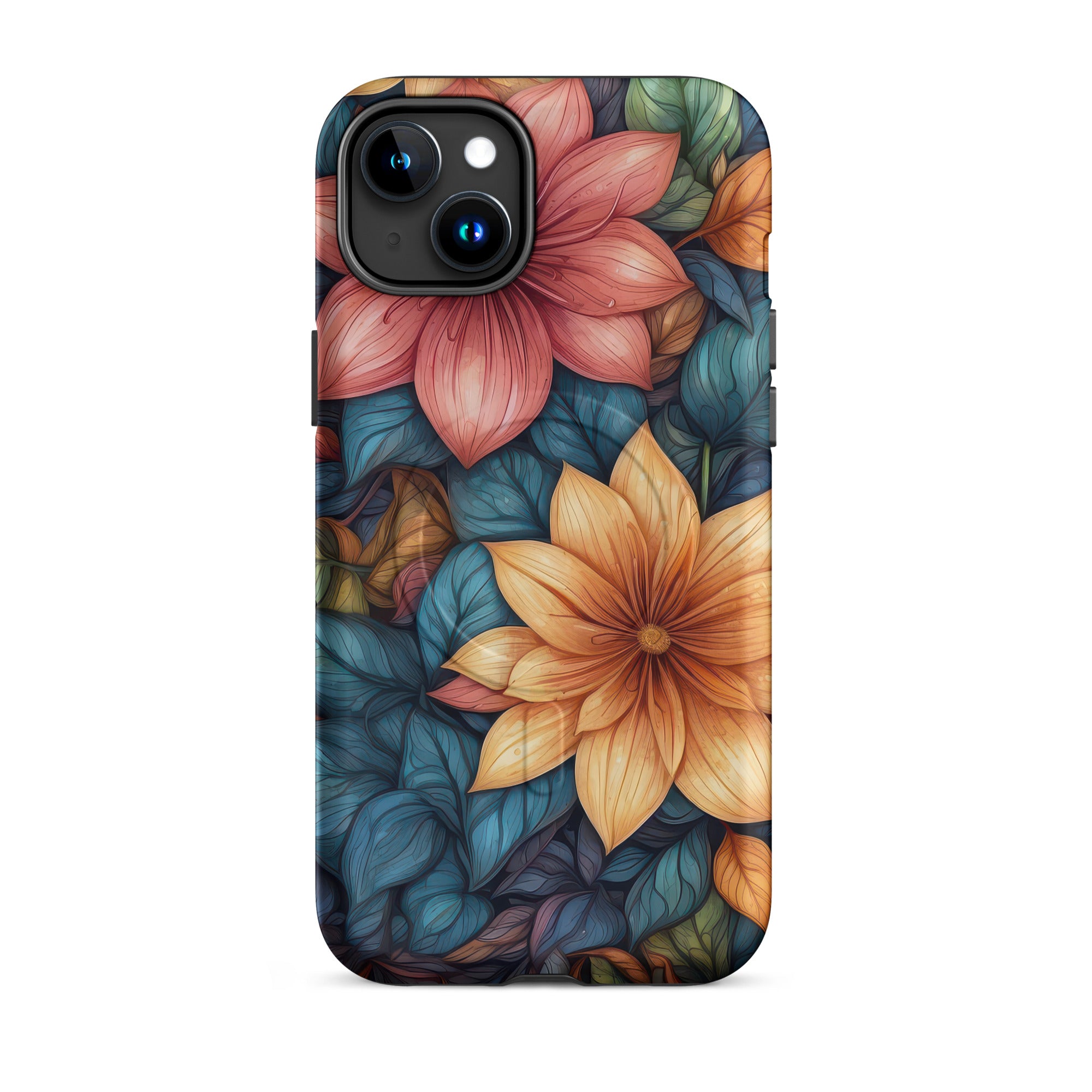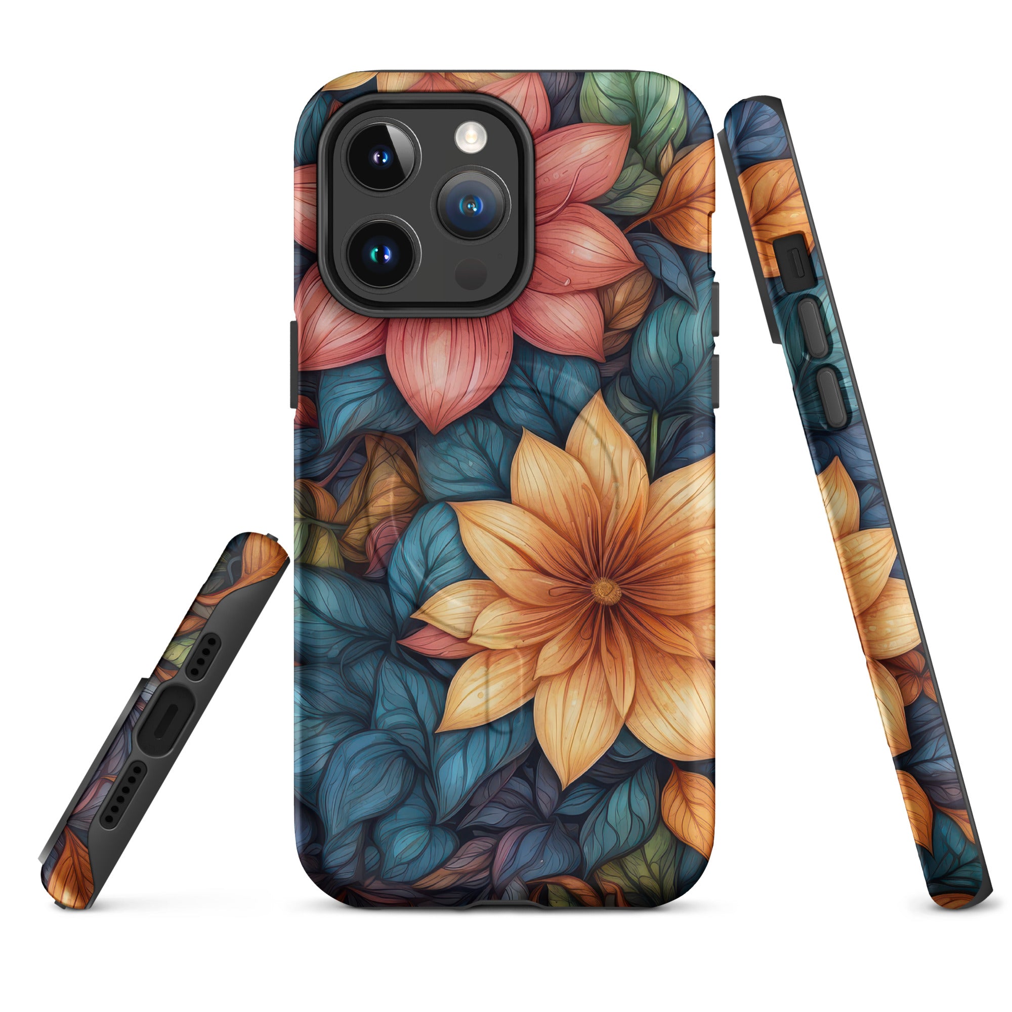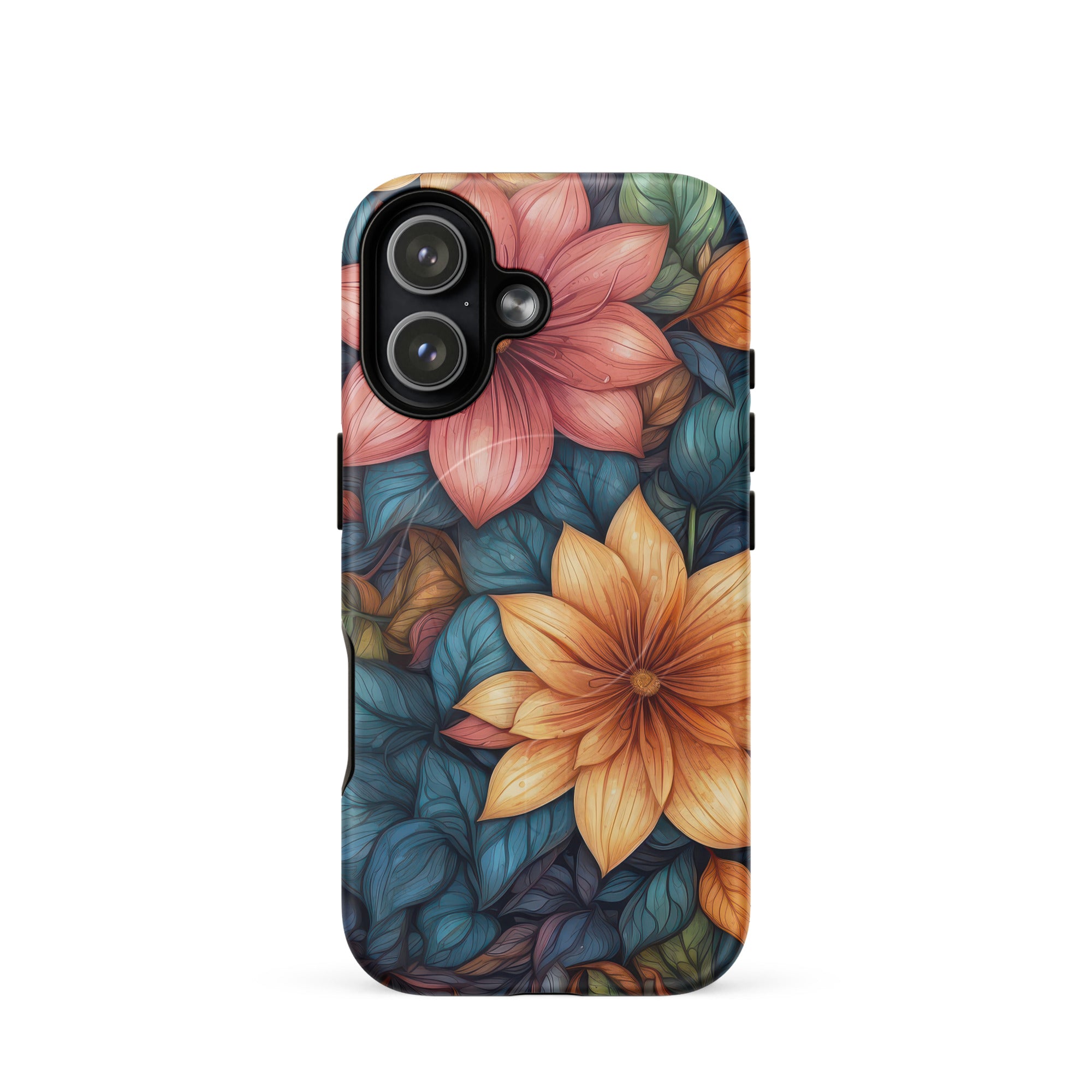 This stunning case features a dense, layered tapestry of stylized flowers in warm terracotta and burnt orange, beautifully contrasted by deep teal and muted green leaves. The rich, earthy palette evokes an elegant autumnal mood, perfect for those who appreciate sophisticated botanical designs. Its robust yet ergonomic design feels secure in hand, offering a chic accessory for any fashion-forward individual. Enjoy dependable dual-layer defense with this MagSafe® Tough Case for iPhone®.