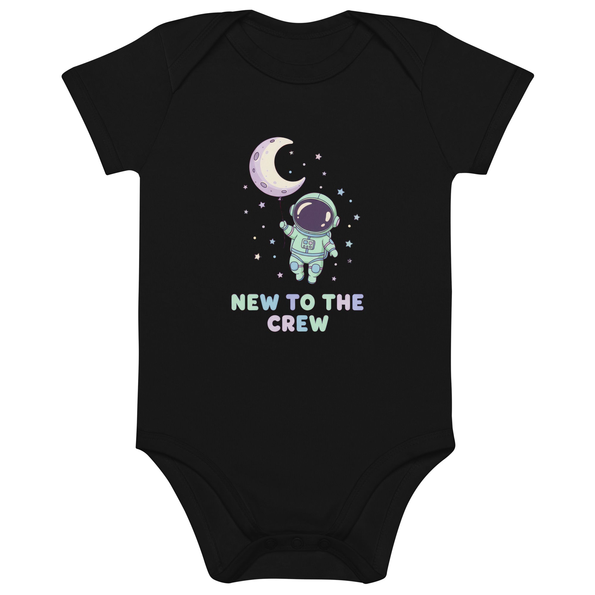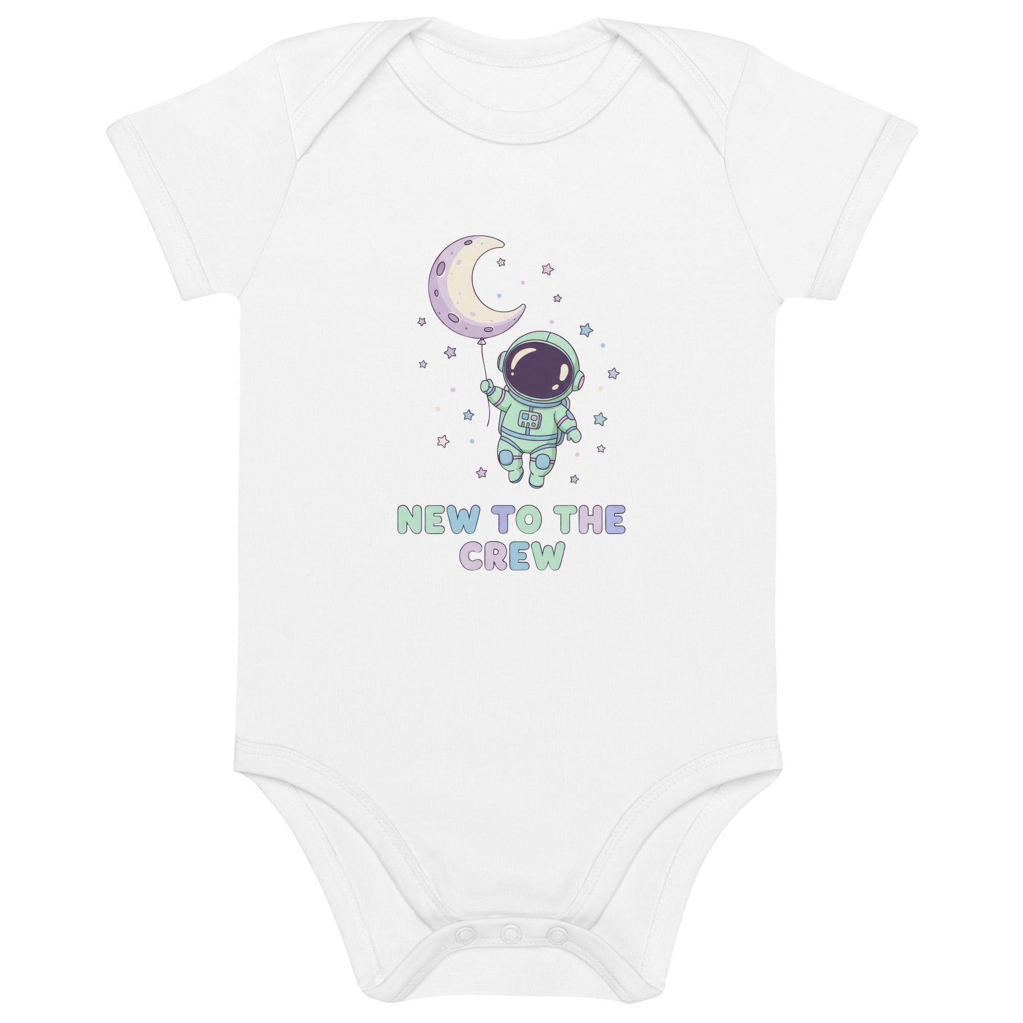 Introduce your little one to the world with this adorable bodysuit featuring a charming pastel illustration of a friendly astronaut holding a crescent moon like a balloon, surrounded by twinkling stars. The playful message 'NEW TO THE CREW' is printed below in a soft, gradient font, creating a whimsical space-themed look. Made from soft organic cotton, this bodysuit is designed for utmost comfort and is perfect for any new addition to the family, offering a snug yet flexible fit for all their cosmic adventures.