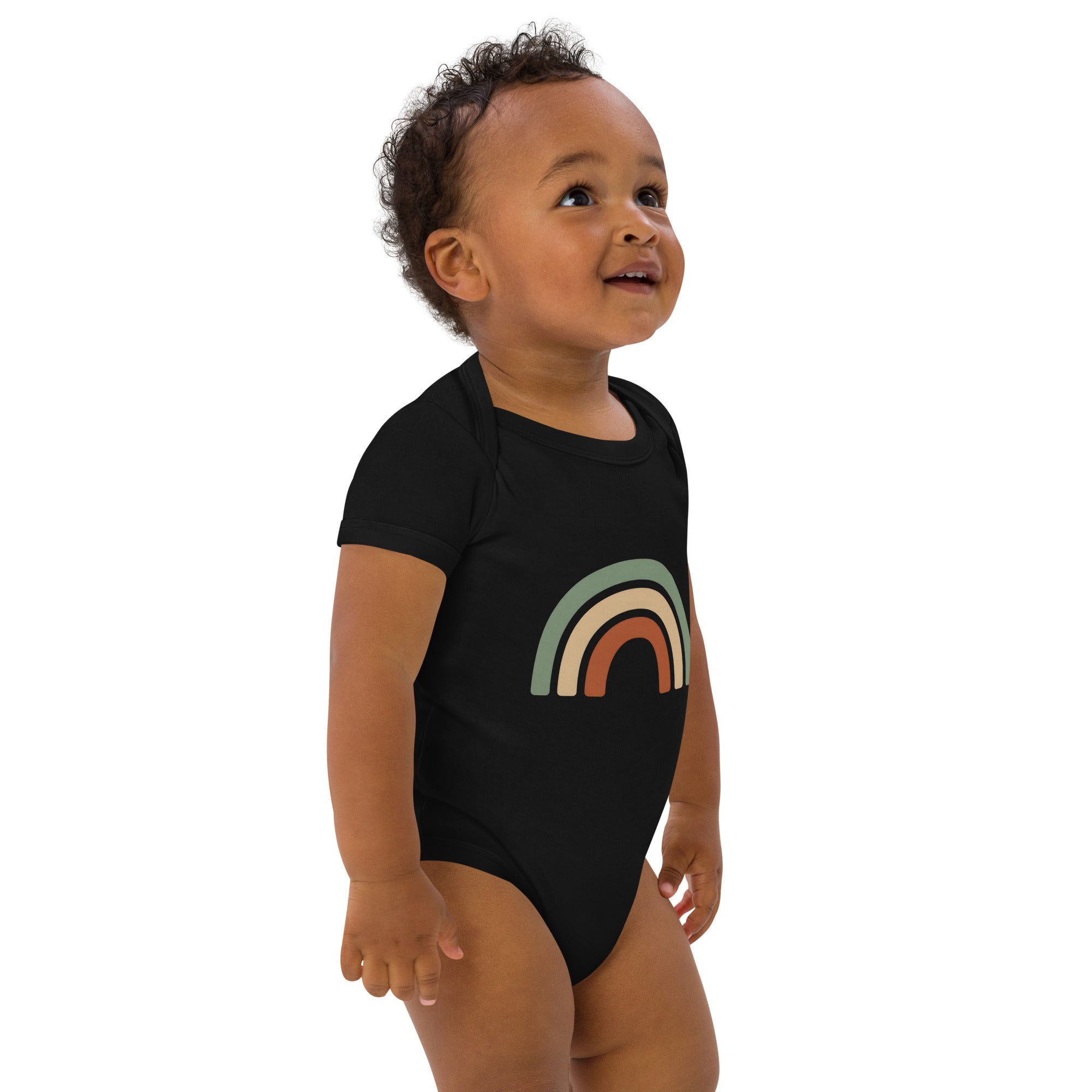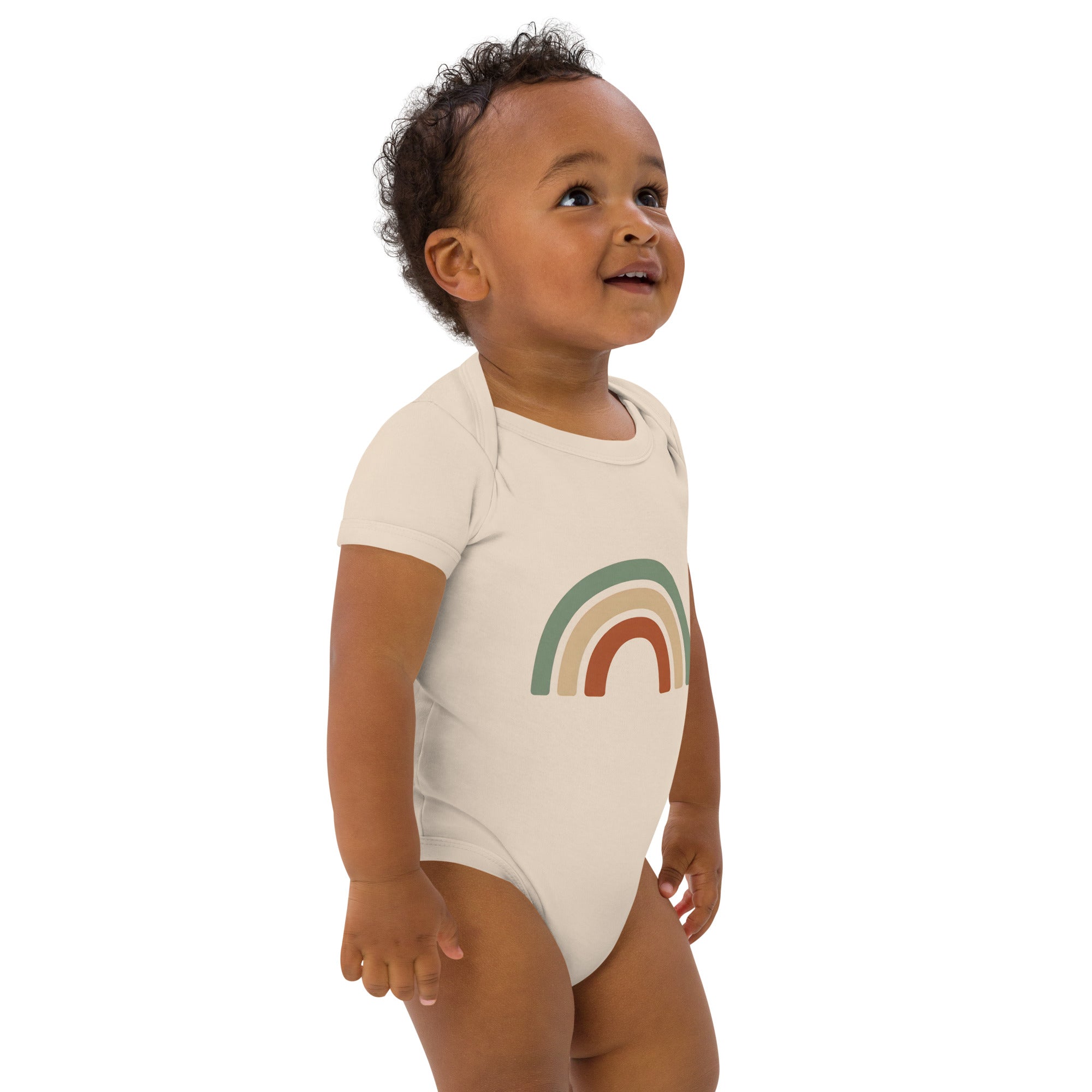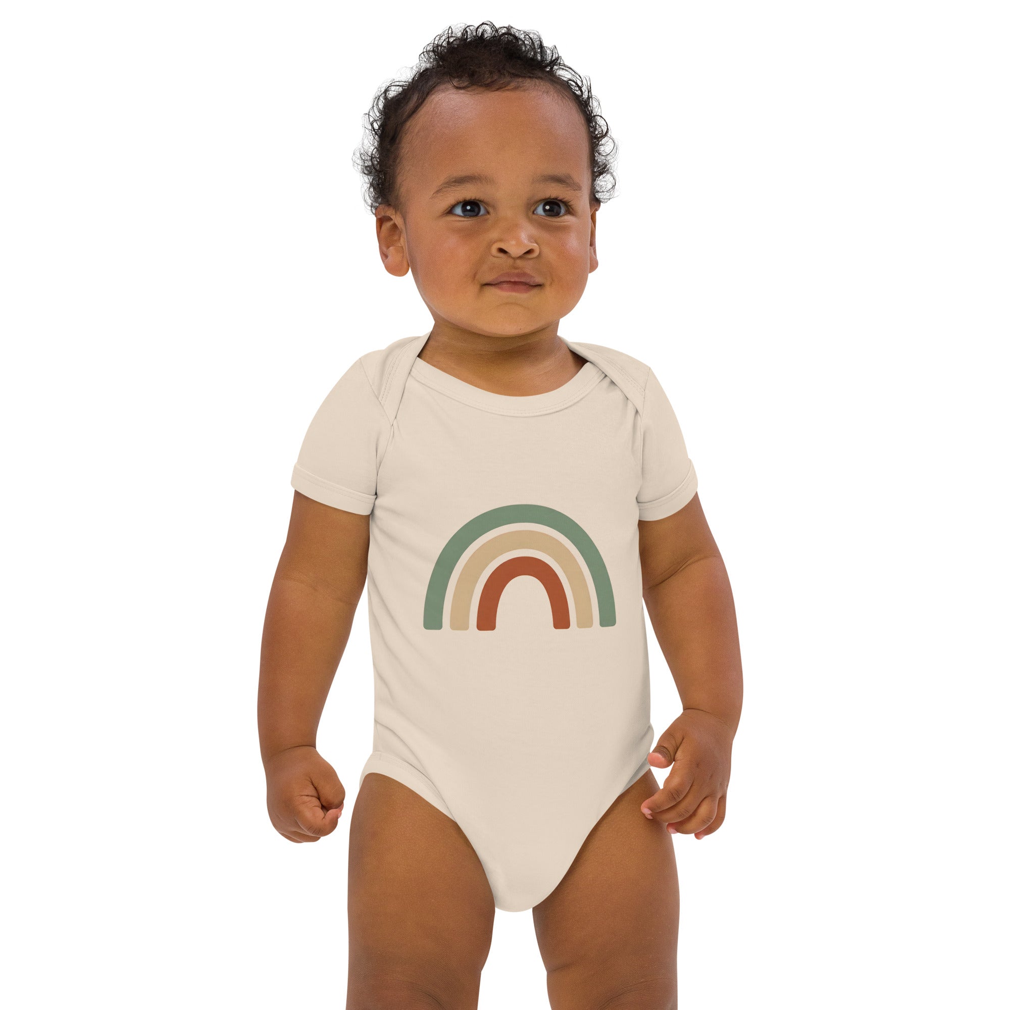 Featuring a charming minimalist rainbow design, this baby bodysuit showcases three elegantly curved arches in a palette of sage green, light tan, and burnt orange, creating a warm and earthy aesthetic. The simple yet striking graphic brings a touch of bohemian style to your little one's wardrobe, perfect for daily wear. Your baby will love the soft feel of this comfortable organic cotton baby bodysuit.
