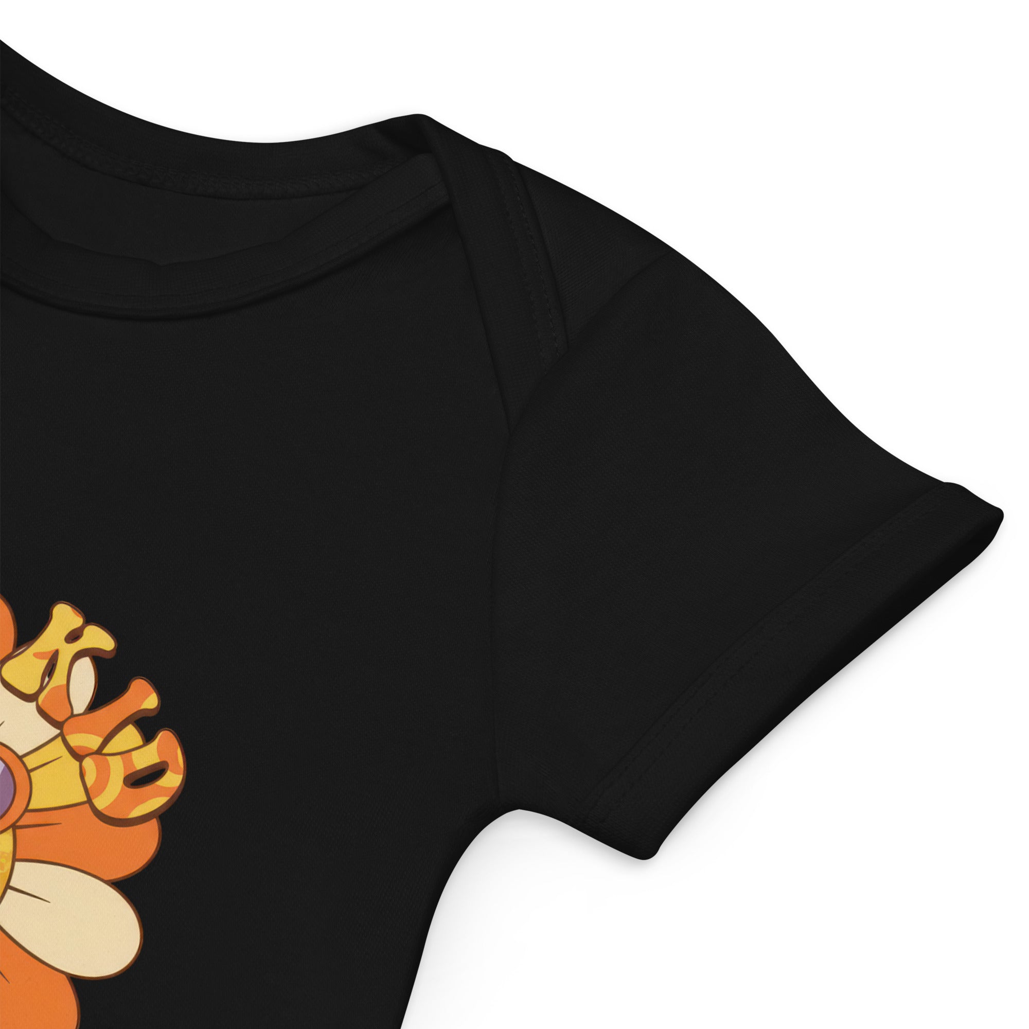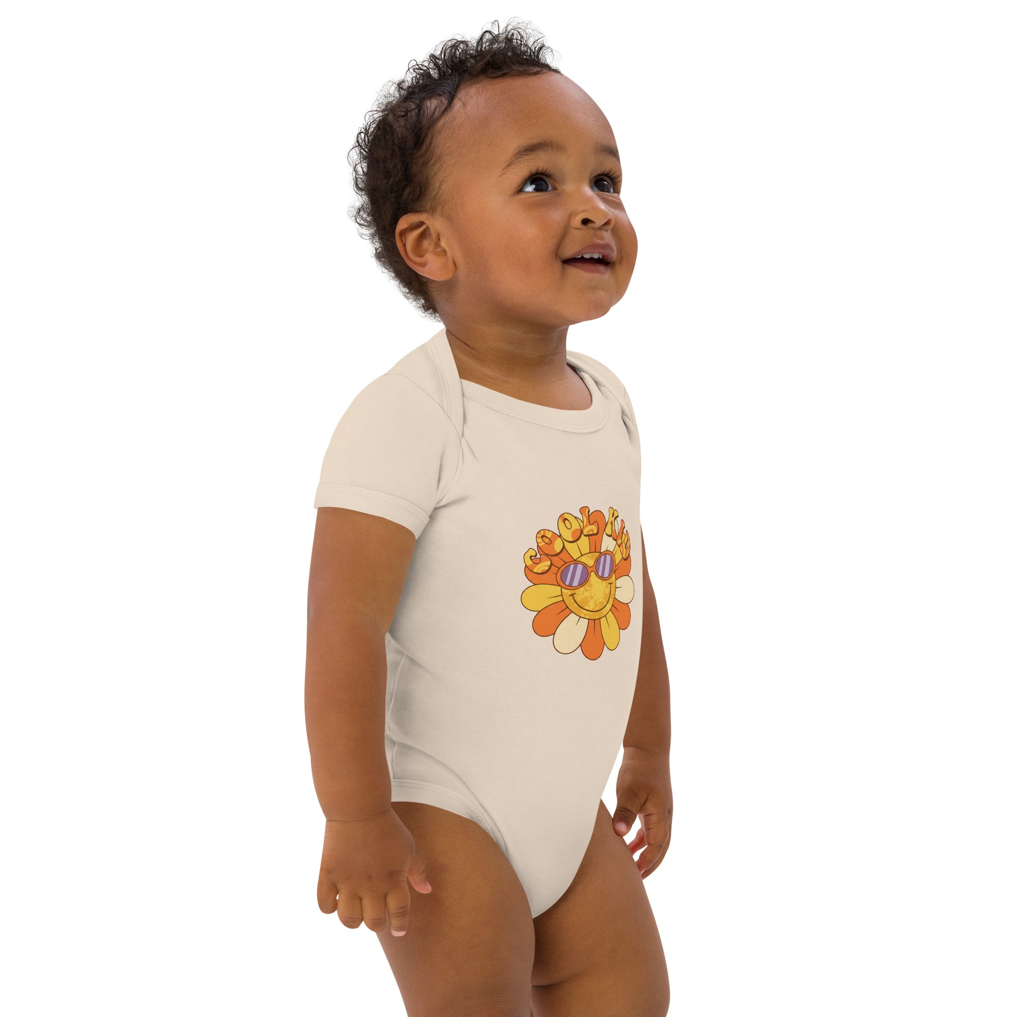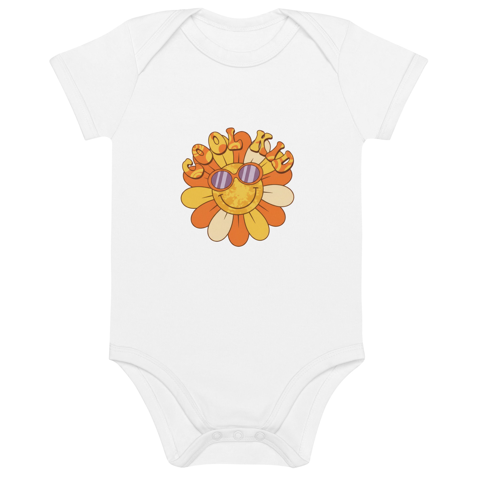 This vibrant, retro-inspired baby bodysuit features a cheerfully smiling sun character wearing cool purple sunglasses, surrounded by multi-toned petals in warm orange, yellow, and cream hues. Above the sun, the playful, wavy text proudly displays 'SOAK UP THE SUN'. Crafted from 100% organic cotton, this short-sleeve bodysuit offers exceptional softness and breathability, designed for comfort and ease of changing with its lap shoulders and three snap closures. It's gentle on delicate skin, making it perfect for daily wear or sunny adventures, ensuring maximum comfort in this Organic Cotton Baby Bodysuit.