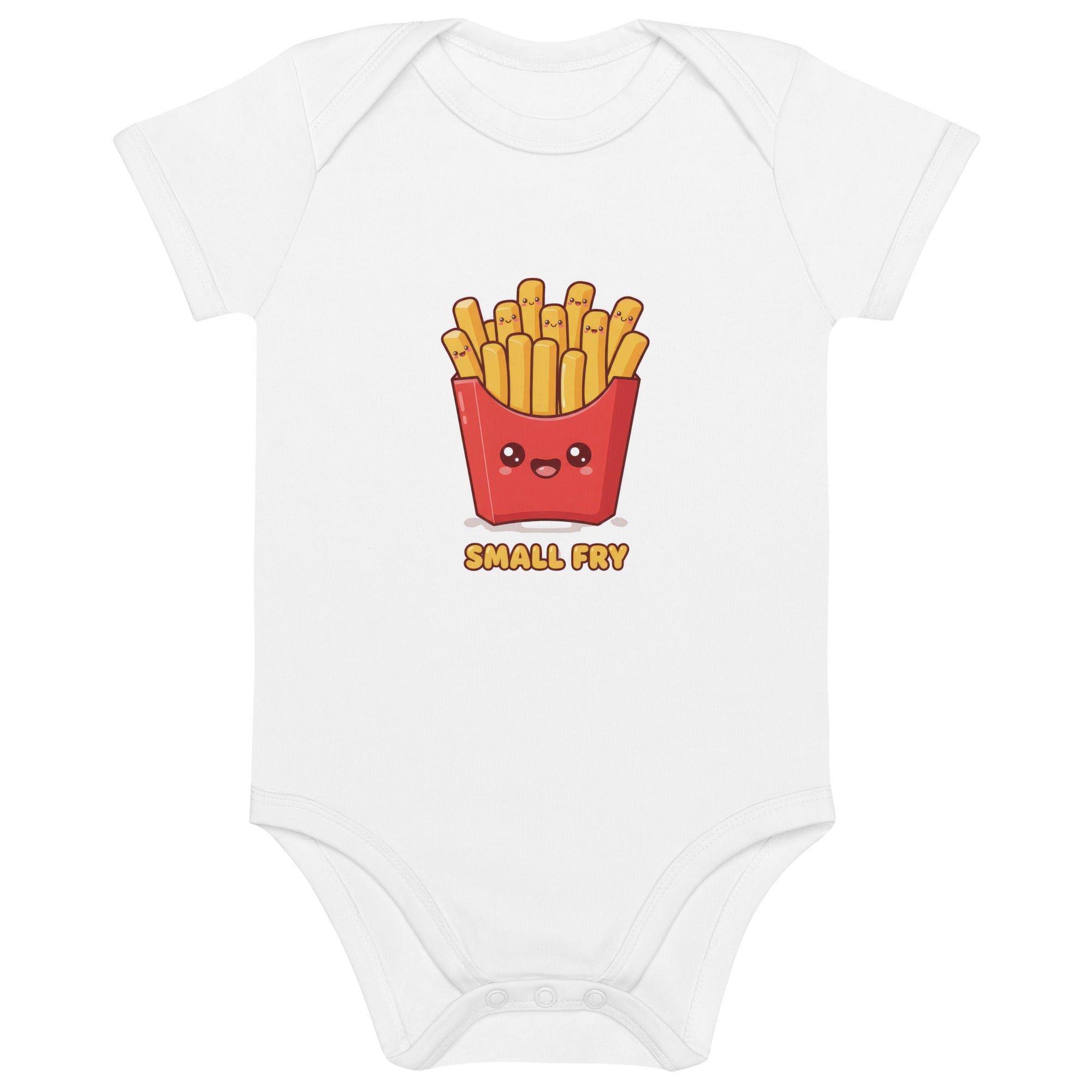 The design showcases an adorable red carton filled with cheerful, smiling french fries, accompanied by the playful text 'SMALL FRY' in a bold yellow font. This delightful print adds a touch of whimsy and humor, perfect for any little one. Crafted for ultimate comfort, this bodysuit offers a soft and gentle feel against delicate skin and is ideal for everyday adventures. Enjoy the gentle touch and breathability of this Organic Cotton Baby Bodysuit.