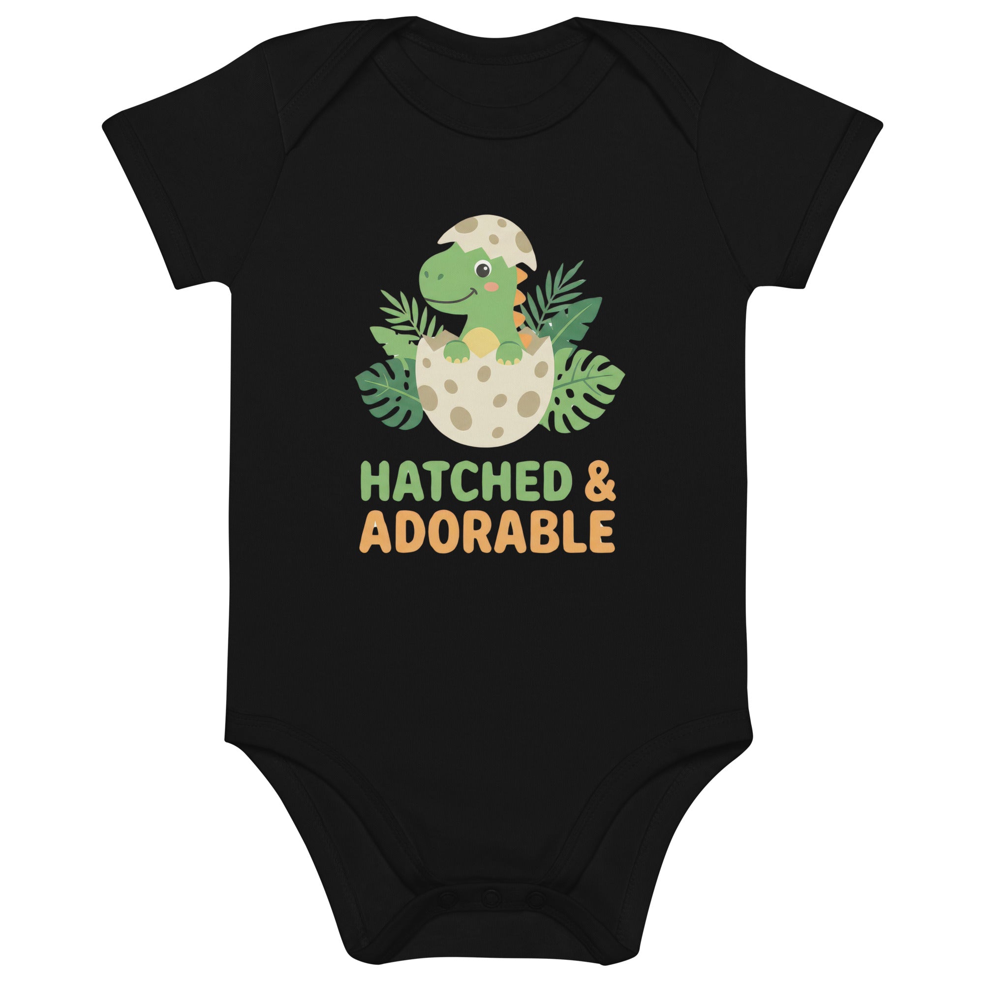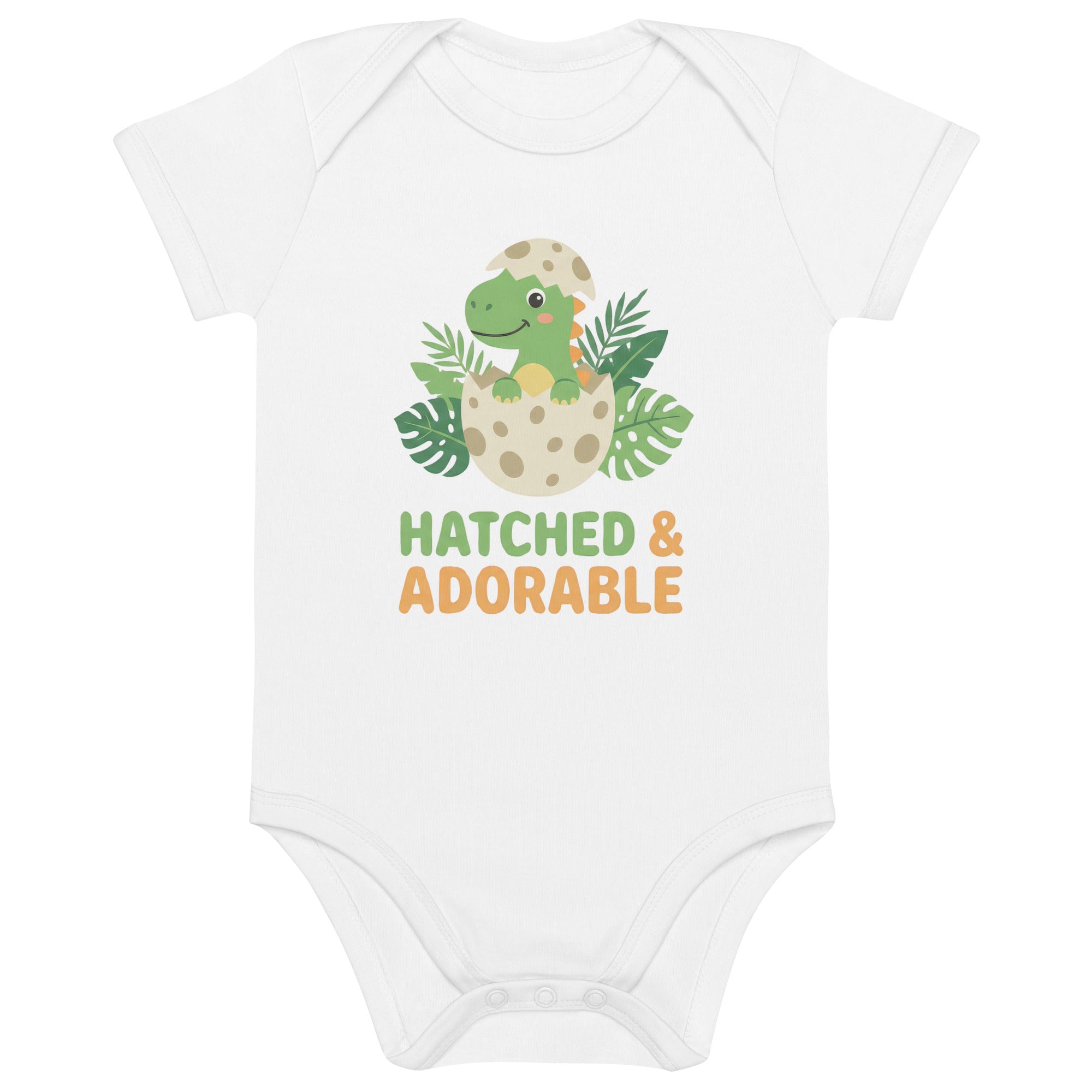 Celebrate your little one's arrival with this super cute baby bodysuit featuring a cartoon green dinosaur happily hatching from a spotted egg, surrounded by lush tropical leaves. Below the adorable illustration, the playful text 'HATCHED & ADORABLE' is printed in matching green and orange hues, adding a charming touch. This sweet design captures the joy of new beginnings, making it perfect for your little bundle of joy. Crafted for softness and ease, this comfortable Organic Cotton Baby Bodysuit is ideal for everyday adventures.