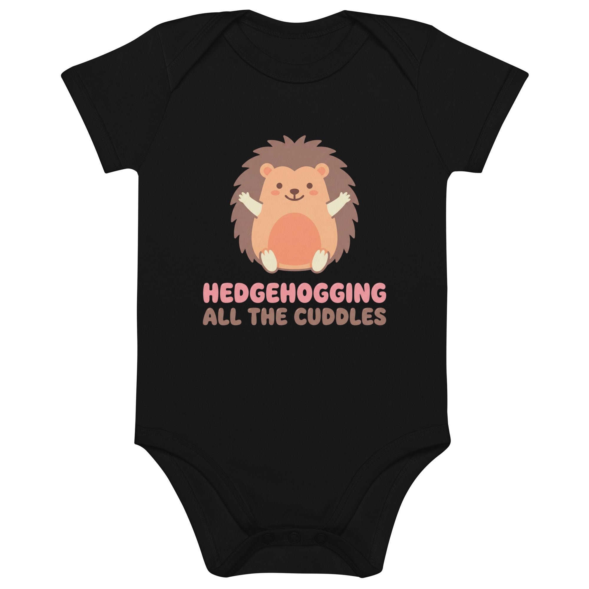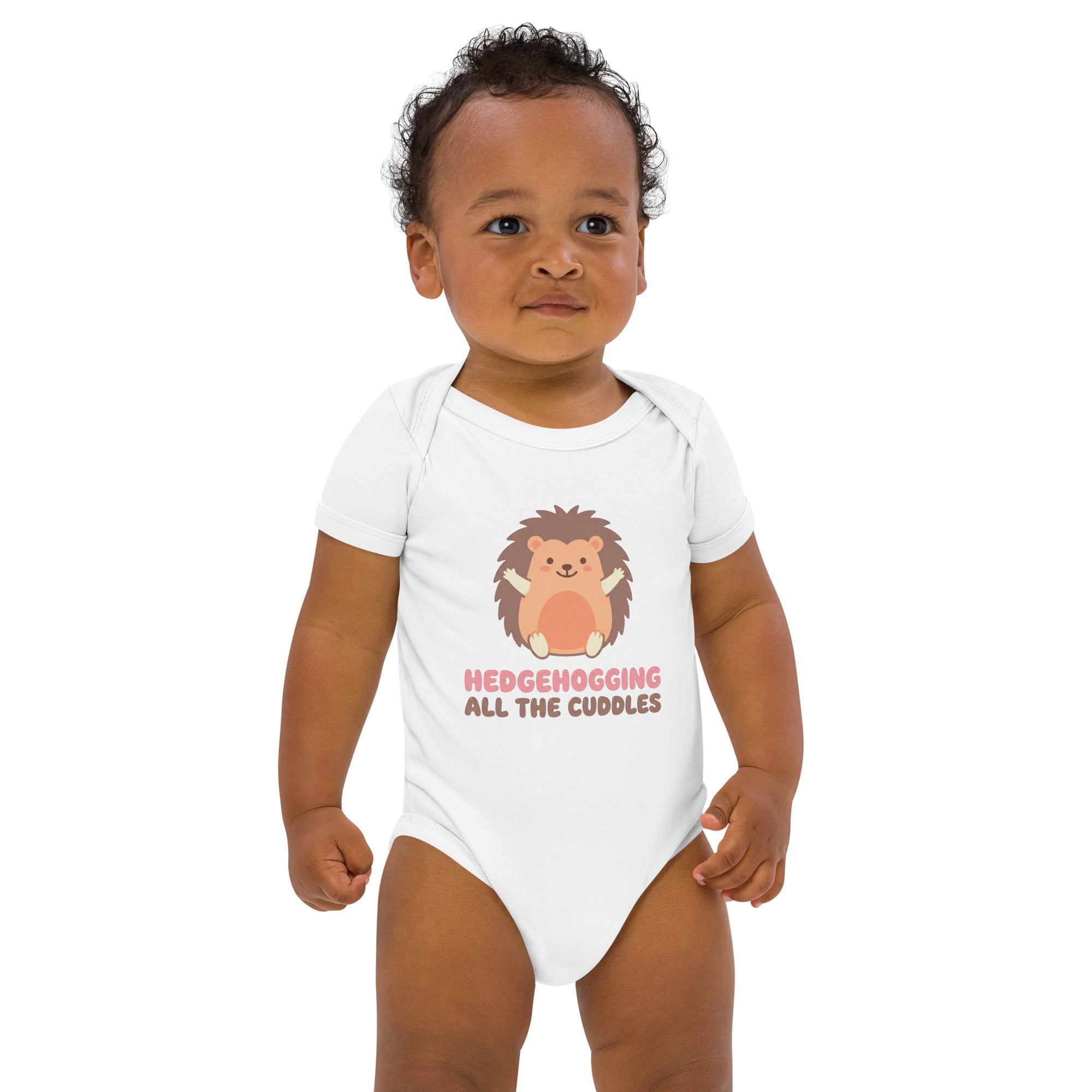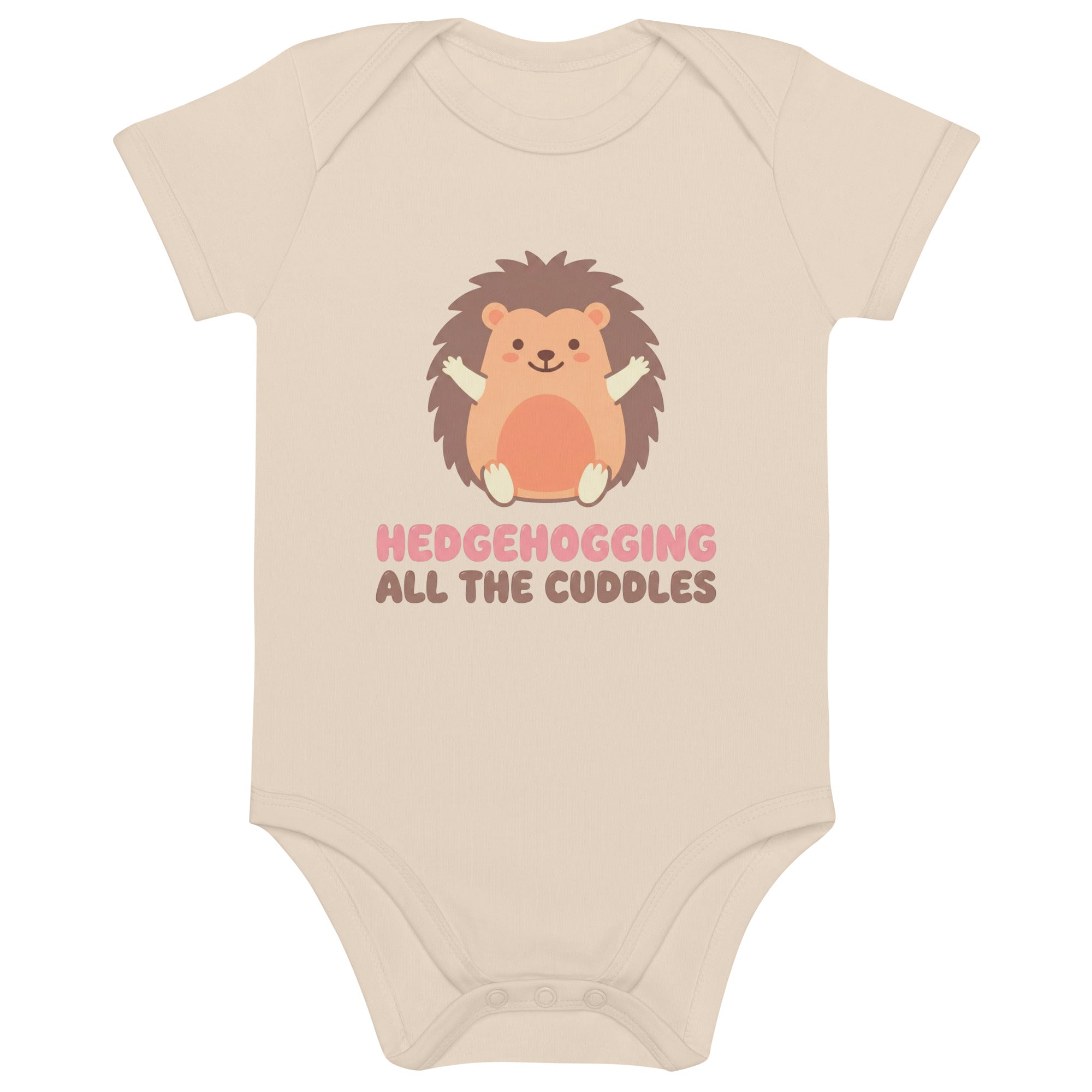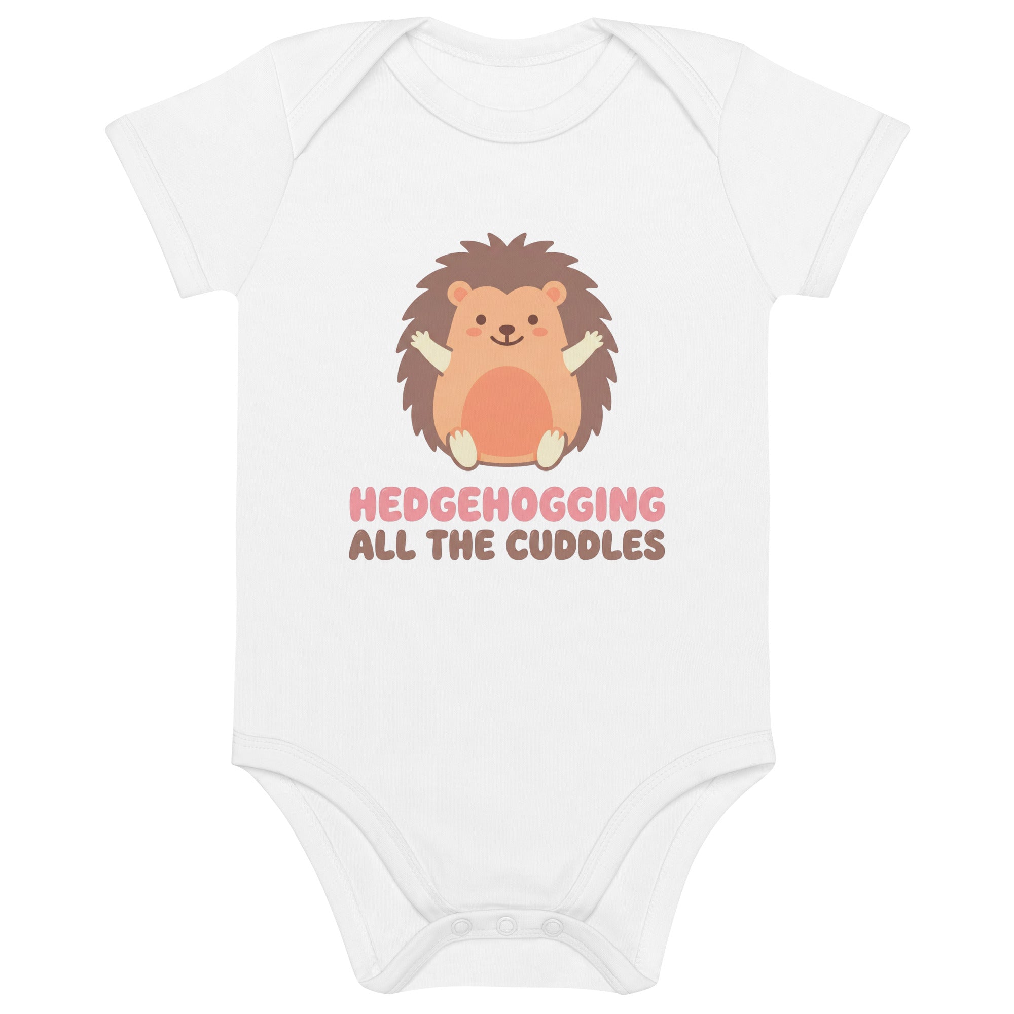 Wrap your little one in warmth with this adorable bodysuit featuring a charming hedgehog illustration. The design showcases a sweet, round hedgehog with a happy face and outstretched arms, printed above the playful pink text that reads 'HEDGEHOGGING' and 'ALL THE CUDDLES'. This organic cotton bodysuit is designed to be wonderfully soft and gentle against delicate skin, ensuring maximum comfort for your baby.