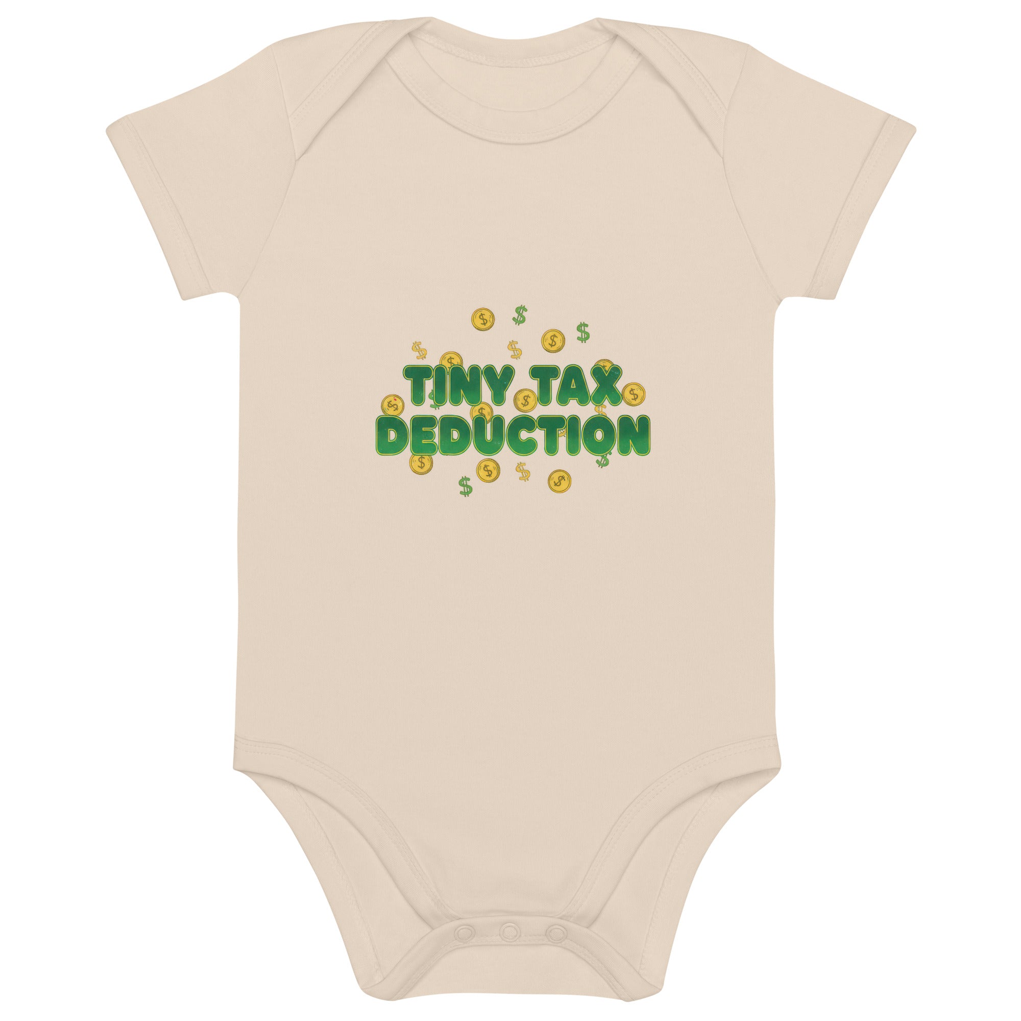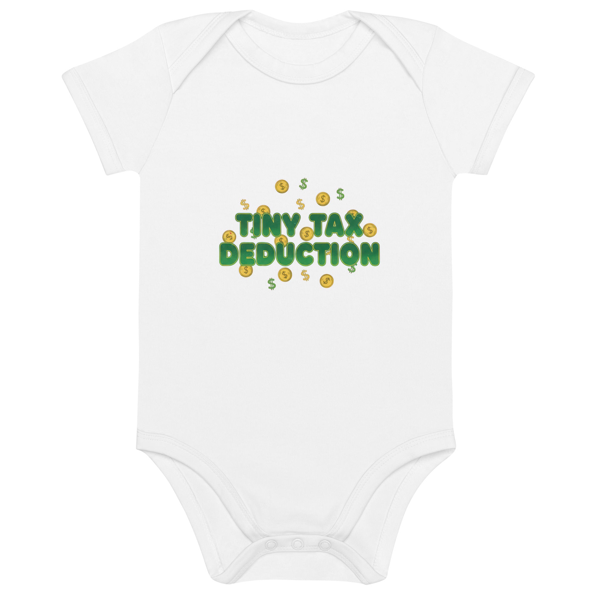 This charming baby bodysuit features a playful and humorous print that reads 'TINY TAX DEDUCTION' in a bold, slightly distressed green font. Scattered around the text are whimsical gold coins with dollar signs and flying green dollar signs, adding a fun, money-themed touch. Designed to bring a smile to parents' faces, this bodysuit offers a comfortable and practical choice for everyday wear, perfect for announcing your little one's arrival with a wink. Crafted from soft organic cotton, it's an ideal Organic Cotton Baby Bodysuit for your tiny bundle of joy.
