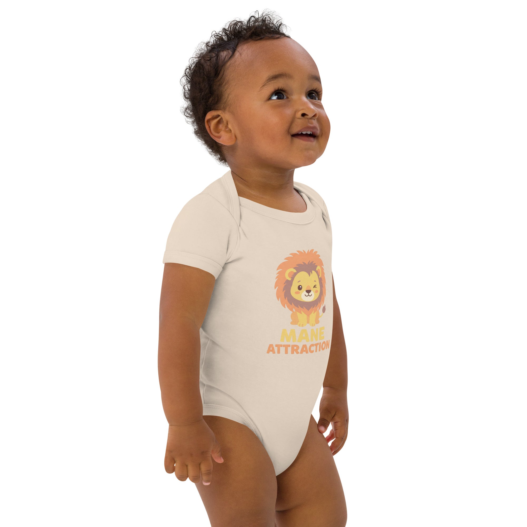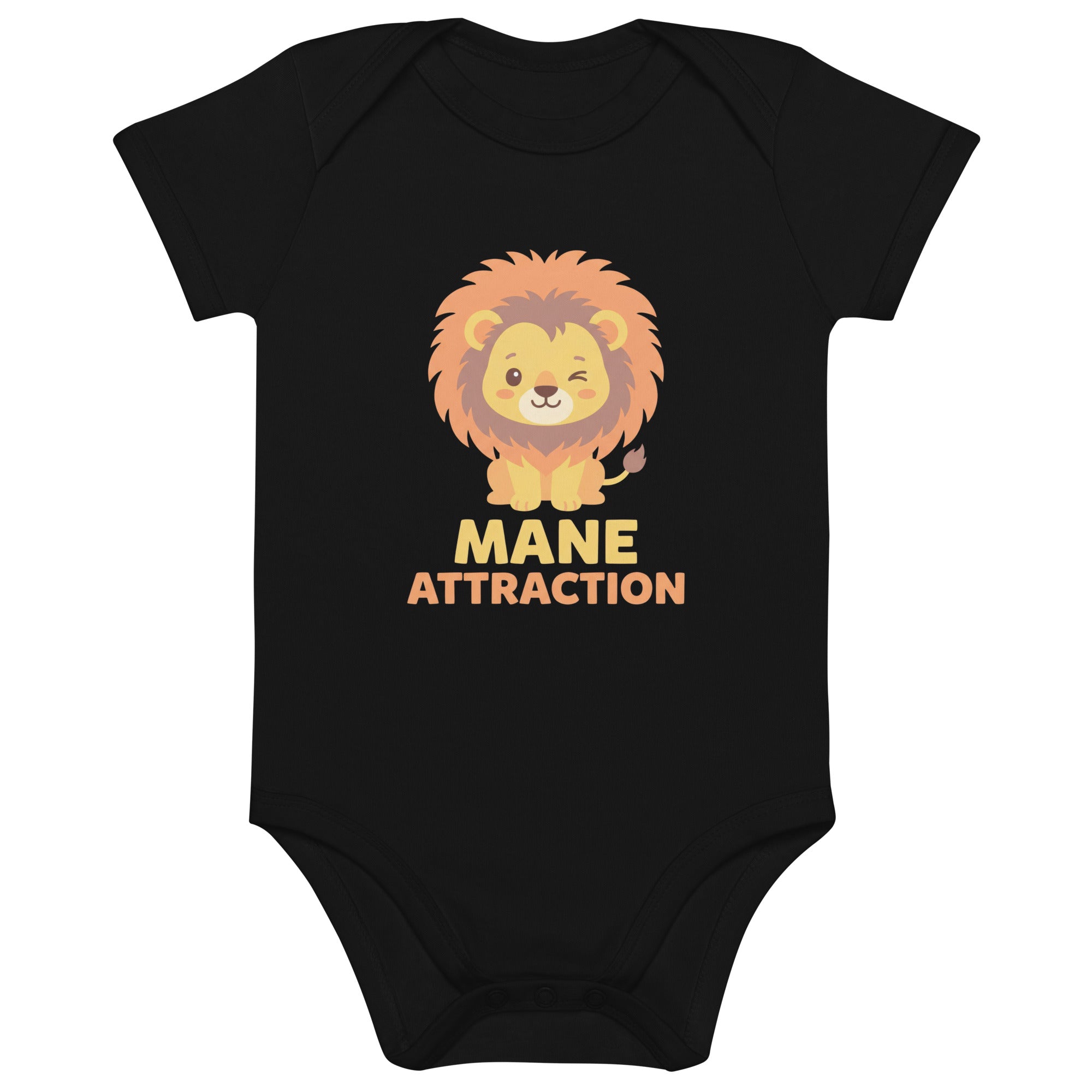 Introduce your little one to a world of charm with this adorable bodysuit featuring a cute, winking cartoon lion with a fluffy orange and brown mane. Below the cheerful feline, the clever pun 'MANE ATTRACTION' is printed in warm yellow-orange and darker orange tones, creating a playful and eye-catching design. Crafted from ultra-soft, stretchy 100% organic cotton, this bodysuit ensures maximum comfort for your baby. It's designed for easy everyday wear, providing a cozy fit for all their adventures.