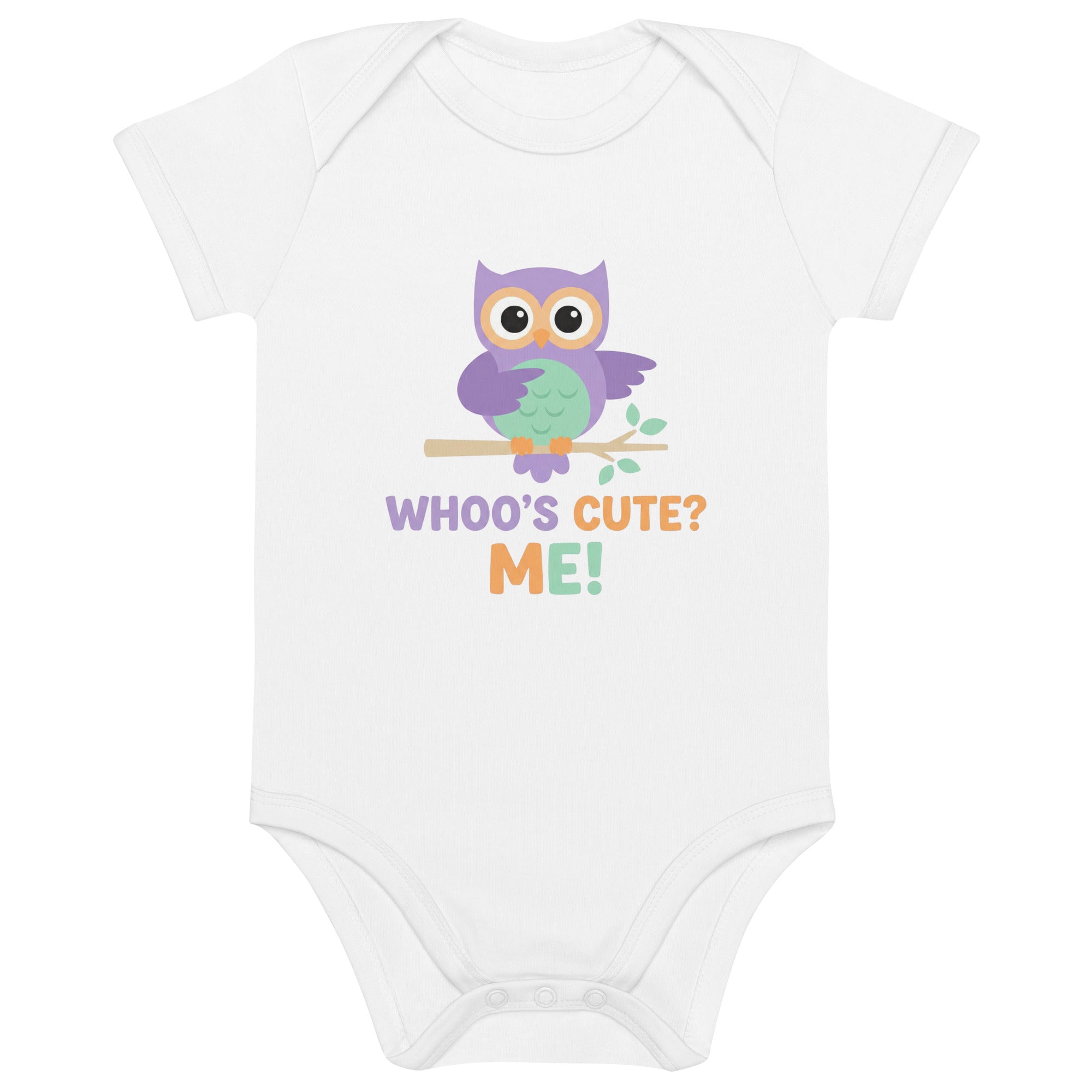 This adorable baby bodysuit features a charming purple and green owl perched on a branch, asking 'WHOO'S CUTE?' with the delightful answer 'ME!'. The sweet illustration uses soft pastel colors to create a heartwarming and playful design perfect for your little one. Made from soft organic cotton, this bodysuit offers comfort and ease for all-day wear, making it an ideal addition to any baby's wardrobe. Your baby will feel cozy and look utterly charming in this organic cotton baby bodysuit.