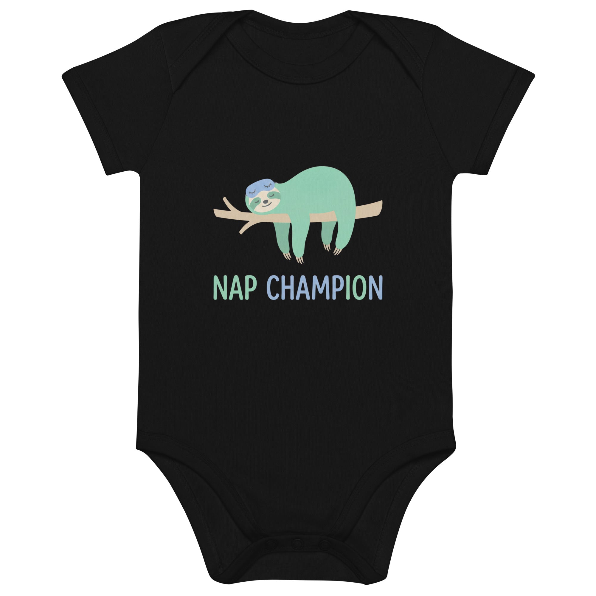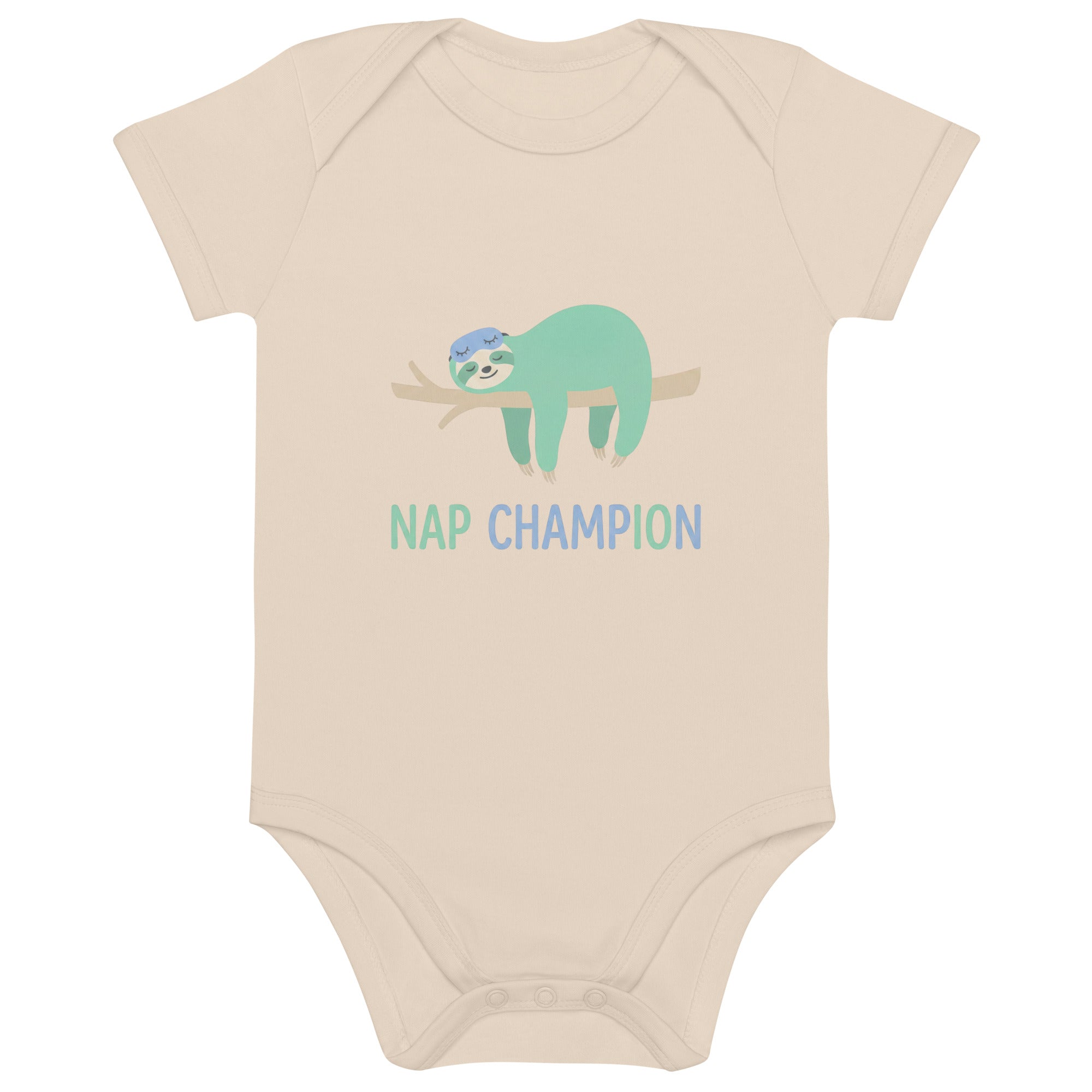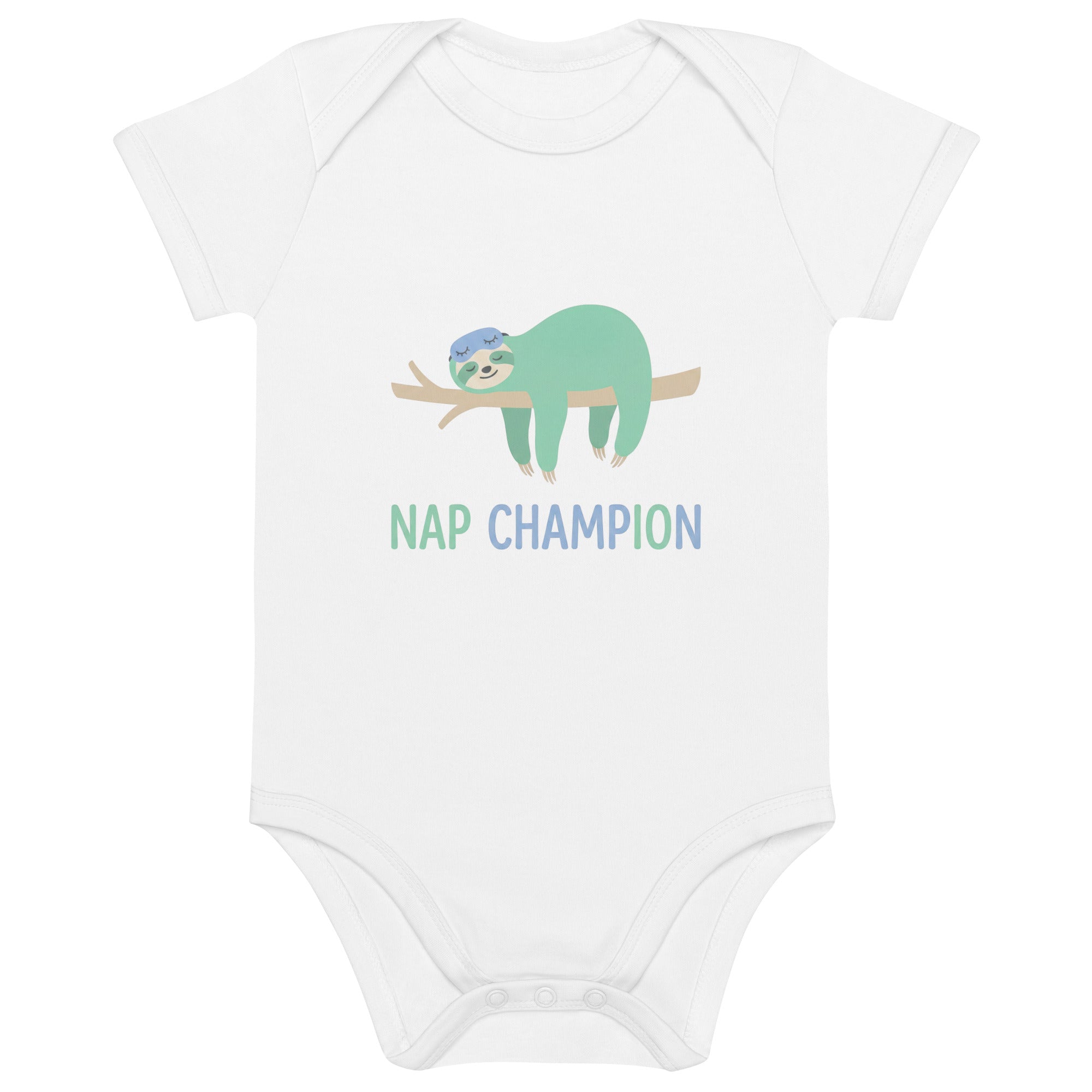 The design showcases a sweet, sleepy teal sloth wearing a light blue sleeping mask, gently resting on a tan tree branch. Below this charming illustration, the phrase 'NAP CHAMPION' is printed in a playful two-tone font, with 'NAP' in green/teal and 'CHAMPION' in light blue. This adorable bodysuit is perfect for celebrating your little one's napping prowess, combining whimsical art with everyday practicality. It offers ultimate comfort for sensitive skin, making it an ideal choice for your little Organic Cotton Baby Bodysuit.