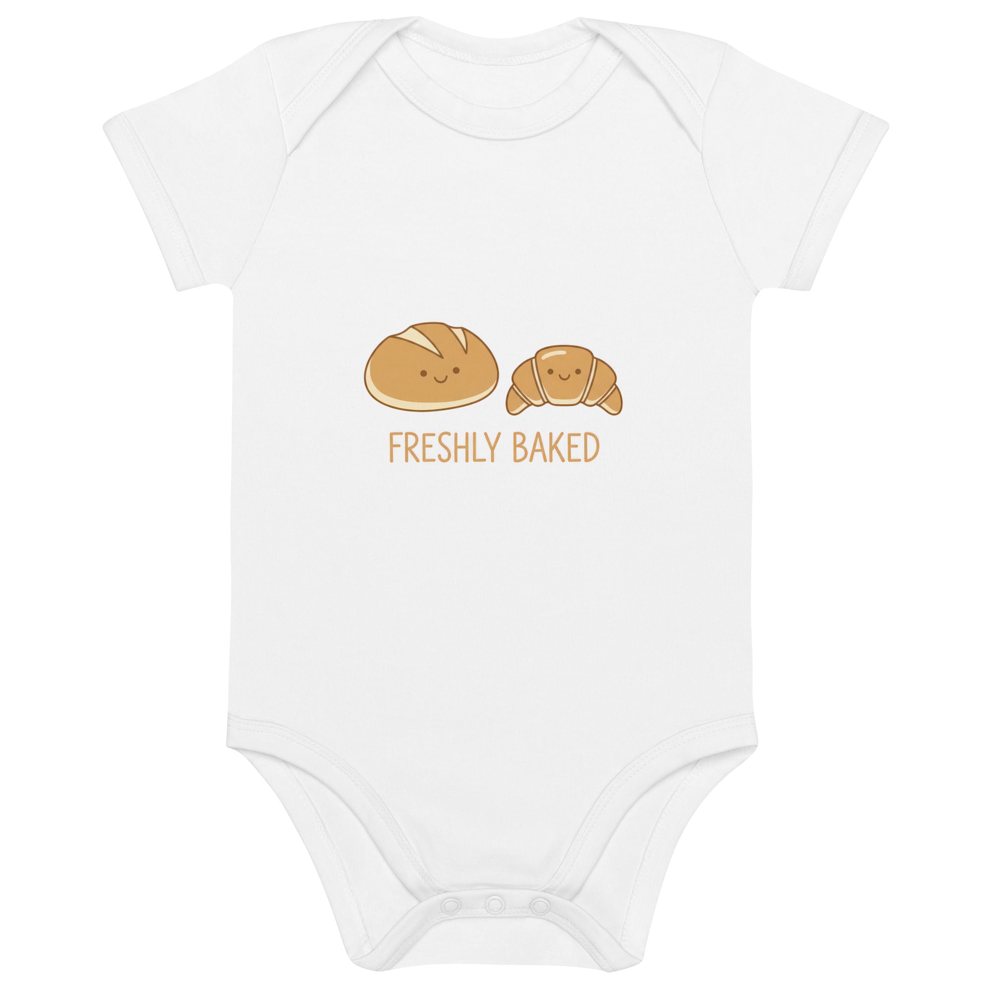 This adorable baby bodysuit features a charming illustration of two smiling baked goods – a round loaf of bread with classic scoring and a happy croissant – accompanied by the sweet phrase 'FRESHLY BAKED' in a warm, inviting font. The artwork showcases delightful brown and tan tones with crisp outlines, perfect for a little one who loves a treat. Crafted for gentle wear, this bodysuit offers a soft feel and comfortable fit, ideal for everyday adventures and cozy moments, making it a delightful addition to any baby's wardrobe. Enjoy ultimate comfort with this premium Organic Cotton Baby Bodysuit.