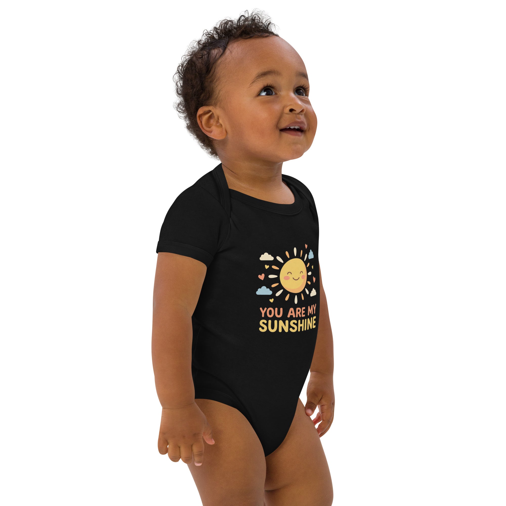 This adorable organic cotton baby bodysuit features a cheerful smiling sun character surrounded by soft pastel clouds and loving hearts. Below the vibrant illustration, the heartwarming phrase 'YOU ARE MY SUNSHINE' is printed in a friendly, rounded font in shades of orange and yellow. This sweet and bright design is perfect for celebrating your little one's joyful spirit. Made from soft, breathable organic cotton, it's gentle on delicate skin and ideal for everyday wear or special occasions. With convenient snap closures for easy changes, this comfortable Organic Cotton Baby Bodysuit is a delightful addition to any baby's wardrobe.
