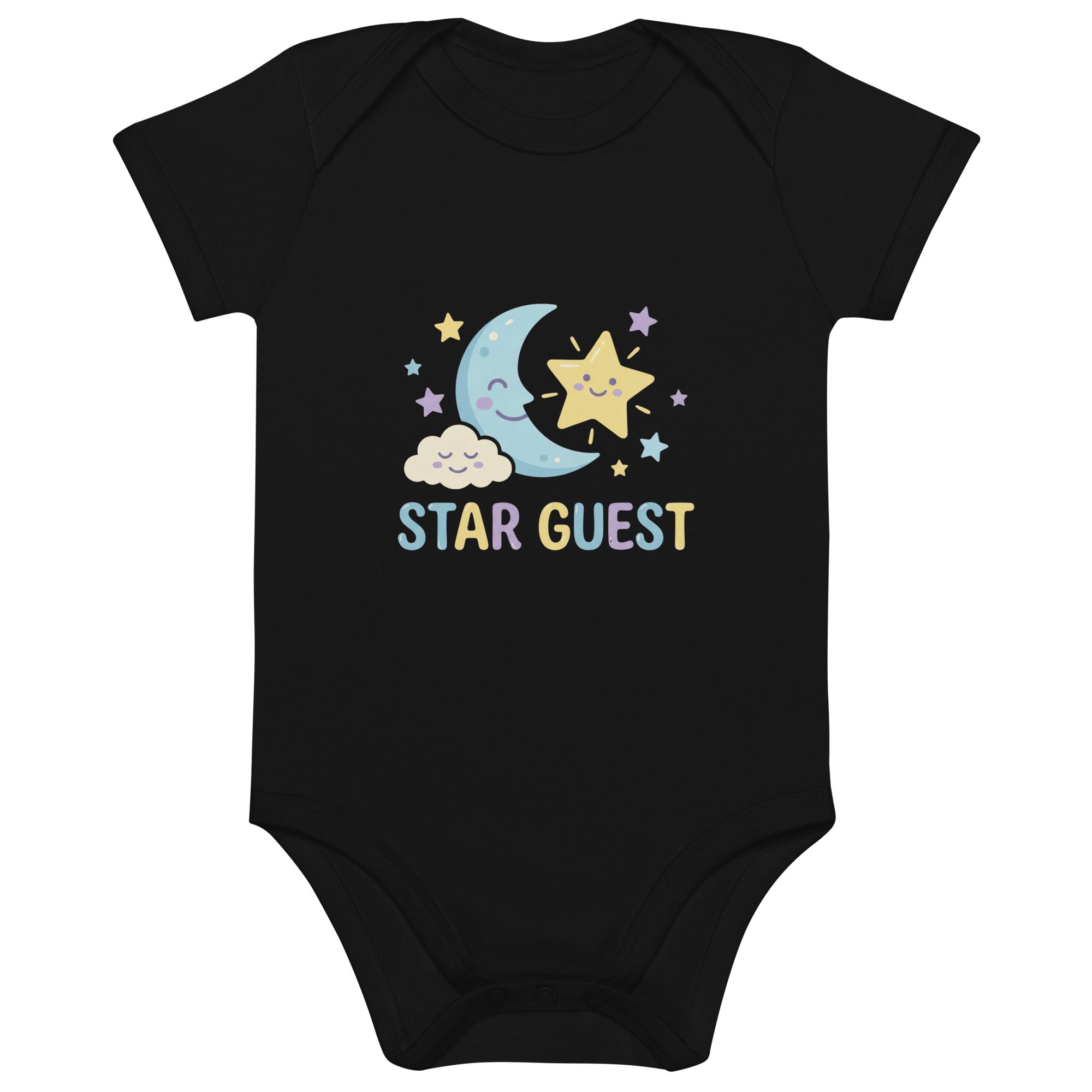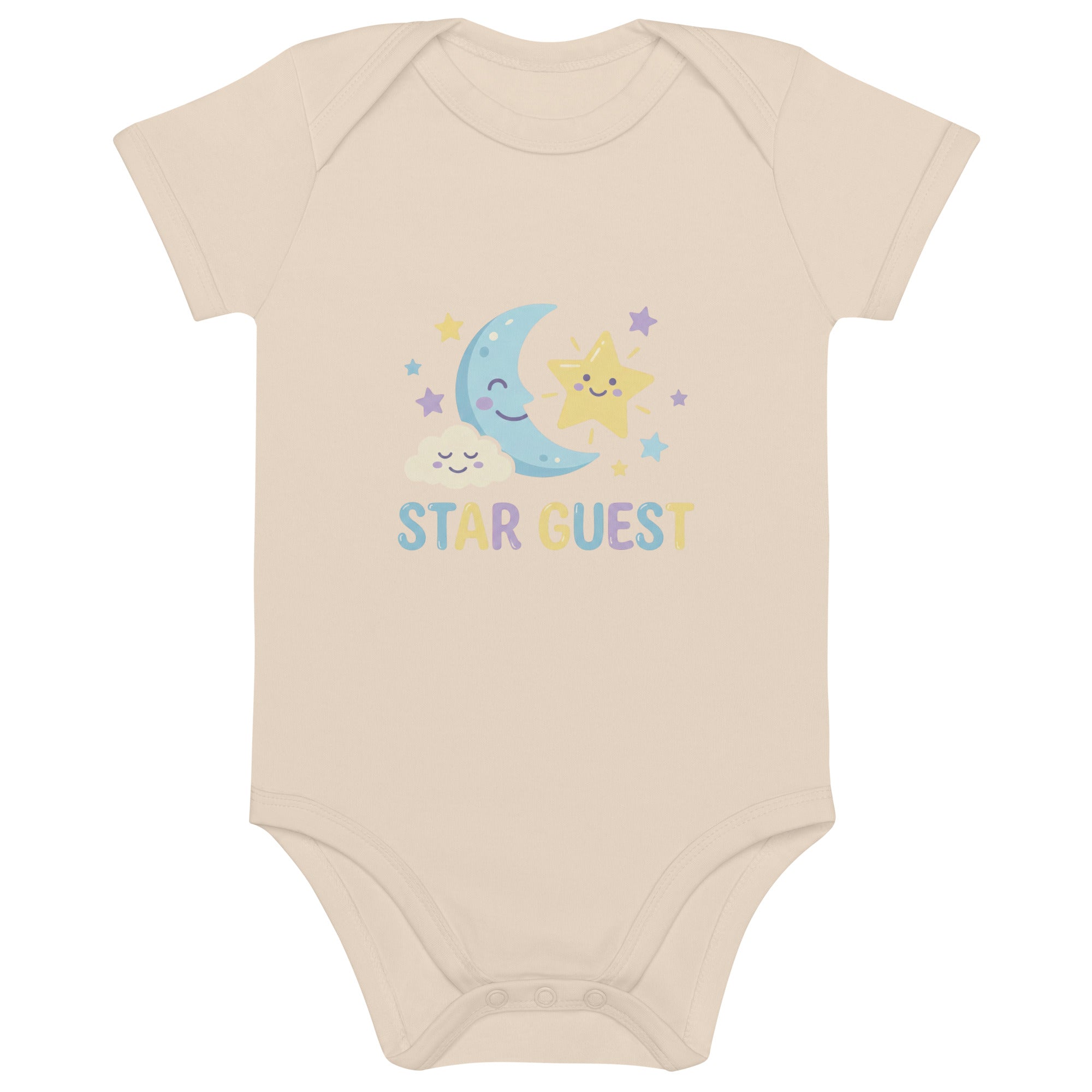 Start their journey with our adorable 'STAR GUEST' baby bodysuit, featuring a whimsical smiling moon, a radiant star, and a happy cloud surrounded by smaller stars. The delightful design uses soft pastel shades of light blue, yellow, and lavender, creating a comforting and dreamy visual. This charming bodysuit is perfect for celebrating your little one's arrival or making any day special, providing a gentle feel for delicate skin. This comfortable Organic Cotton Baby Bodysuit is an ideal choice for everyday wear.
