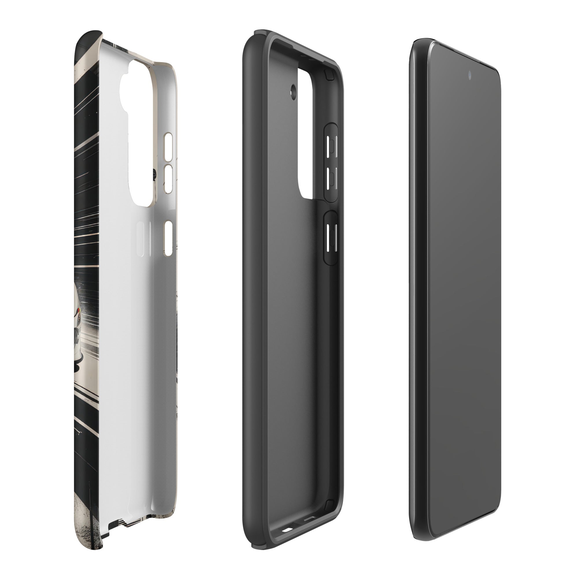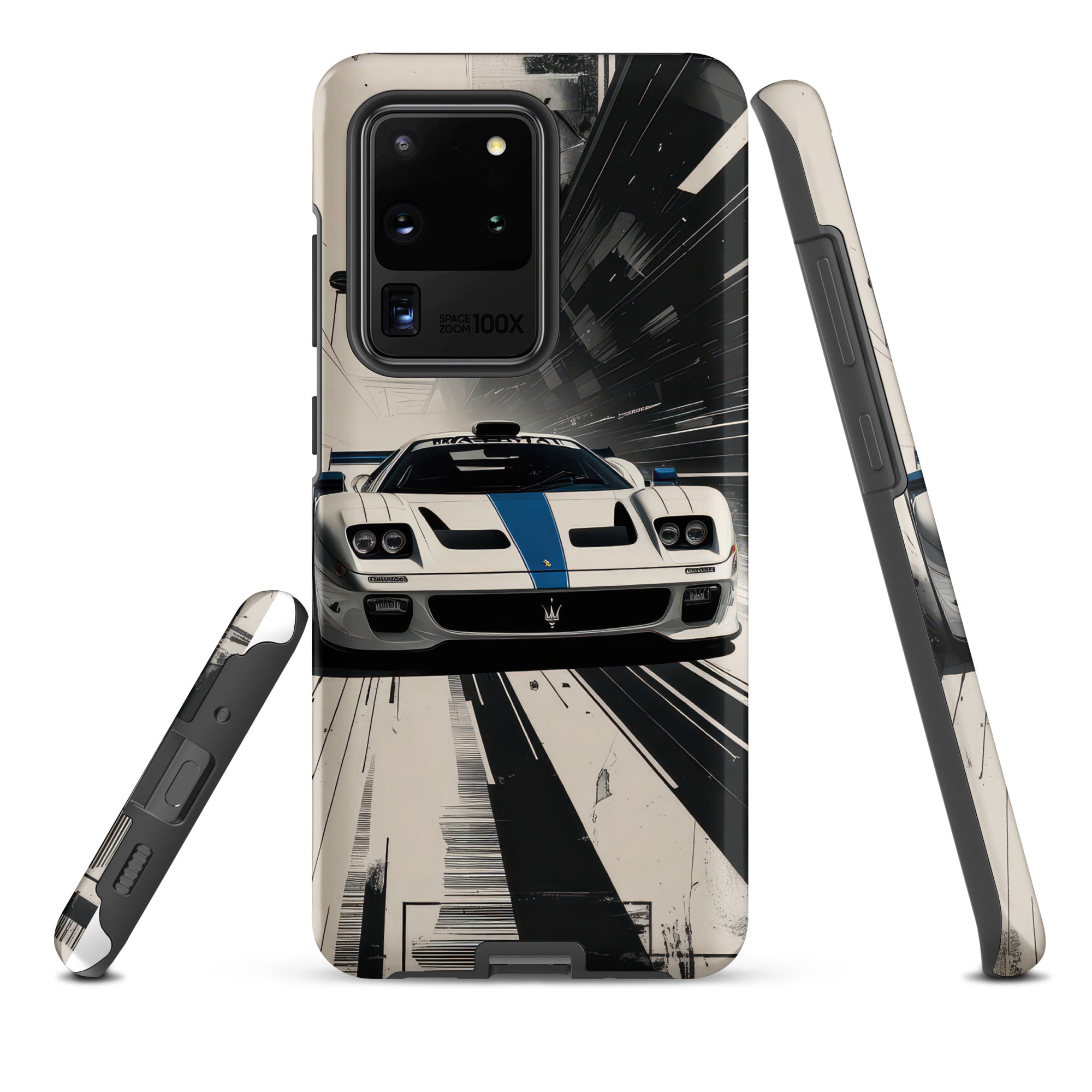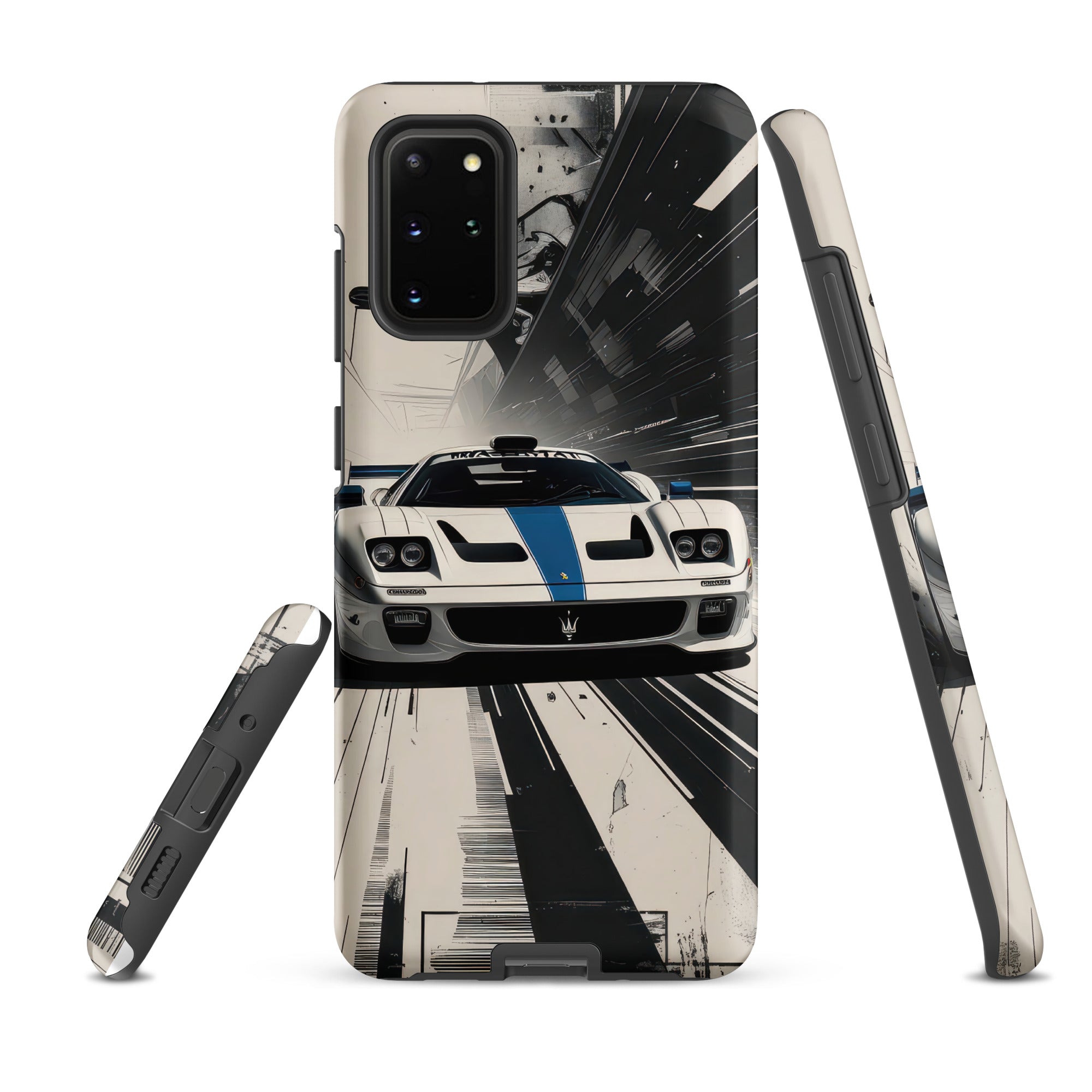 Immerse yourself in the thrill of the race with this dynamic phone case, featuring a sleek white GT sports car with a vibrant blue racing stripe, set against a monochrome, high-speed blur background of abstract architectural elements. This design exudes speed and modern elegance, perfect for car enthusiasts and those who appreciate sophisticated, fast-paced aesthetics. Enjoy dependable dual-layer defense with this Tough Case for Samsung®.