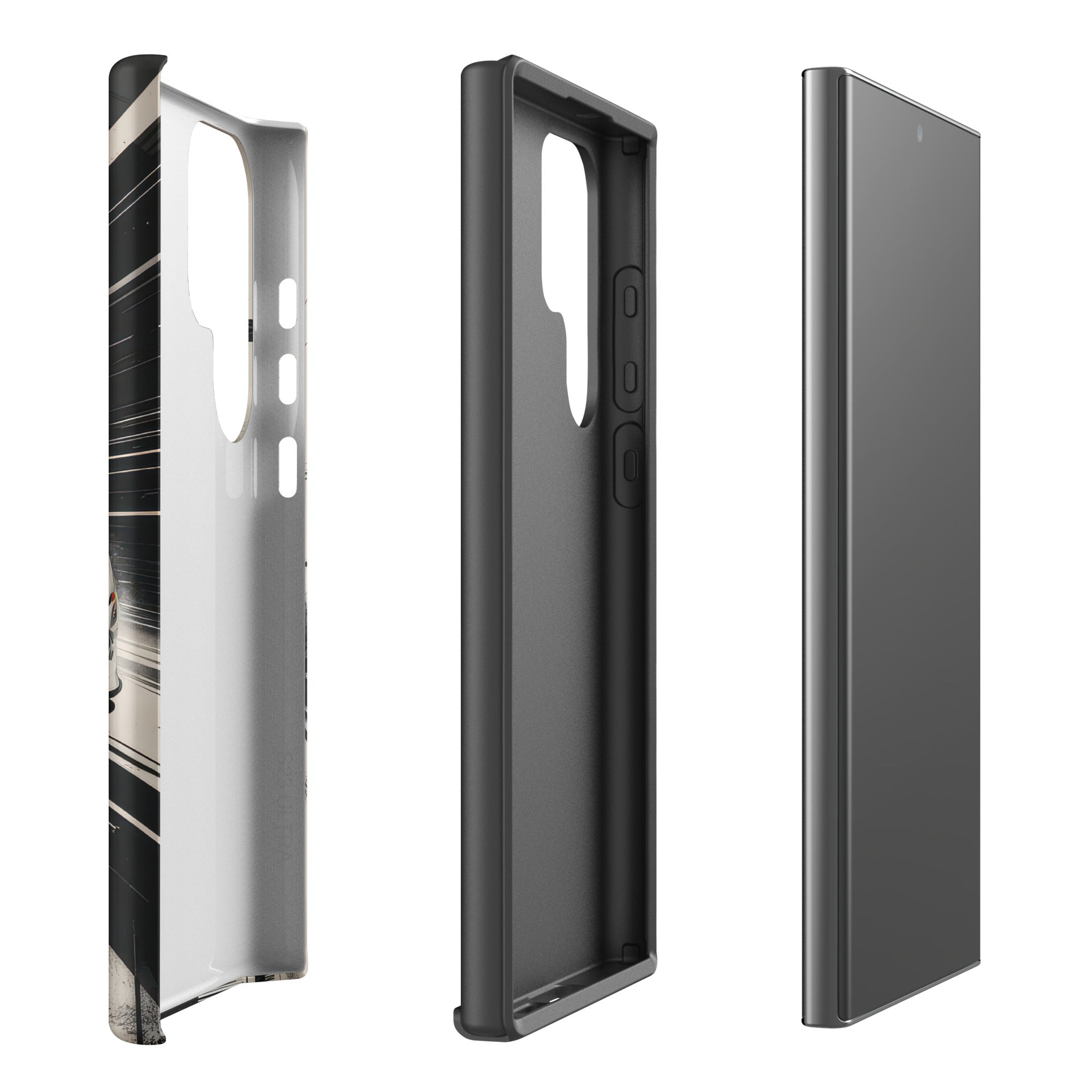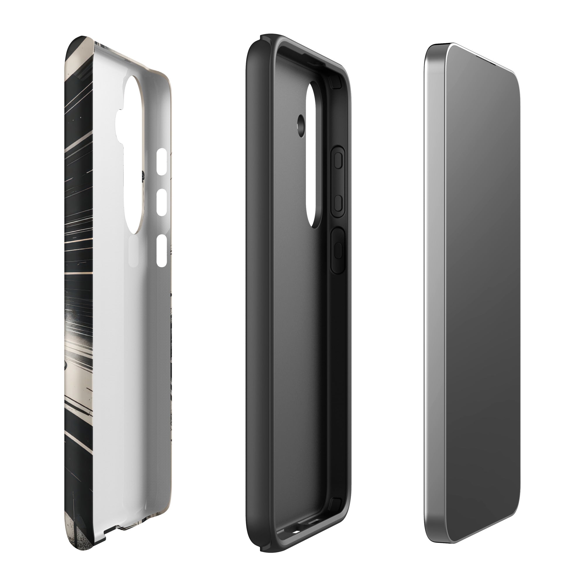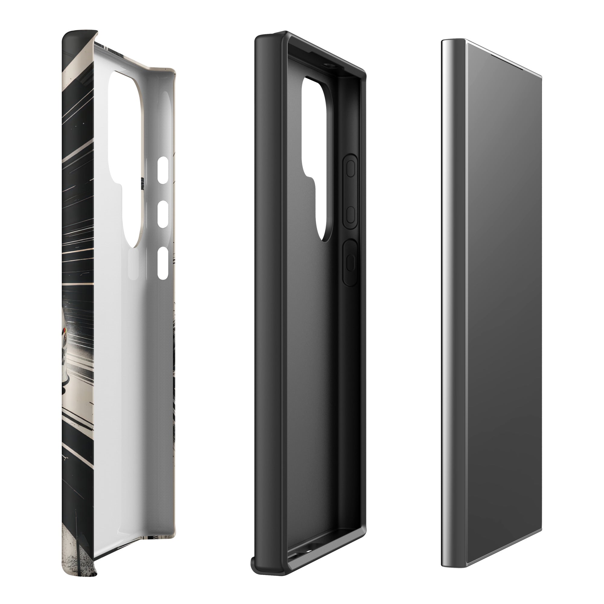 Immerse yourself in the thrill of the race with this dynamic phone case, featuring a sleek white GT sports car with a vibrant blue racing stripe, set against a monochrome, high-speed blur background of abstract architectural elements. This design exudes speed and modern elegance, perfect for car enthusiasts and those who appreciate sophisticated, fast-paced aesthetics. Enjoy dependable dual-layer defense with this Tough Case for Samsung®.