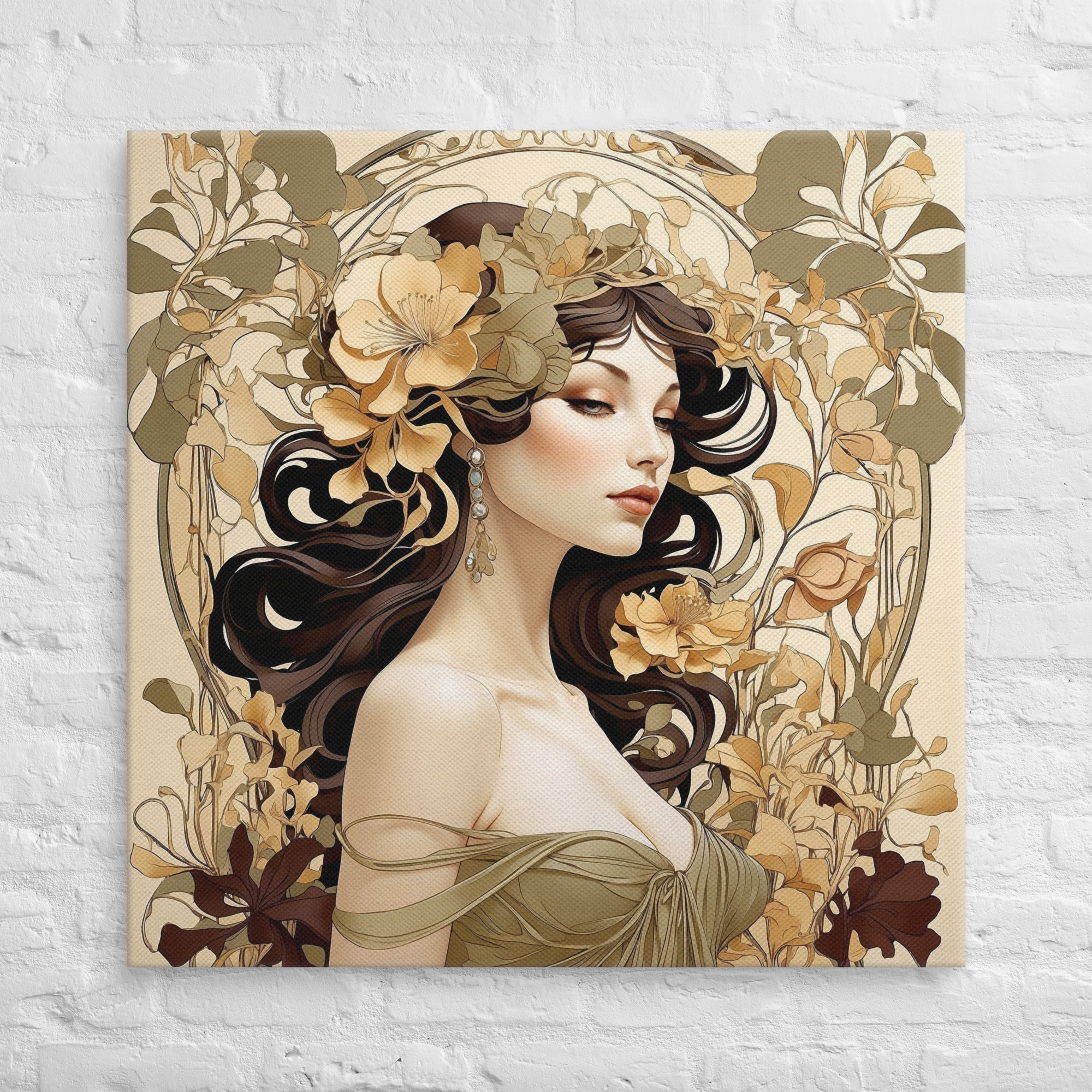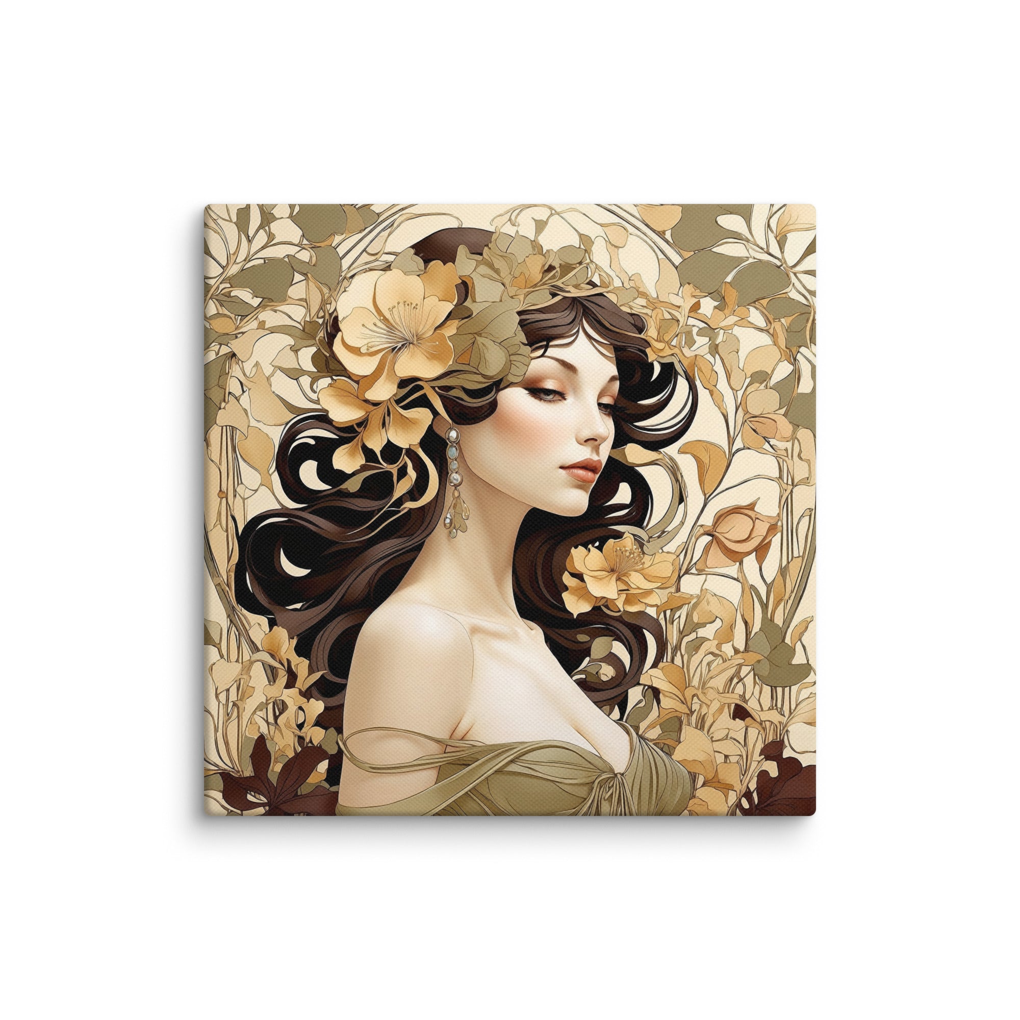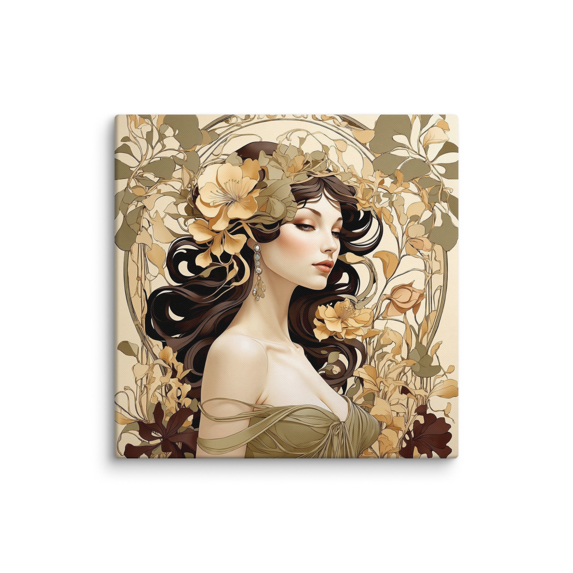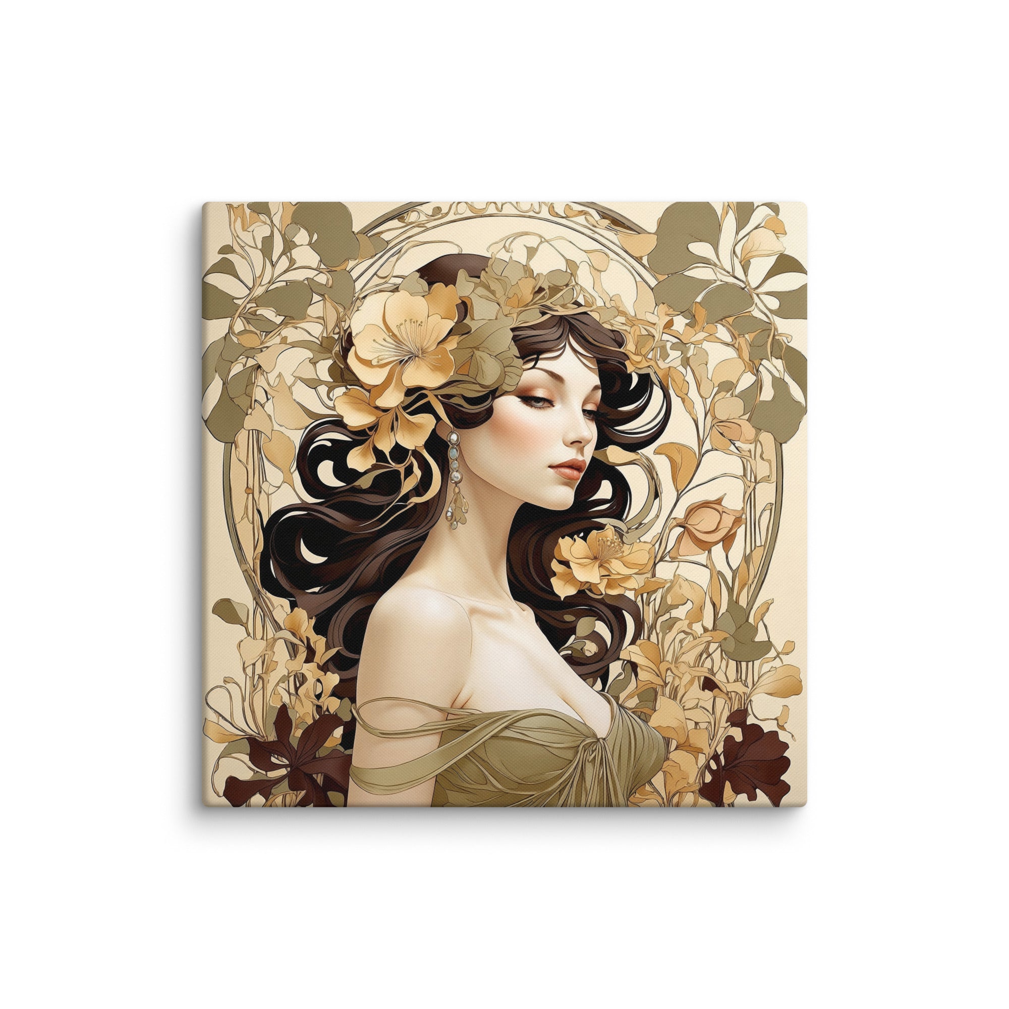 This elegant artwork portrays a graceful woman surrounded by golden floral motifs and flowing Art Nouveau lines. The warm palette of ochre, cream, and sepia tones evokes timeless sophistication—perfect for adding classic beauty to bedrooms or living spaces.