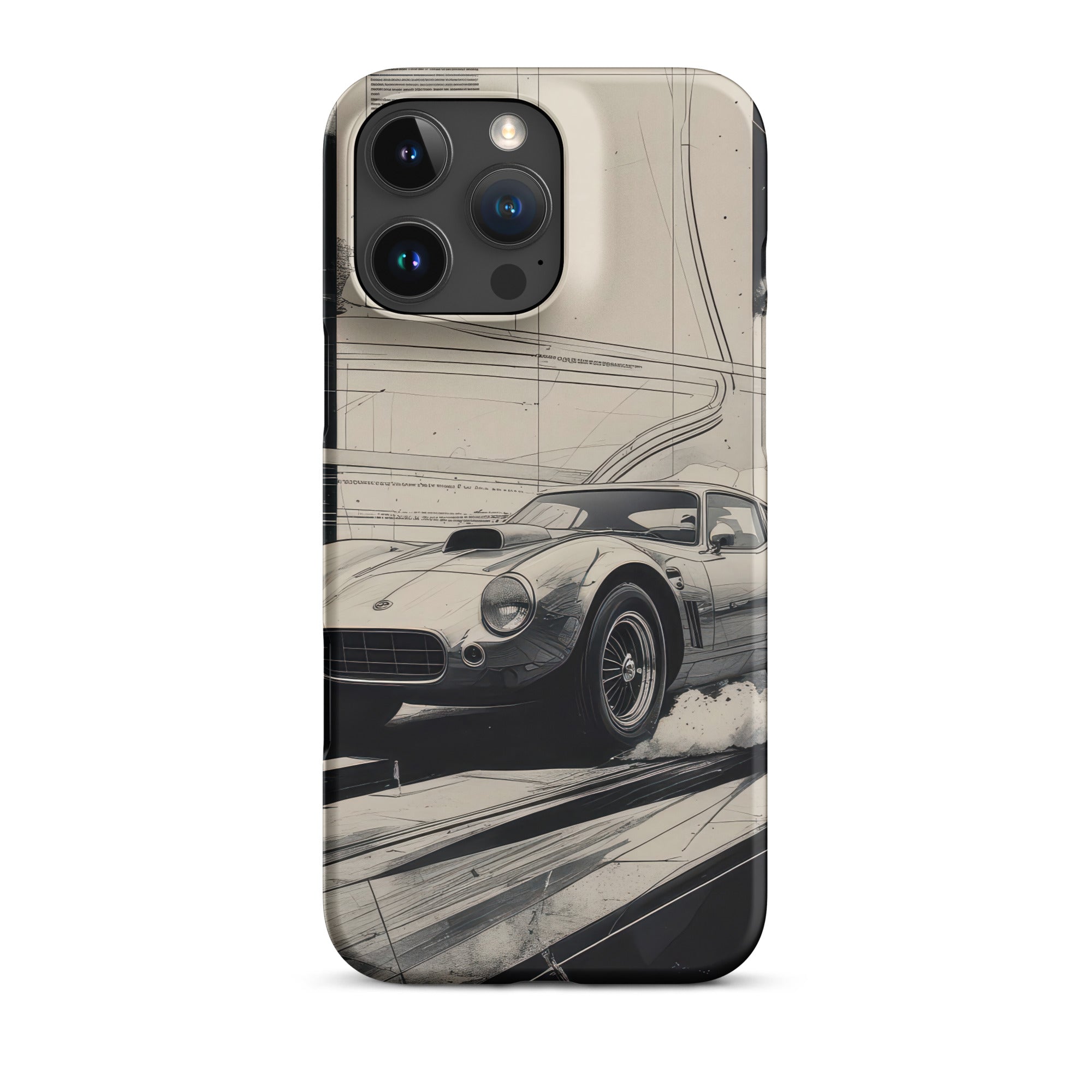 A sleek vintage coupe and blueprint-style lines race across the back of your phone in sharp monochrome. The slim snap-on shell feels featherlight yet adds a reassuring layer between your device and everyday scuffs. It is made for pockets, clutches, and nights out when you want style more than bulk. Enjoy streamlined everyday protection with this Snap Case for iPhone®.