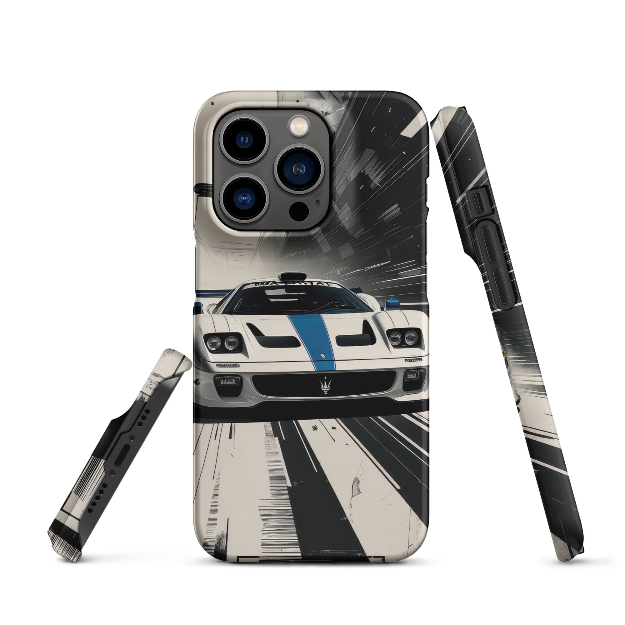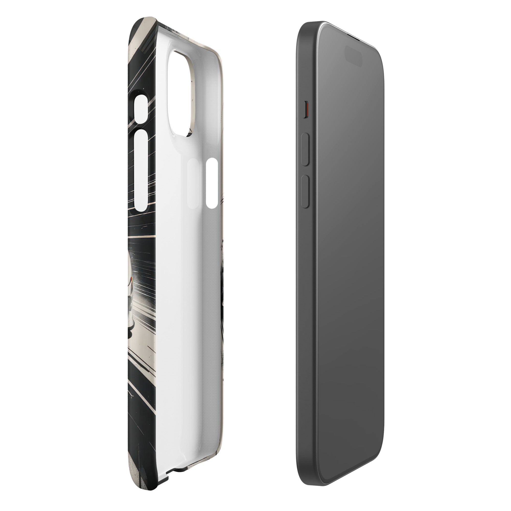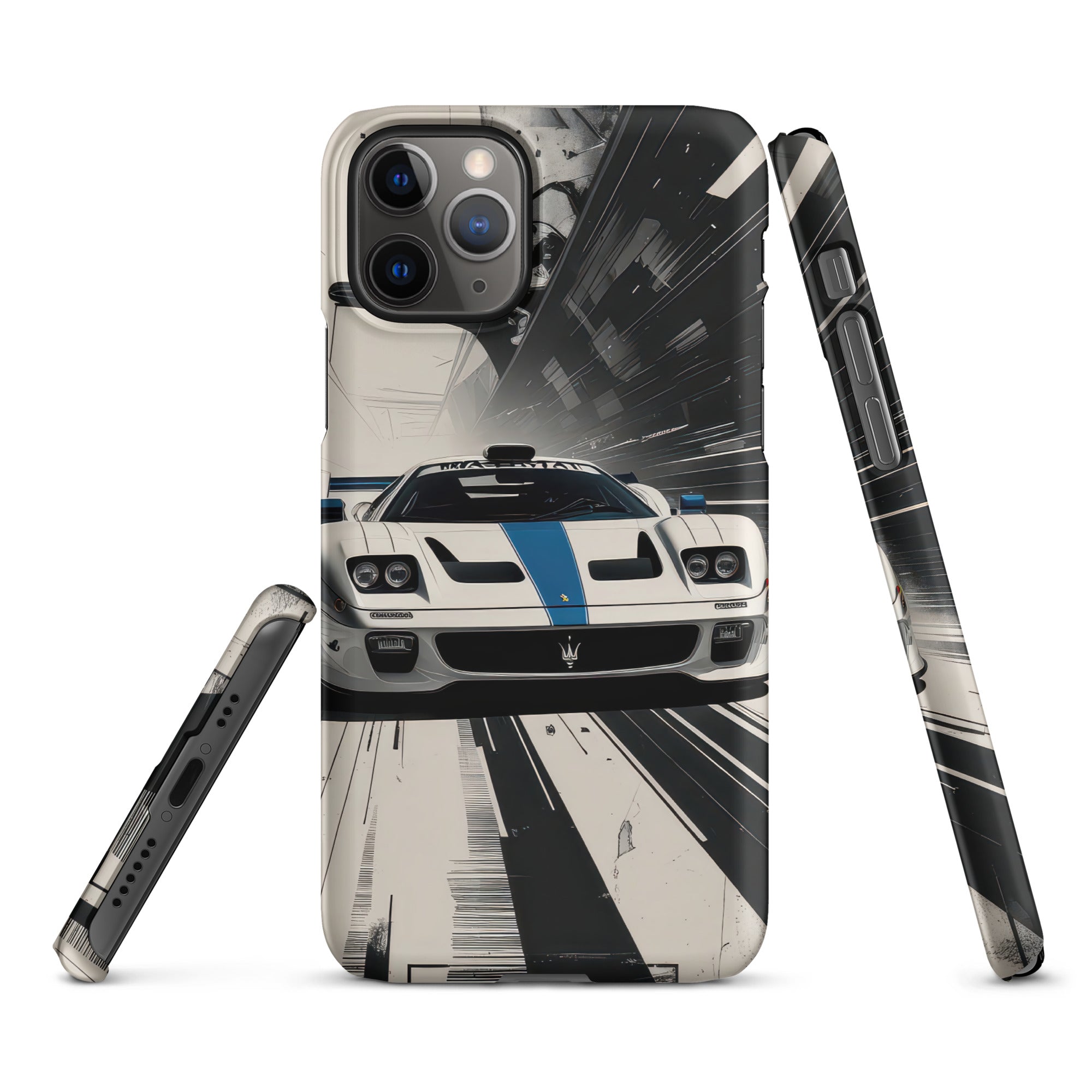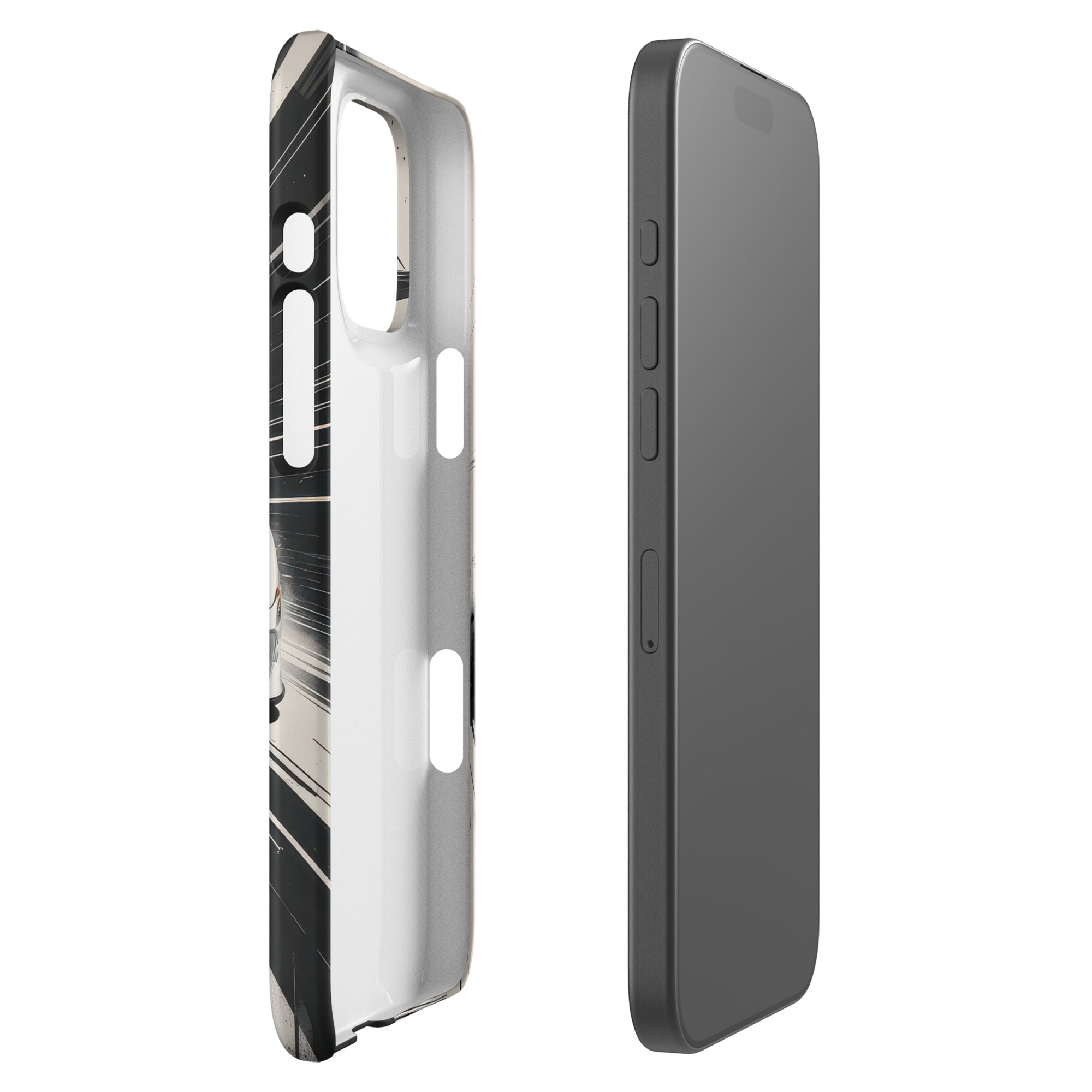 Accelerate your style with this dynamic artwork, showcasing a sleek white sports car with a distinctive blue racing stripe, captured mid-motion against a stark, high-speed grayscale background. This design is perfect for those who appreciate minimalist elegance fused with the adrenaline of high-performance machines. Enjoy lightweight, classy protection that seamlessly blends style and security with this Snap Case for iPhone®.