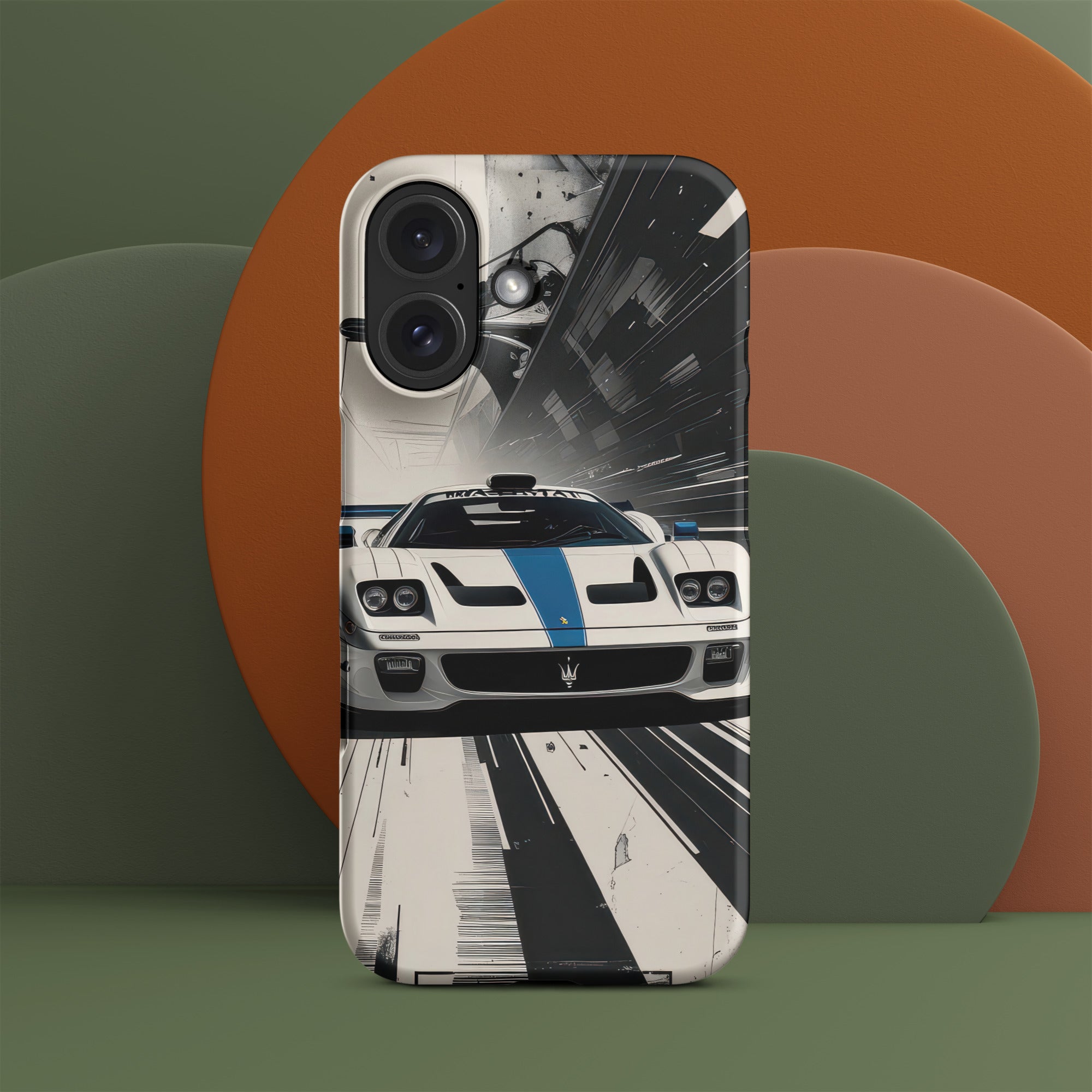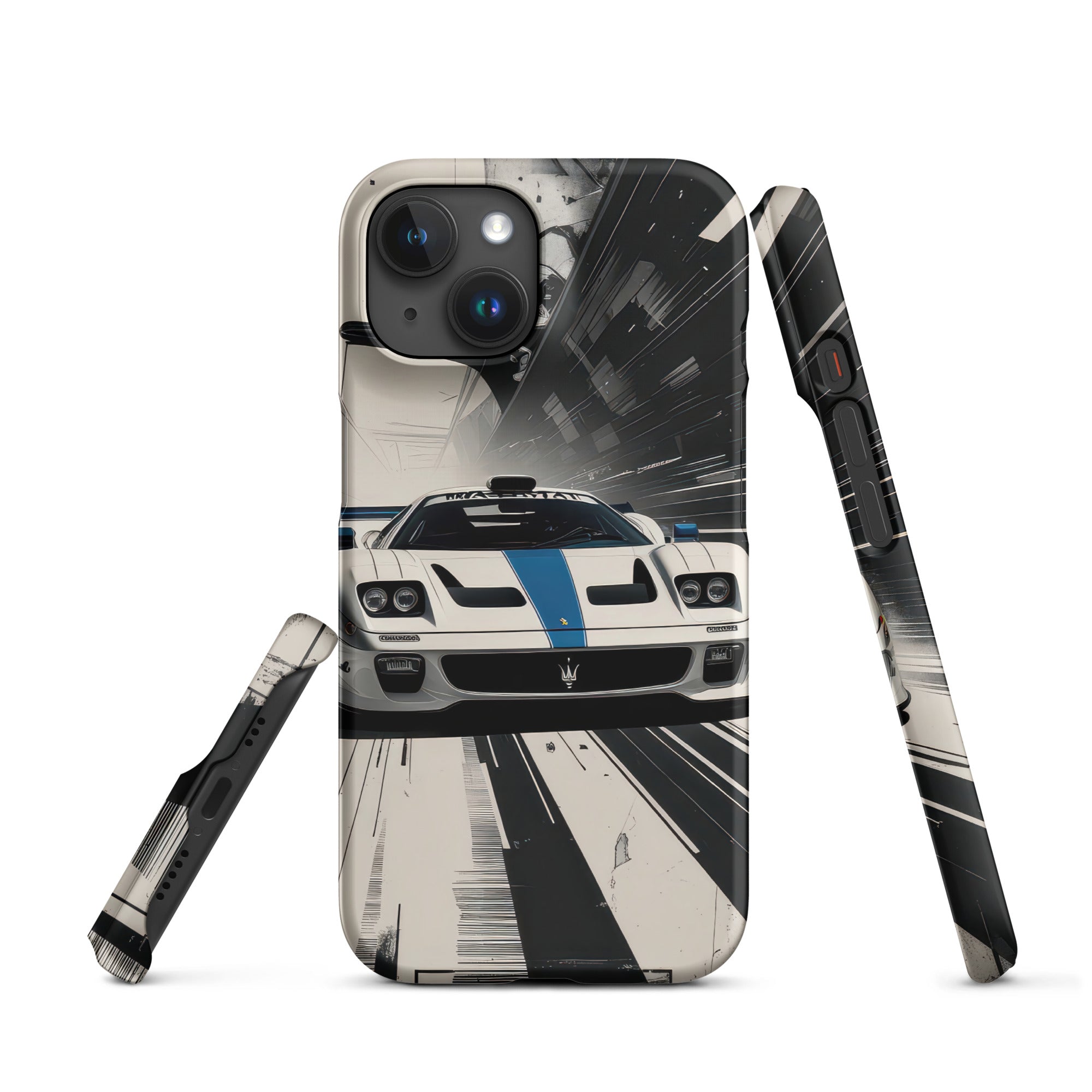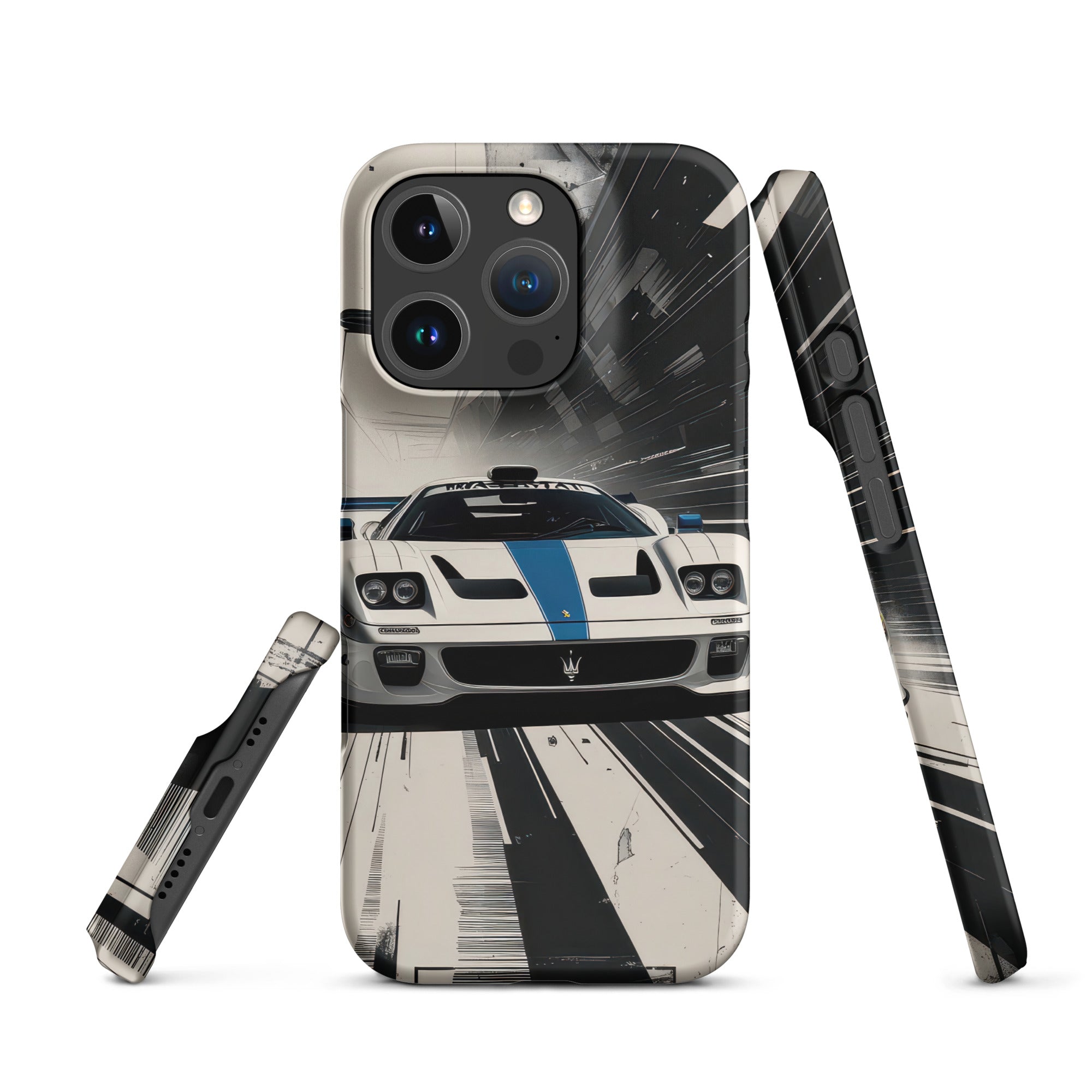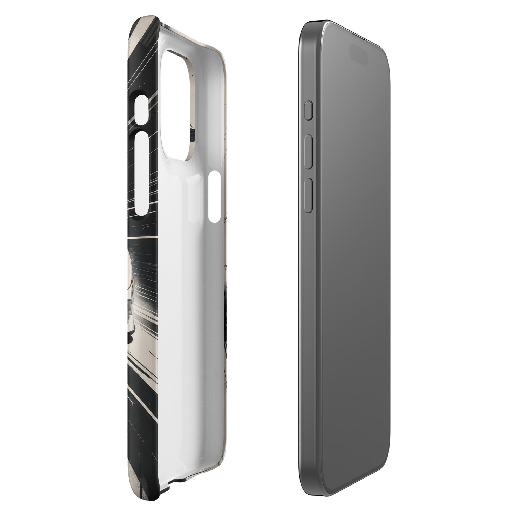 Accelerate your style with this dynamic artwork, showcasing a sleek white sports car with a distinctive blue racing stripe, captured mid-motion against a stark, high-speed grayscale background. This design is perfect for those who appreciate minimalist elegance fused with the adrenaline of high-performance machines. Enjoy lightweight, classy protection that seamlessly blends style and security with this Snap Case for iPhone®.