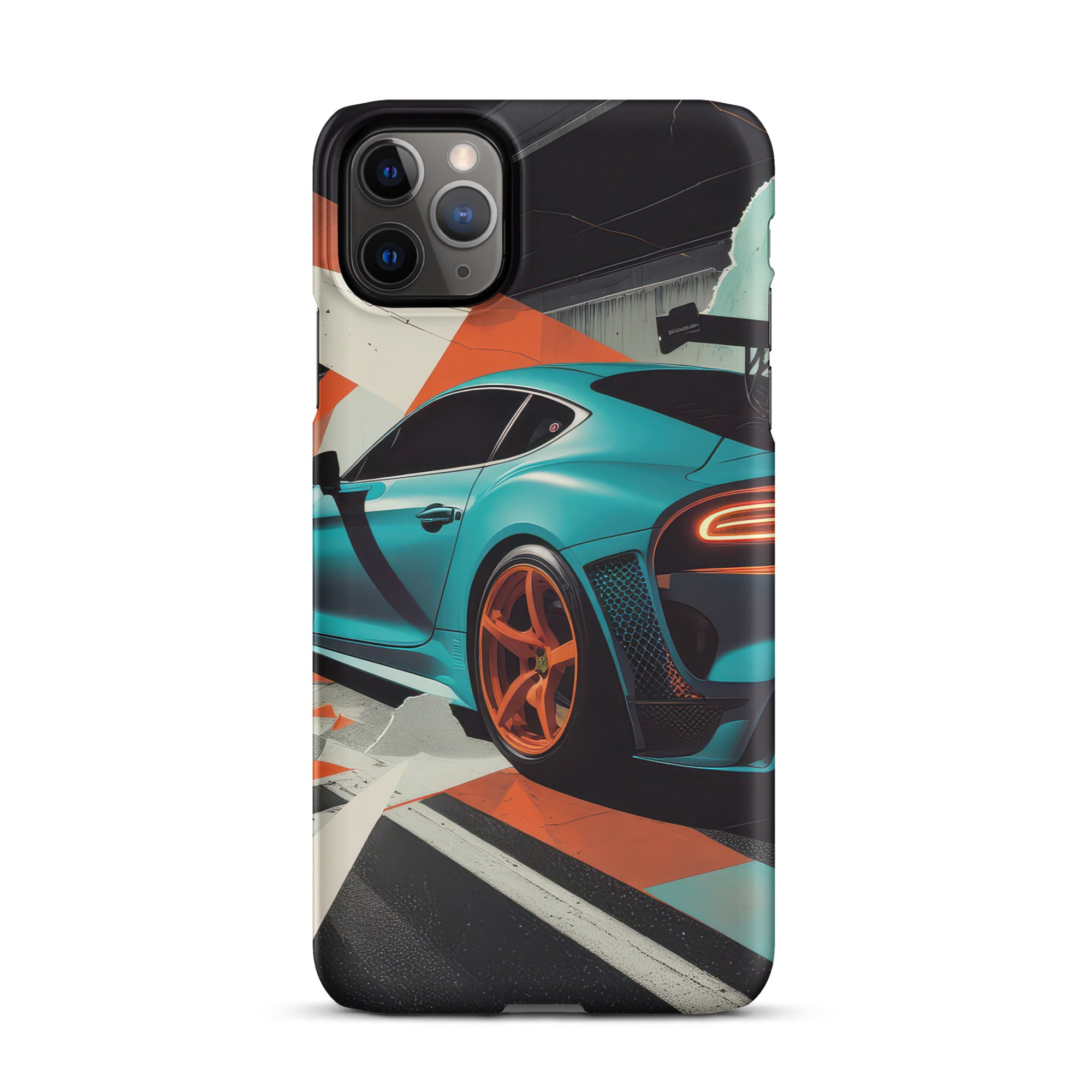 Embrace minimalist speed with the Teal Speed Streak Snap Case for iPhone® SCI0050. This striking design features a powerful teal sports car with bright orange wheels, dynamically framed by white and orange geometric lines that evoke a sense of rapid movement and modern art. It''s ideal for those who appreciate sleek aesthetics and a lightweight feel without compromising on essential protection. Keep your device safe with this classy Snap Case for iPhone®.