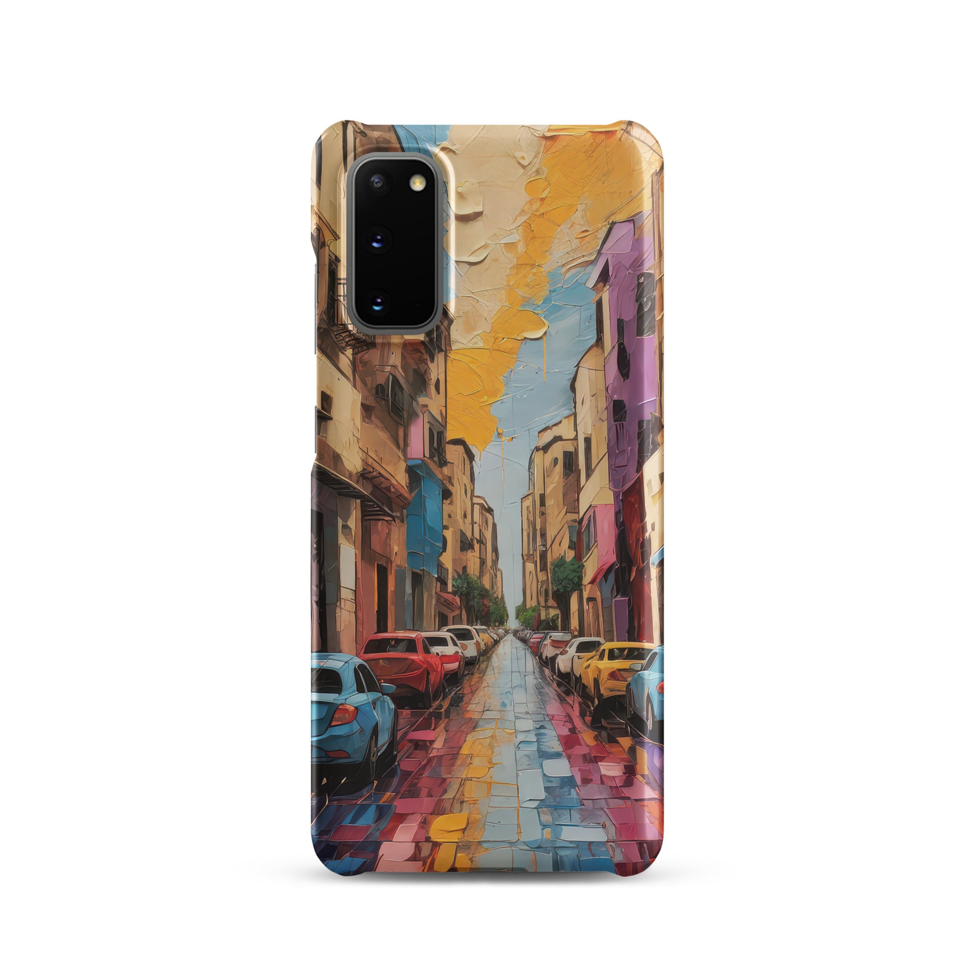 The vibrant ''Palette Street'' design features a dynamic, impasto-style painting of a bustling urban street scene, rendered with thick, expressive strokes. Buildings in hues of cream, purple, pink, and red flank a reflective road awash with splashes of blue, yellow, and fuchsia, under a sky painted with bold orange and blue. This artwork captures the energetic pulse of city life through a lens of rich texture and vivid color. Ideal for those who value minimalist design and artistic expression, this slim case adds personality without bulk. Secure your device with a stylish, lightweight Snap Case for Samsung®.
