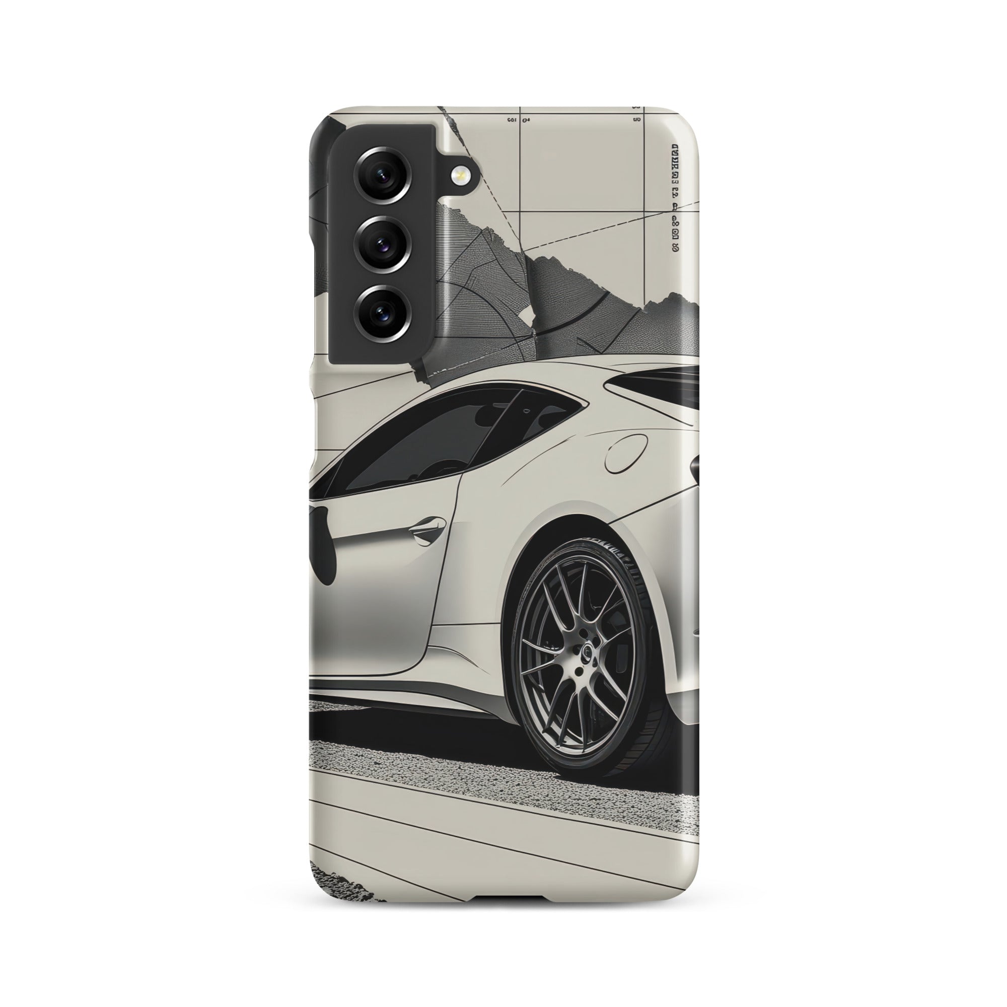 This snap case highlights a modern GT coupe cruising past torn blueprint textures for a sharp, studio inspired look. The slim profile adds a light protective shell that keeps your Samsung feeling sleek and pocket ready. It is ideal for daily errands, office days, and weekend drives. Enjoy streamlined everyday protection with this Snap Case for Samsung®.