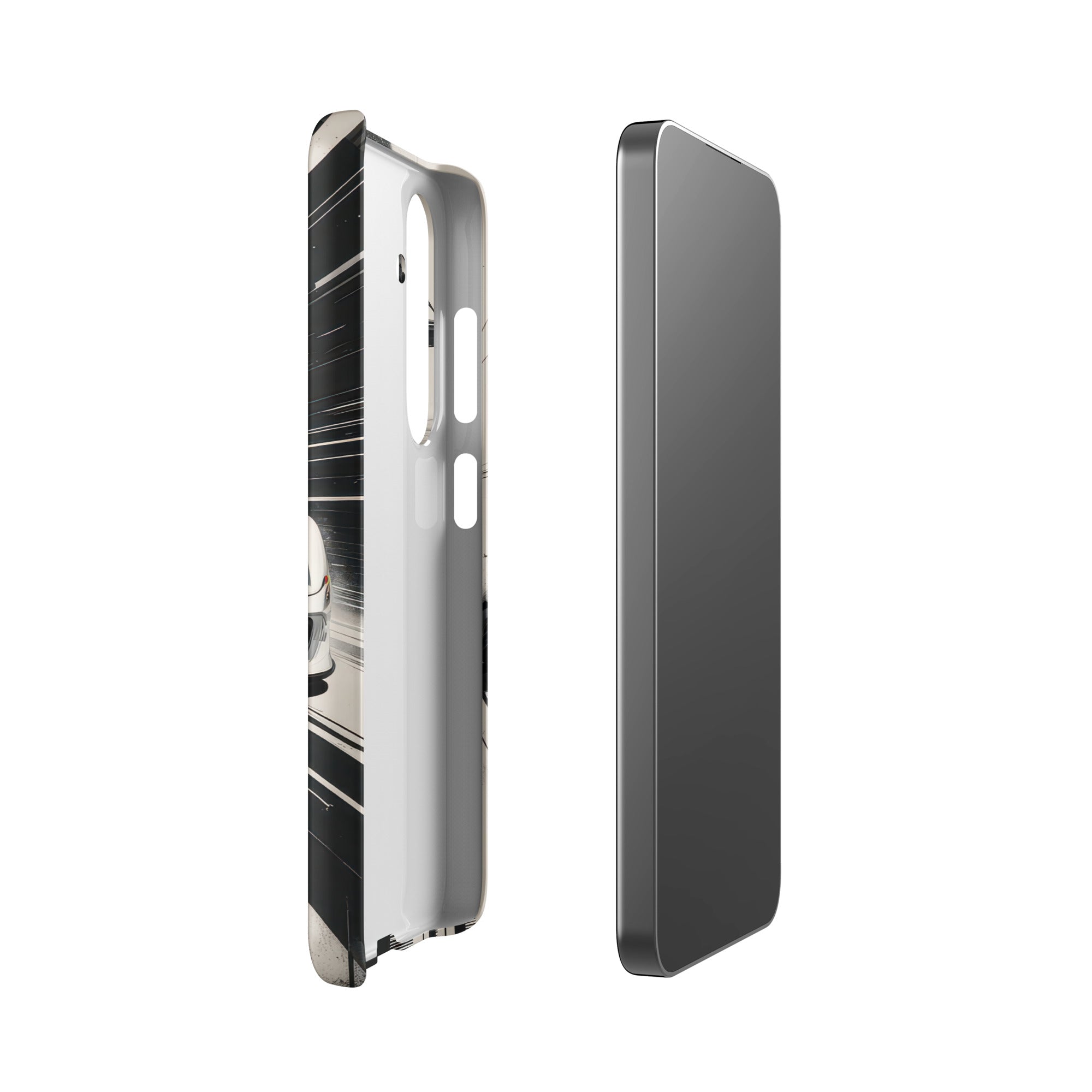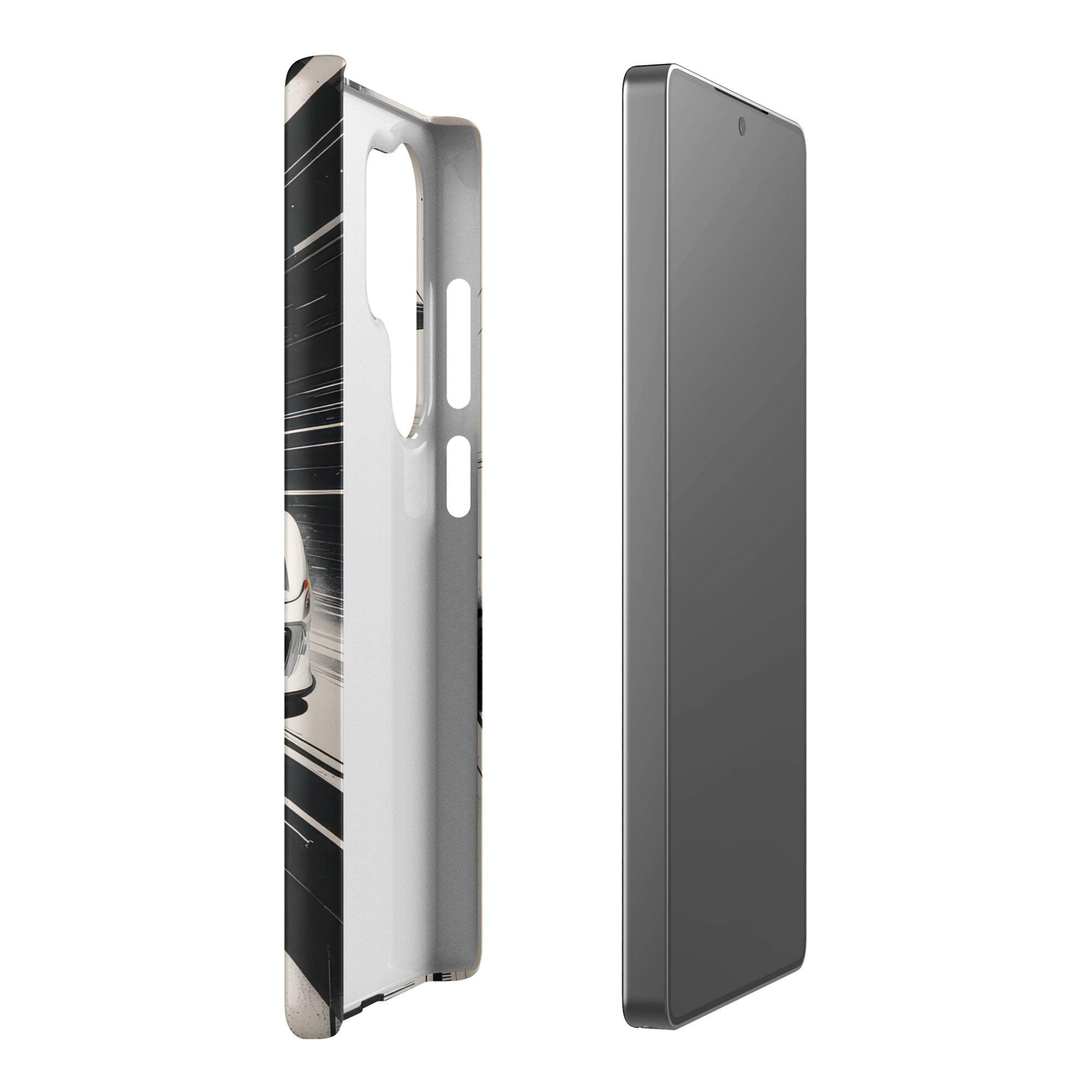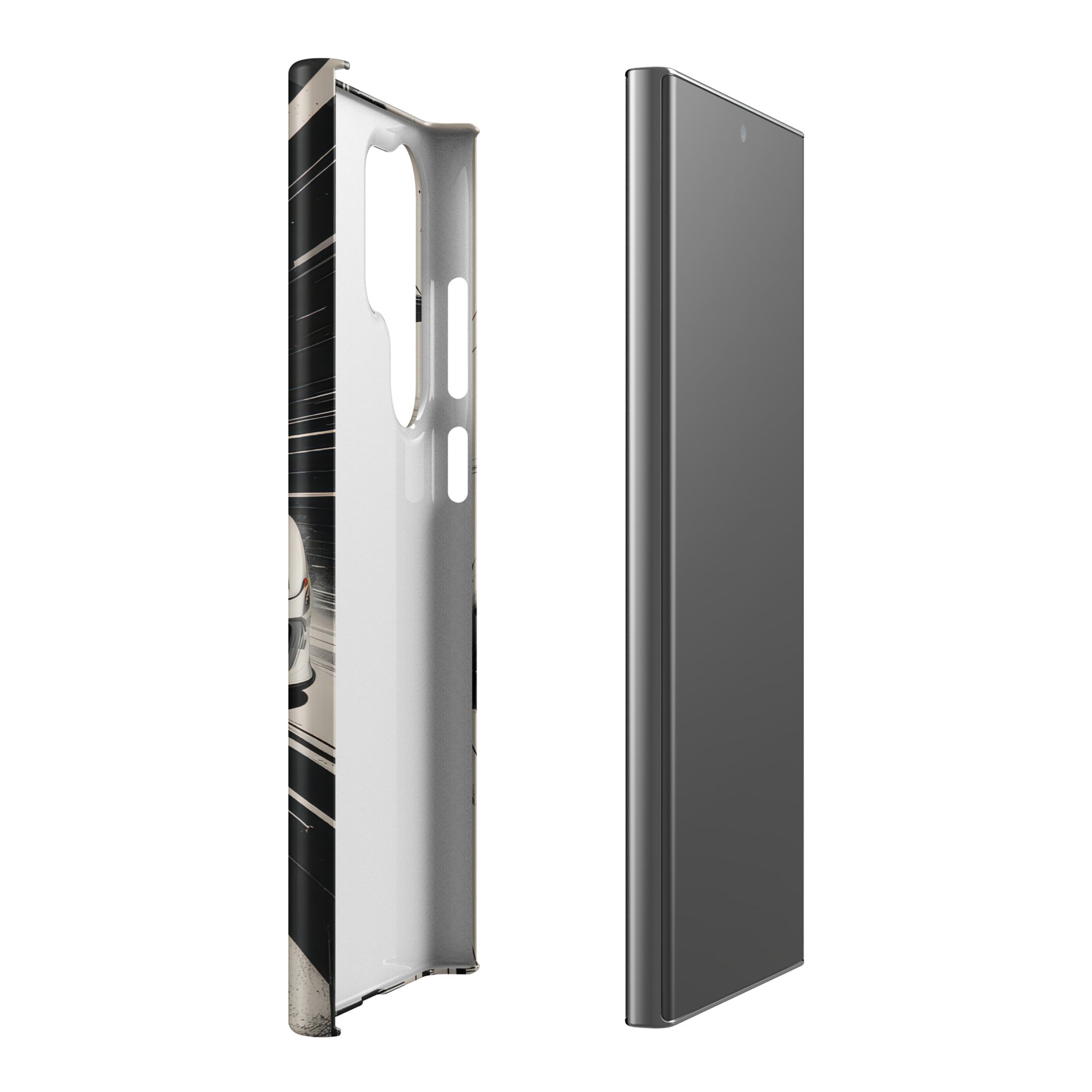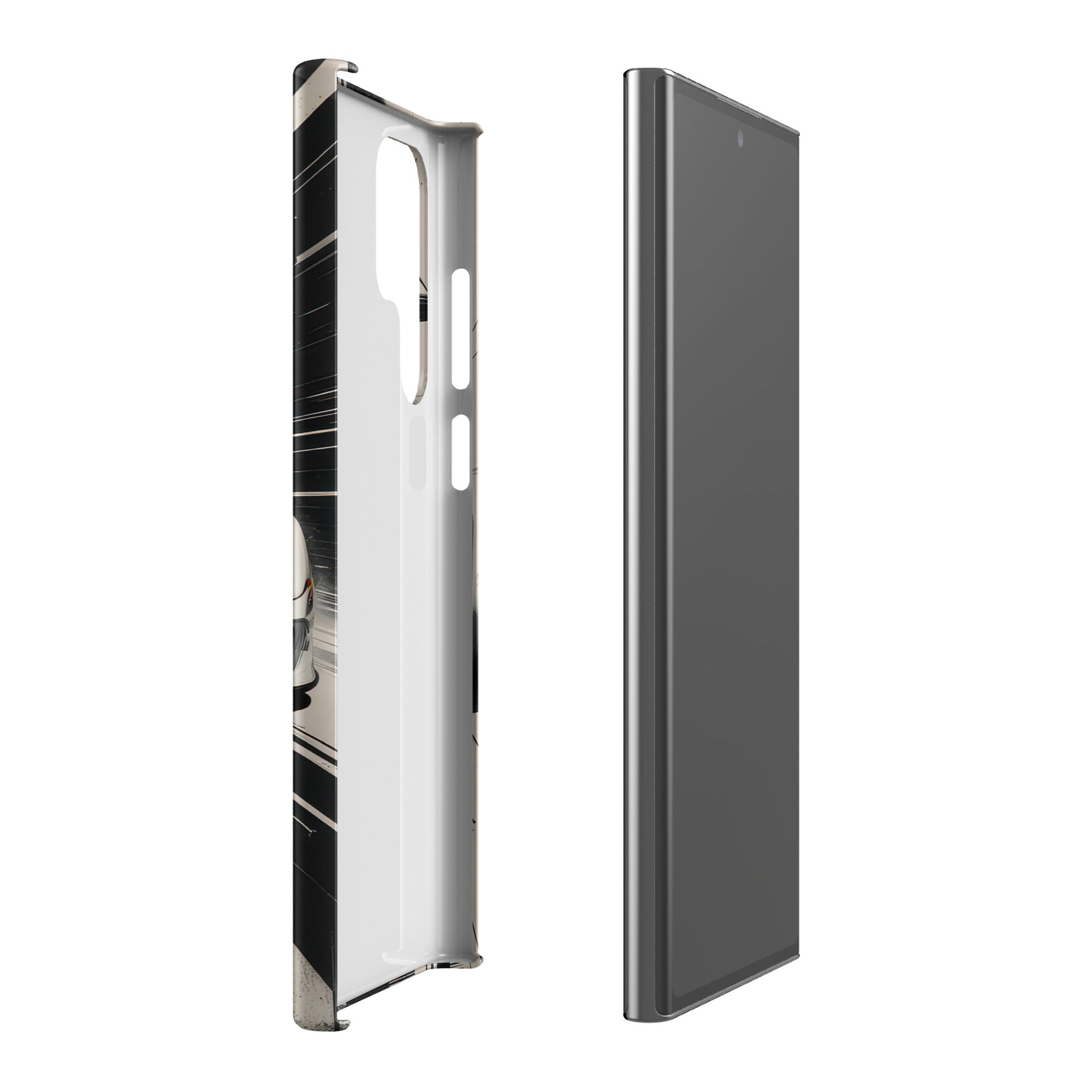Immerse yourself in the thrill of the race with this dynamic phone case, featuring a sleek white GT sports car with a vibrant blue racing stripe, set against a monochrome, high-speed blur background of abstract architectural elements. This design exudes speed and modern elegance, perfect for car enthusiasts and those who appreciate sophisticated, fast-paced aesthetics. Enjoy a lightweight and stylish shield with this Snap Case for Samsung®.