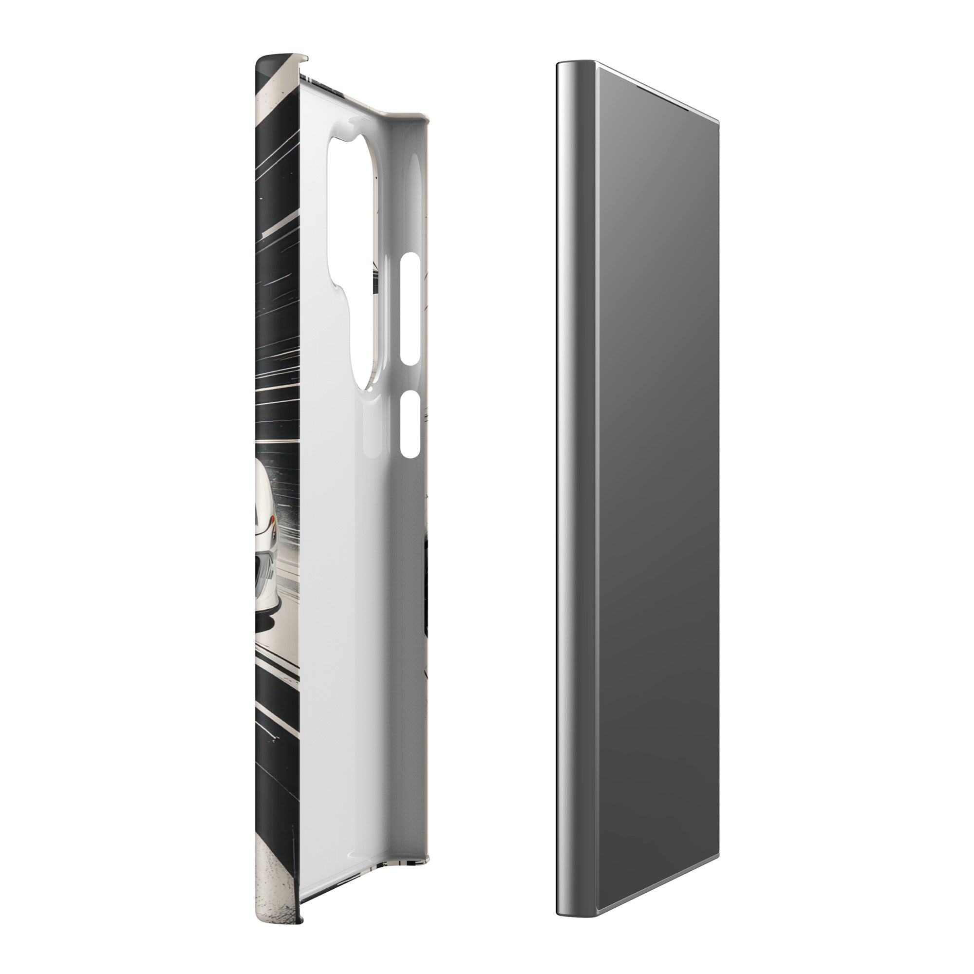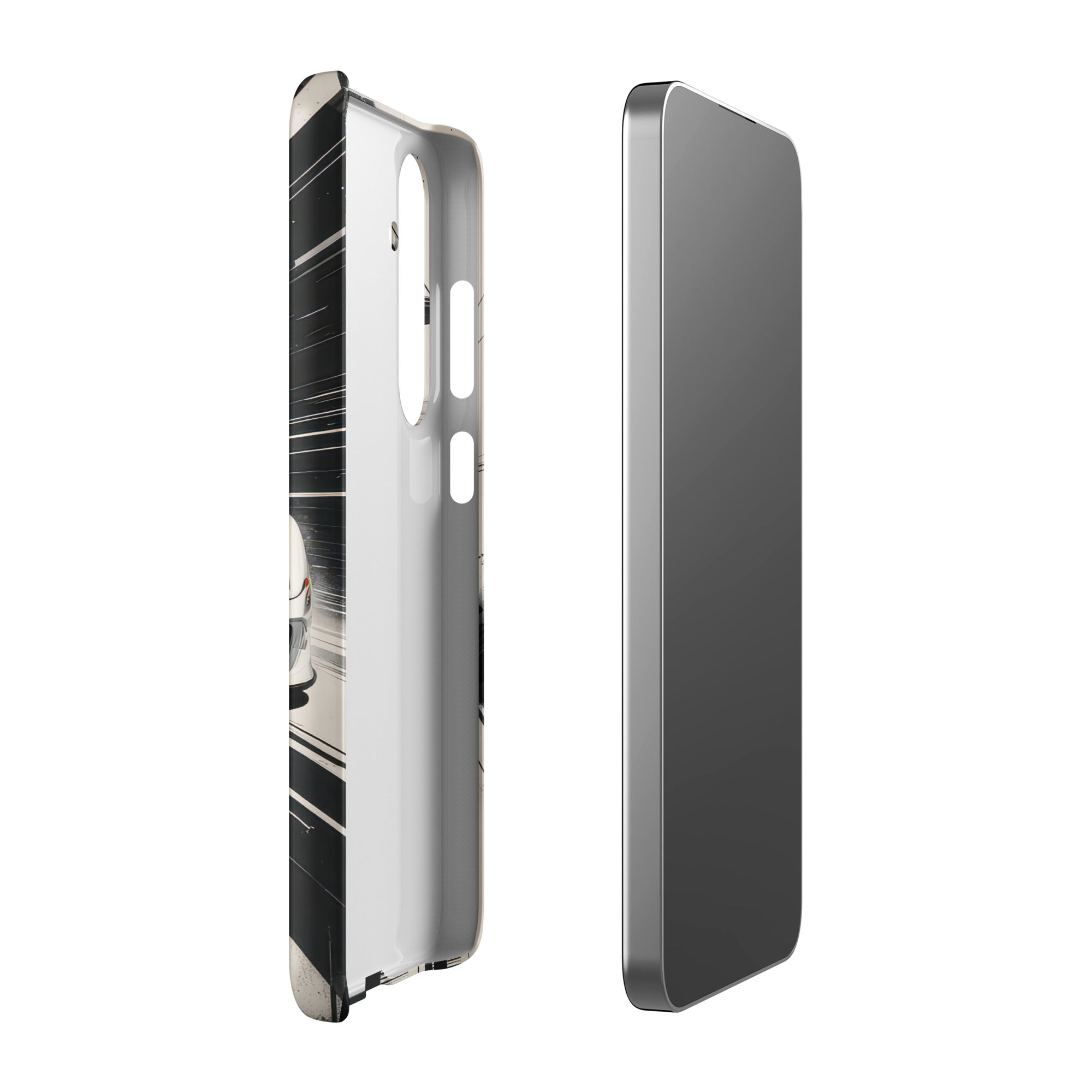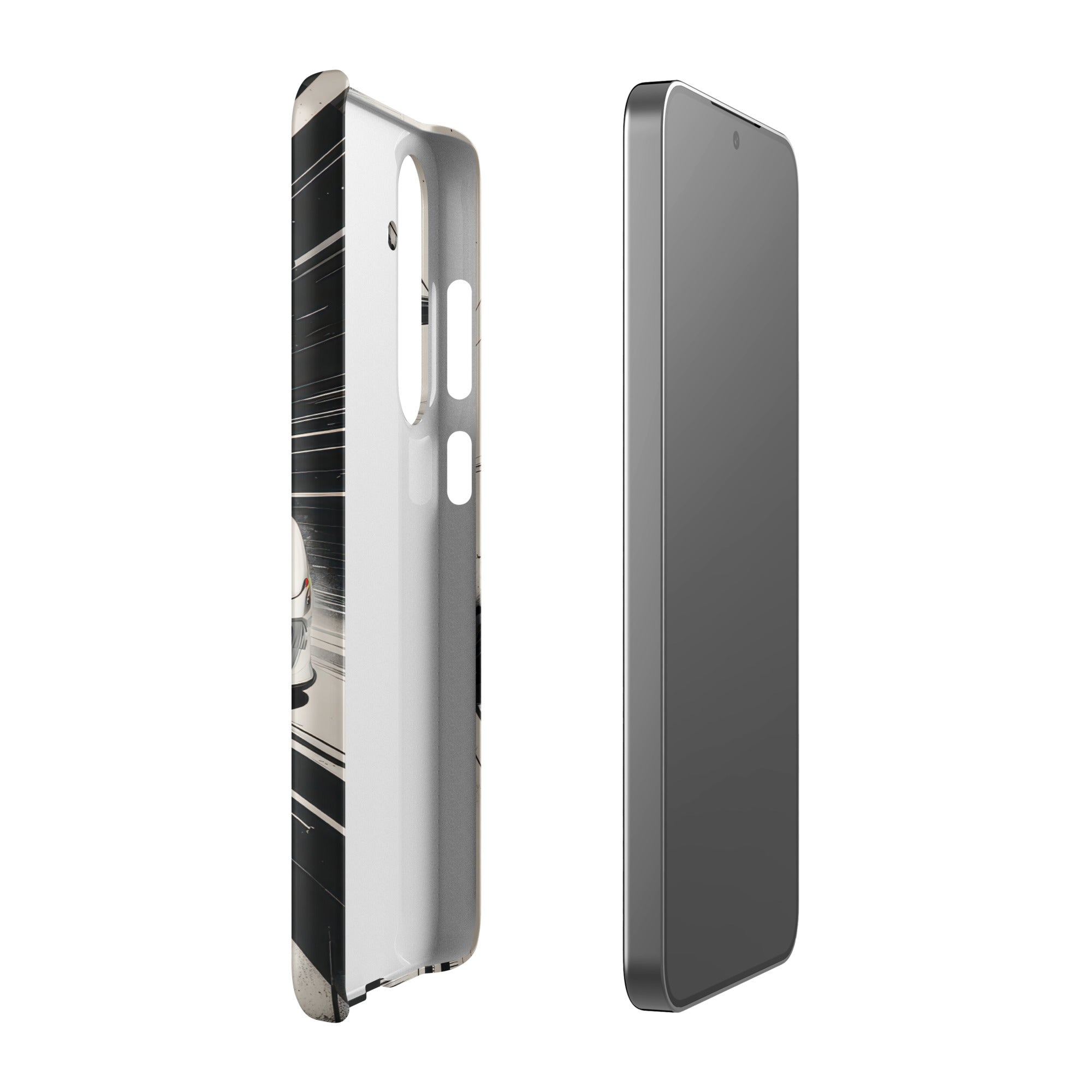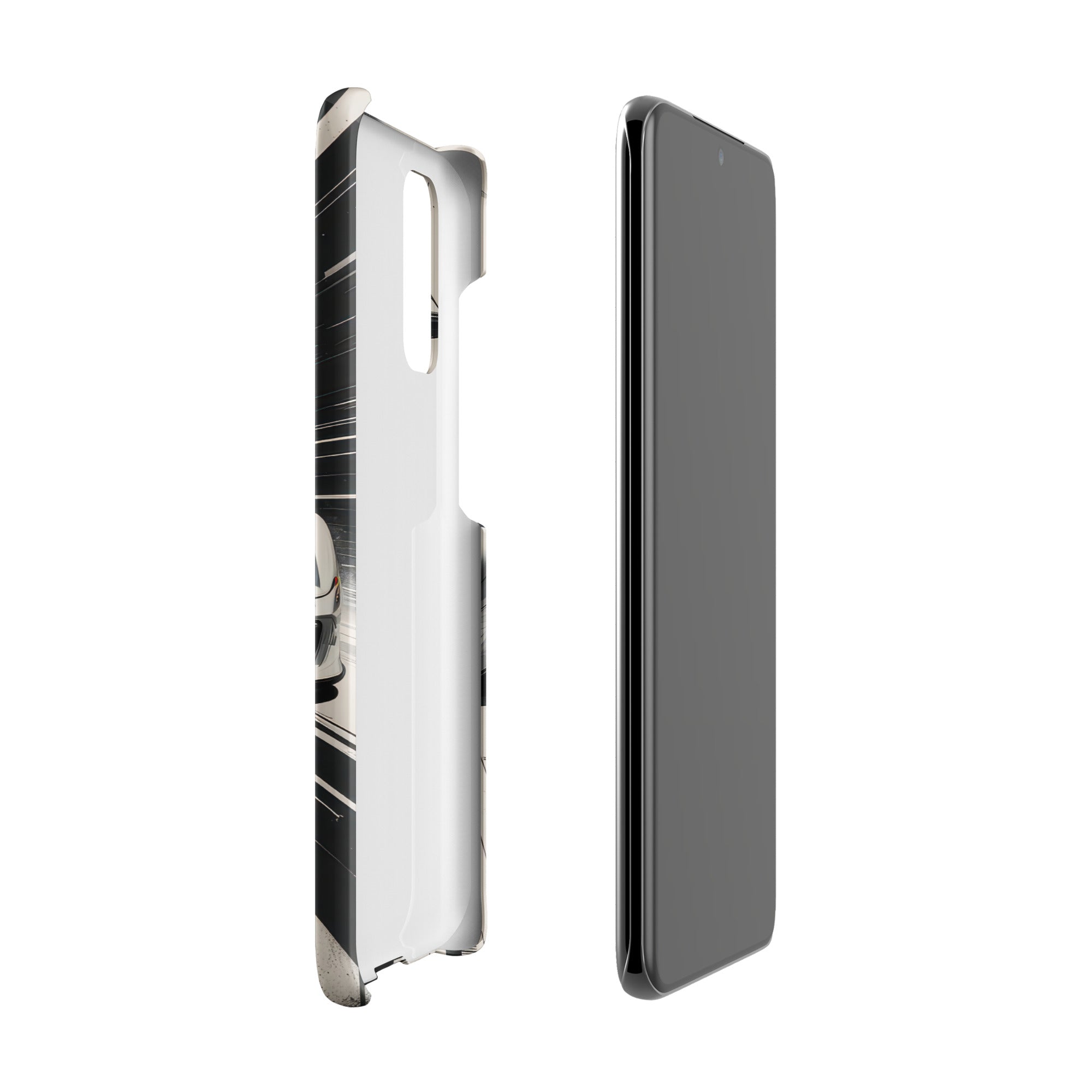Immerse yourself in the thrill of the race with this dynamic phone case, featuring a sleek white GT sports car with a vibrant blue racing stripe, set against a monochrome, high-speed blur background of abstract architectural elements. This design exudes speed and modern elegance, perfect for car enthusiasts and those who appreciate sophisticated, fast-paced aesthetics. Enjoy a lightweight and stylish shield with this Snap Case for Samsung®.