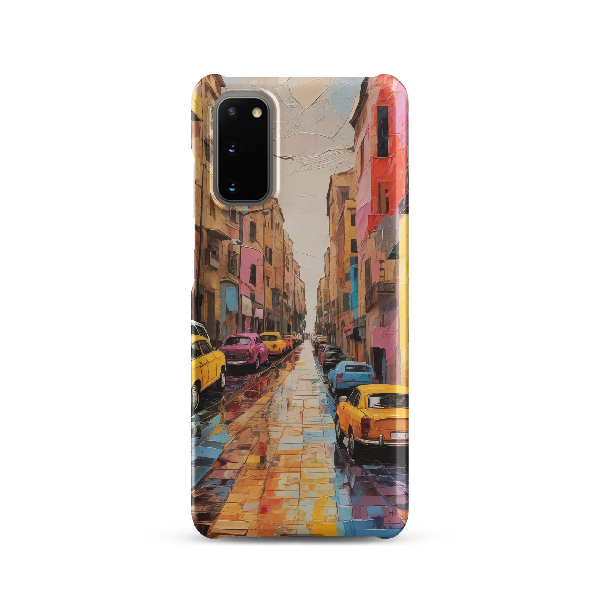 Immerse yourself in the bustling energy of an urban landscape with this vibrant phone case, featuring a painterly depiction of a city street ablaze with yellow, pink, blue, and purple buildings and cars, reflected artfully on a mosaic-like ground. This dynamic design captures the lively mood of a colorful metropolis, perfect for the free-spirited individual who loves artistic expression and a sleek, minimalist feel. Enjoy lightweight, stylish protection with this Snap Case for Samsung®.