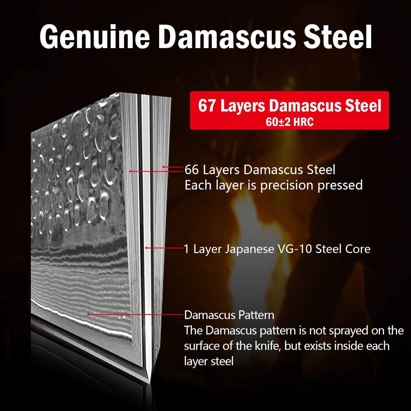 • 67-layer Damascus construction with a single VG-10 steel core for superior hardness and edge-holding.
