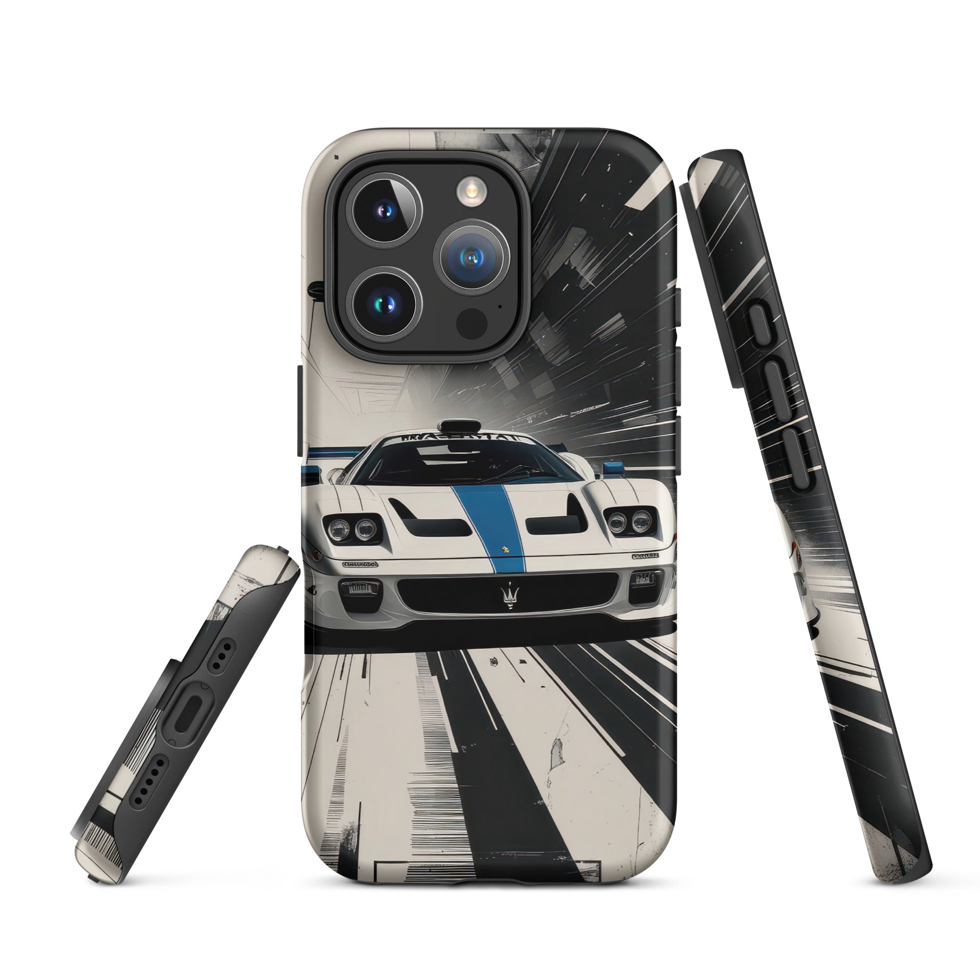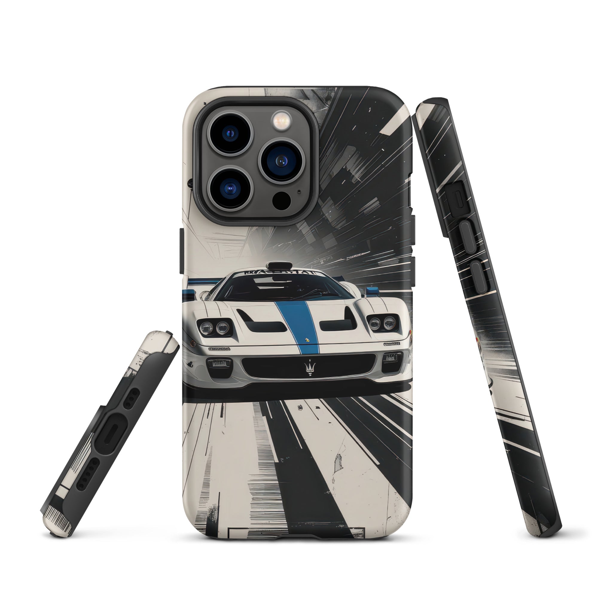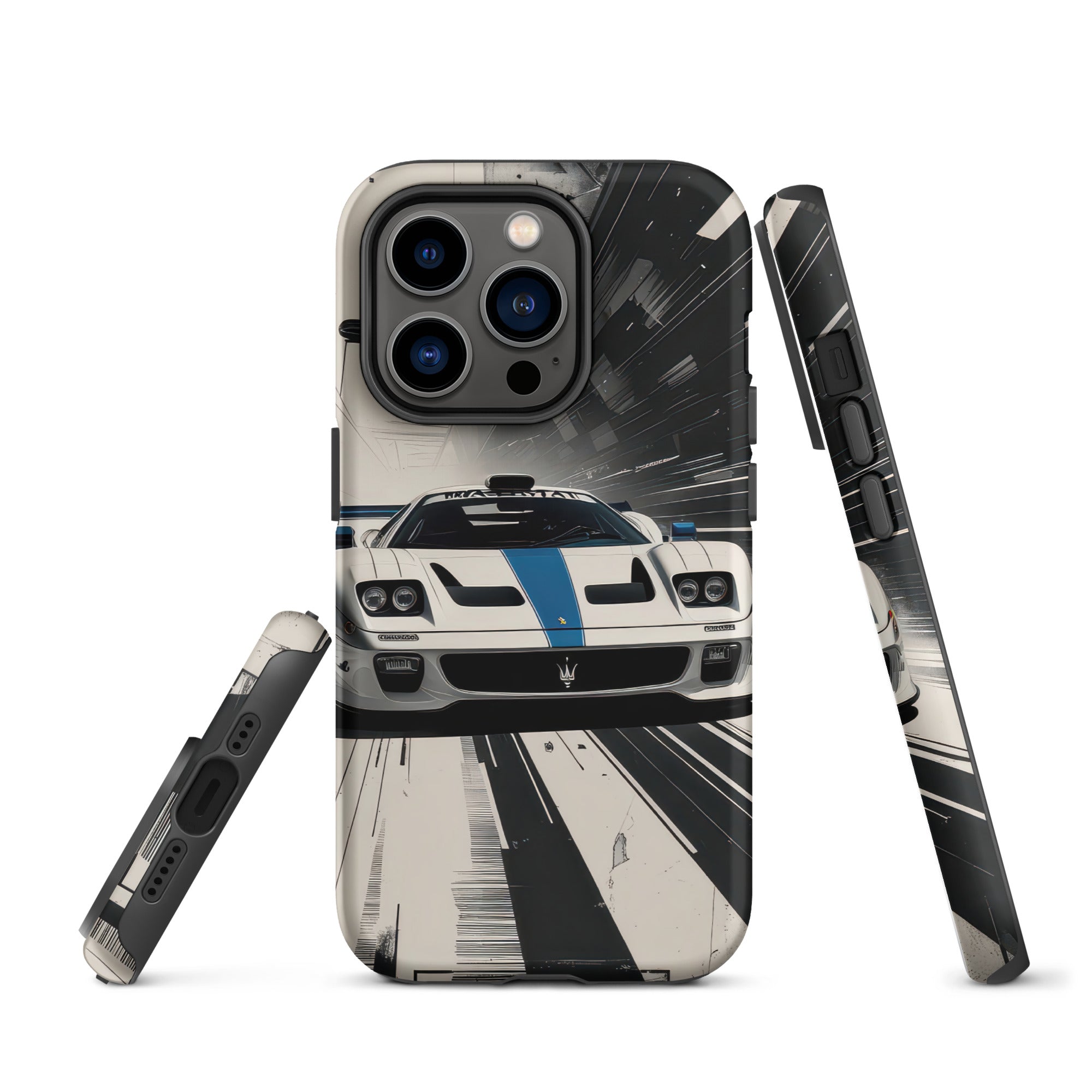 Embrace the thrill of the race with this bold artwork, depicting a sleek white supercar, distinguished by its vibrant blue stripe, surging forward through a high-speed, black and white abstract environment. This design embodies raw power and contemporary style, perfect for enthusiasts who demand both aesthetics and resilience from their gear. Experience ultimate protection with a robust, dual-layer defense system provided by this Tough Case for iPhone®.