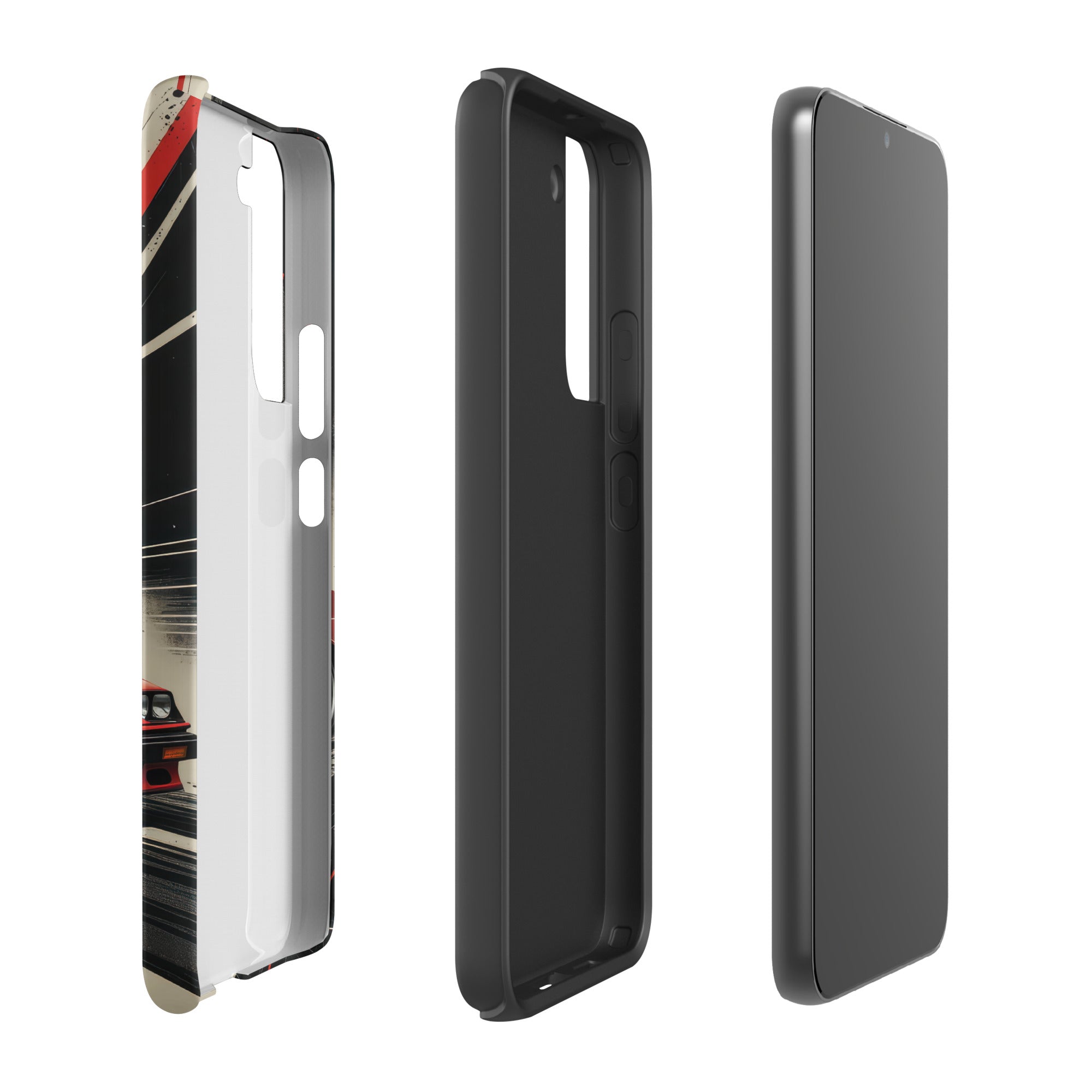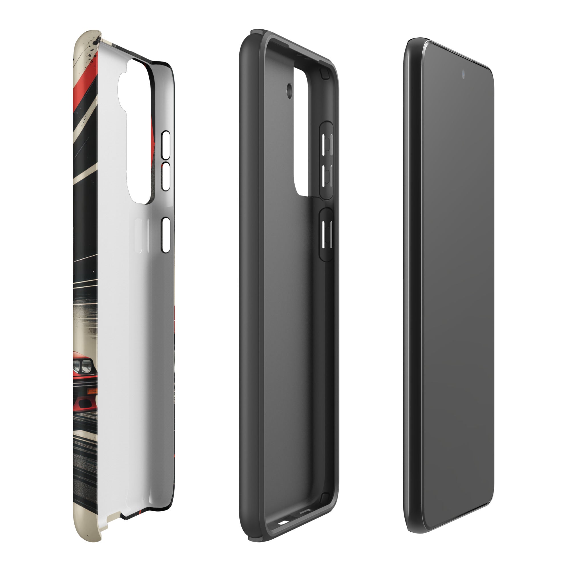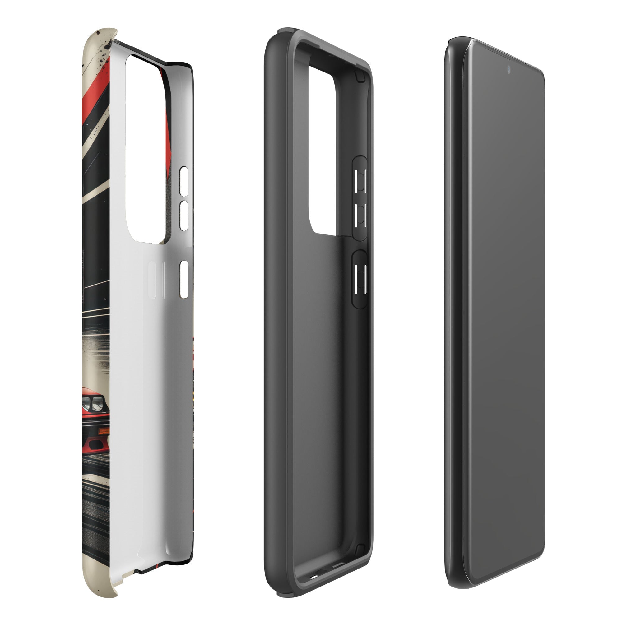 Capture the exhilarating spirit of the open road with this dynamic phone case, featuring a vibrant red vintage sports car—the iconic Ferrari Testarossa—rendered in a bold, graphic art style. Streaks of black, white, and red evoke a powerful sense of motion and speed, perfect for those who appreciate classic automotive design and energetic aesthetics. This case feels robust yet refined, designed for car enthusiasts and style-conscious individuals who demand both flair and function from their accessories. Enjoy dependable dual-layer defense with this Tough Case for Samsung®.