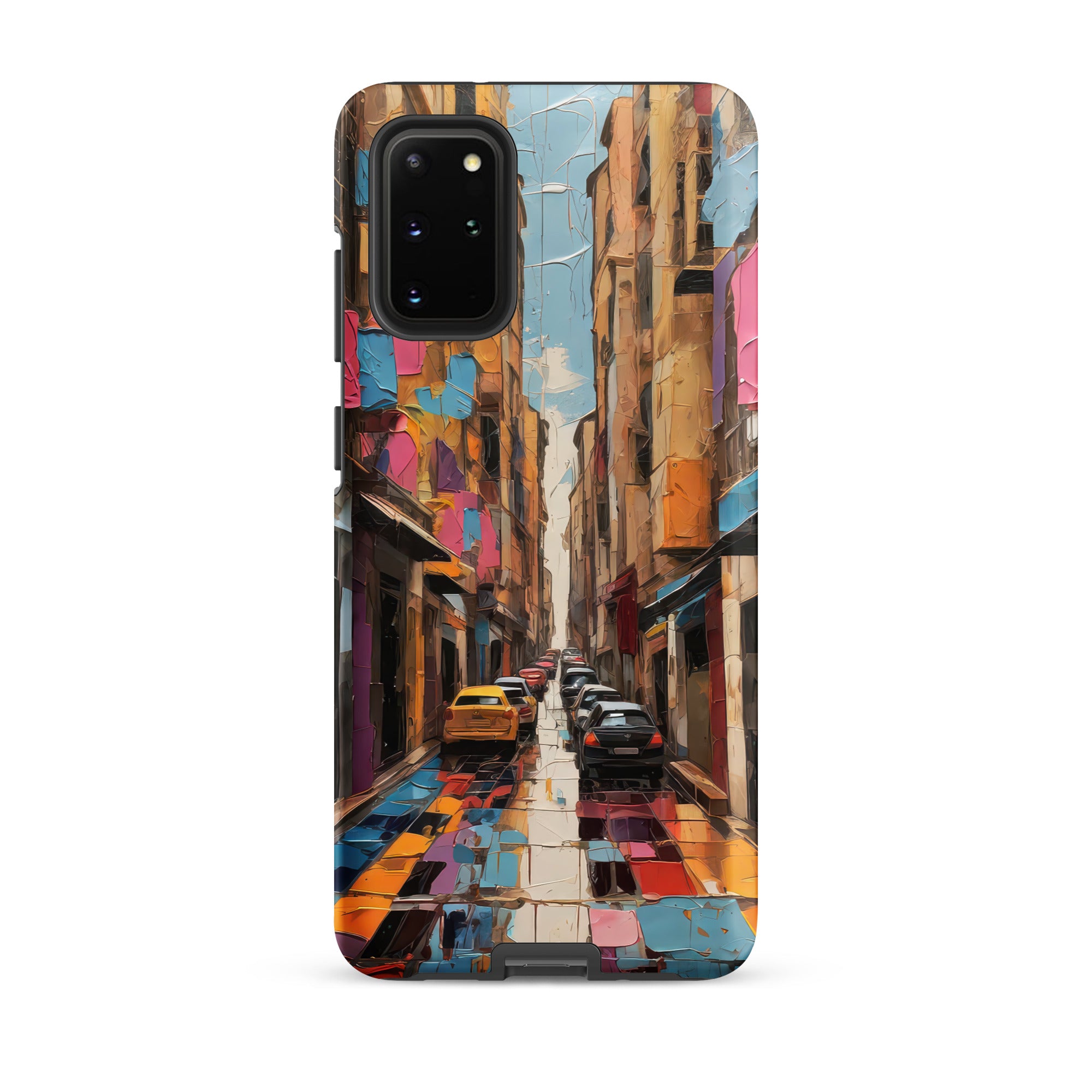 Immerse your device in the vivid hues of a bustling urban landscape with this phone case, showcasing an impressionistic street scene. Rich oranges, yellows, and blues mingle with bold pinks, purples, and reds across buildings and a striking, reflective mosaic-like street, evoking the feel of a vibrant, sun-drenched alleyway. This artwork transforms your phone into a portable gallery piece, feeling sturdy and secure in your hand. Enjoy dependable dual-layer defense with this Tough Case for Samsung®.