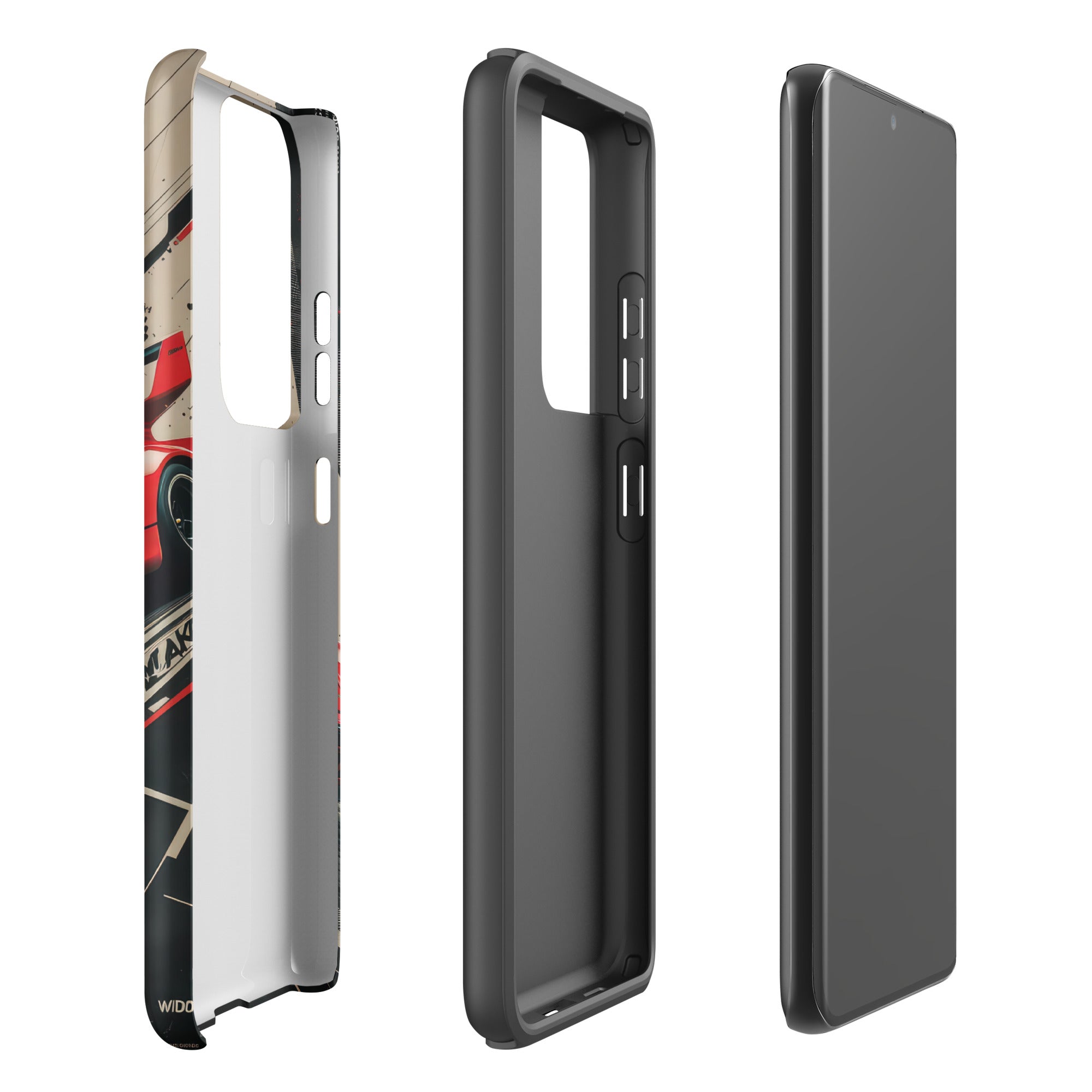 The artwork showcases a striking red classic sports car, reminiscent of a powerful Porsche 911 with a distinctive whale tail spoiler, captured in dynamic motion. Bold black and white abstract lines streak across a light background, conveying a thrilling sense of speed and energy, complemented by subtle red accents and a contrasting dark lower section. Perfect for car enthusiasts, speed lovers, and anyone who appreciates iconic automotive design combined with robust protection. This case brings a surge of adrenaline and classic style to your everyday carry. Enjoy dependable dual-layer defense with this Tough Case for Samsung®.