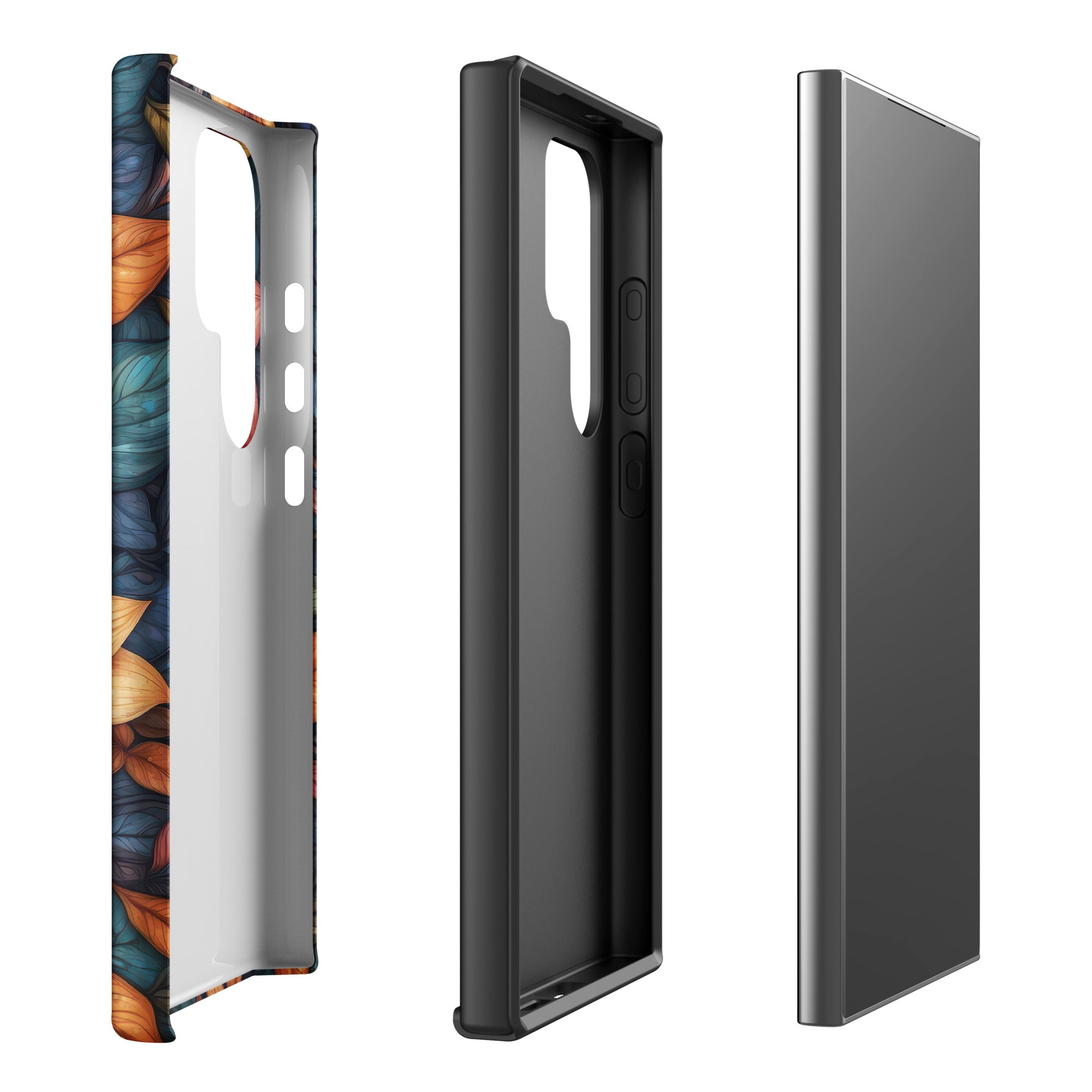 Immerse your device in the lush beauty of nature with this case, featuring a rich, dense pattern of stylized floral blooms and leaves. Large, multi-petaled flowers in warm coral-red and vibrant golden-orange tones stand out against a backdrop of deep teal and faded blue-green leaves, creating a sophisticated autumnal garden feel. This design offers a touch of vibrant elegance and natural beauty, perfect for those who appreciate botanical art and want to carry a piece of lush garden charm with them. Enjoy dependable dual-layer defense with this Tough Case for Samsung®.