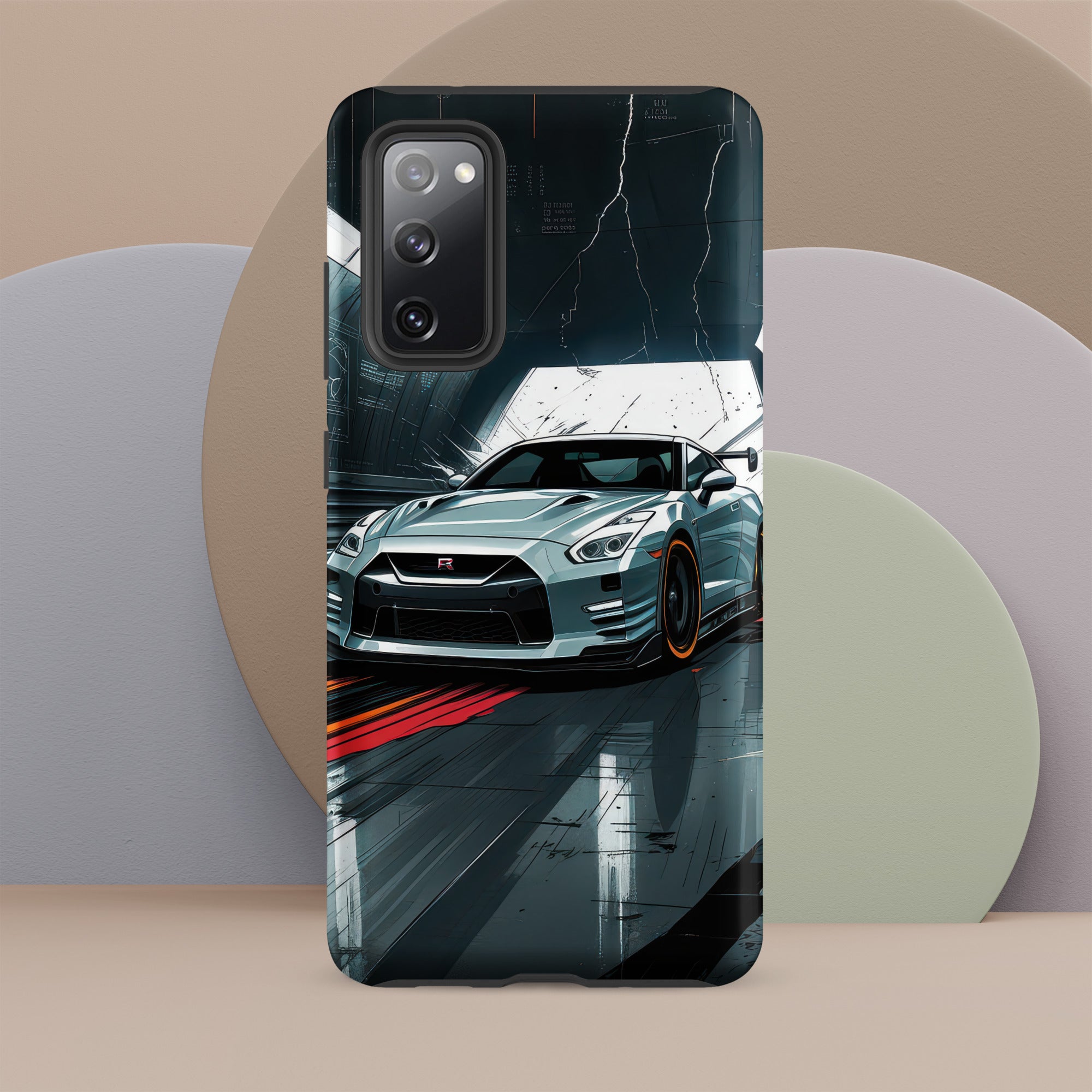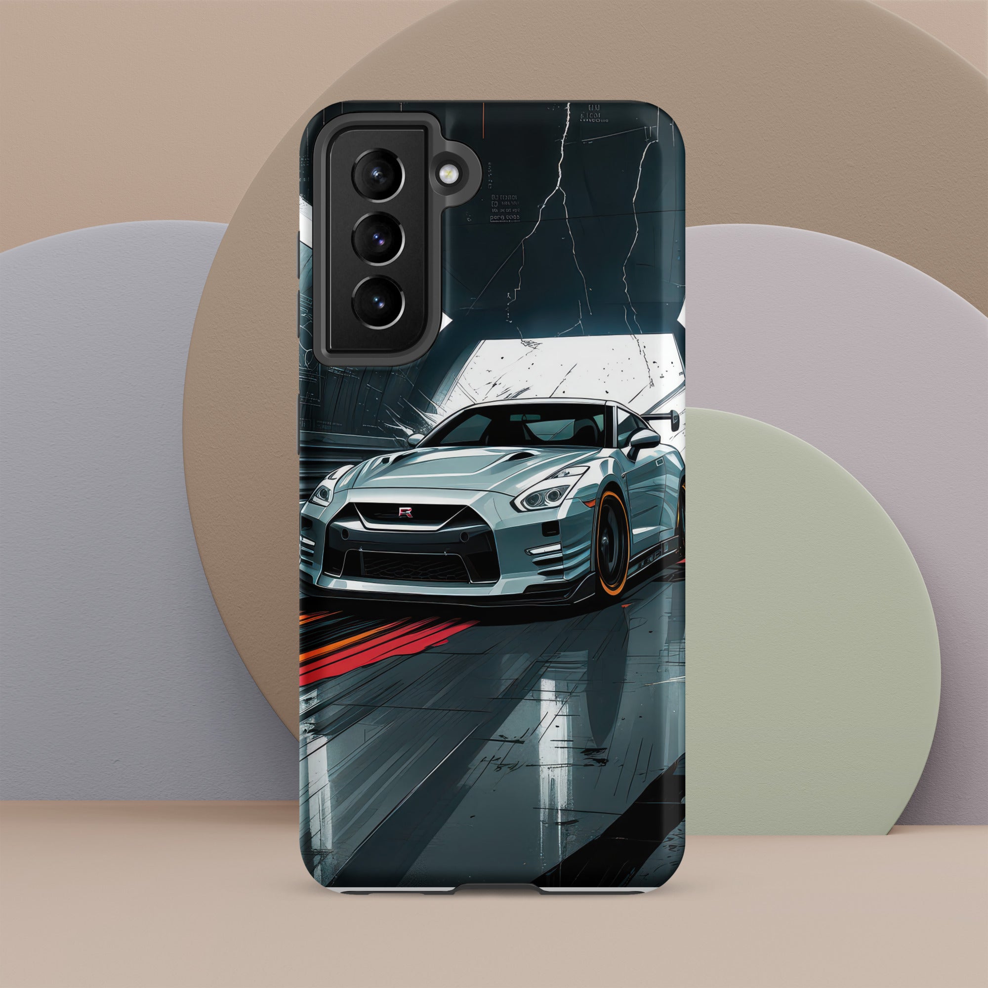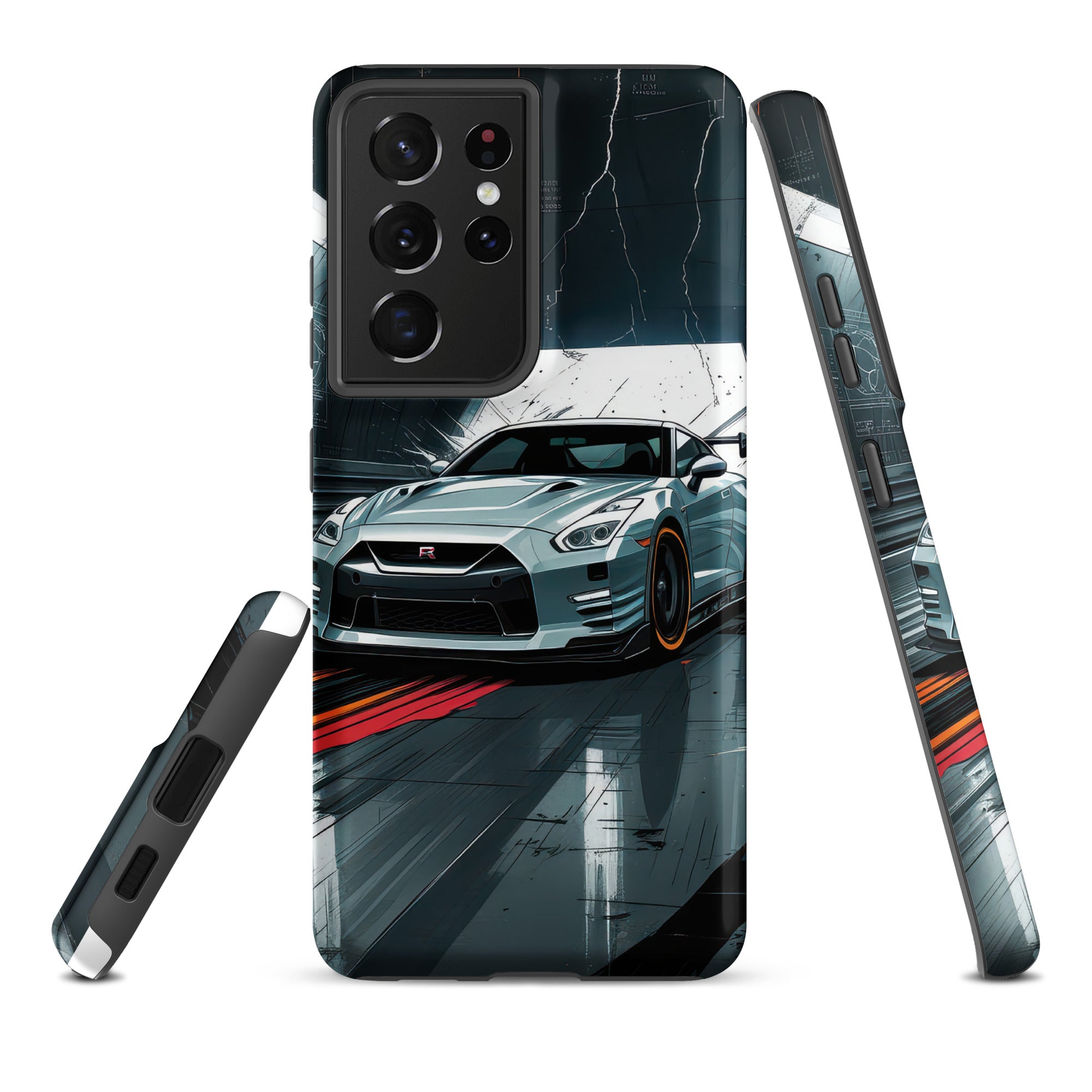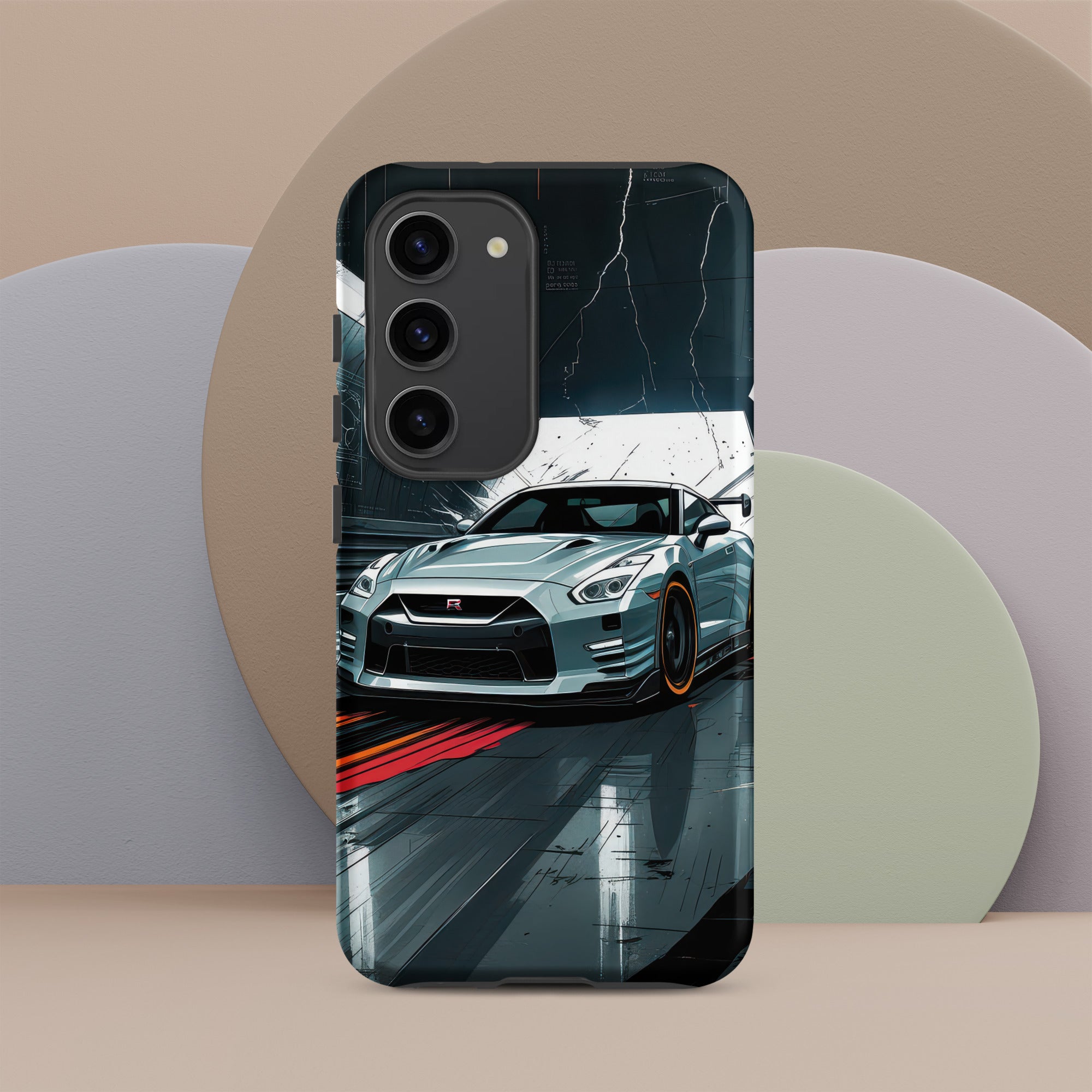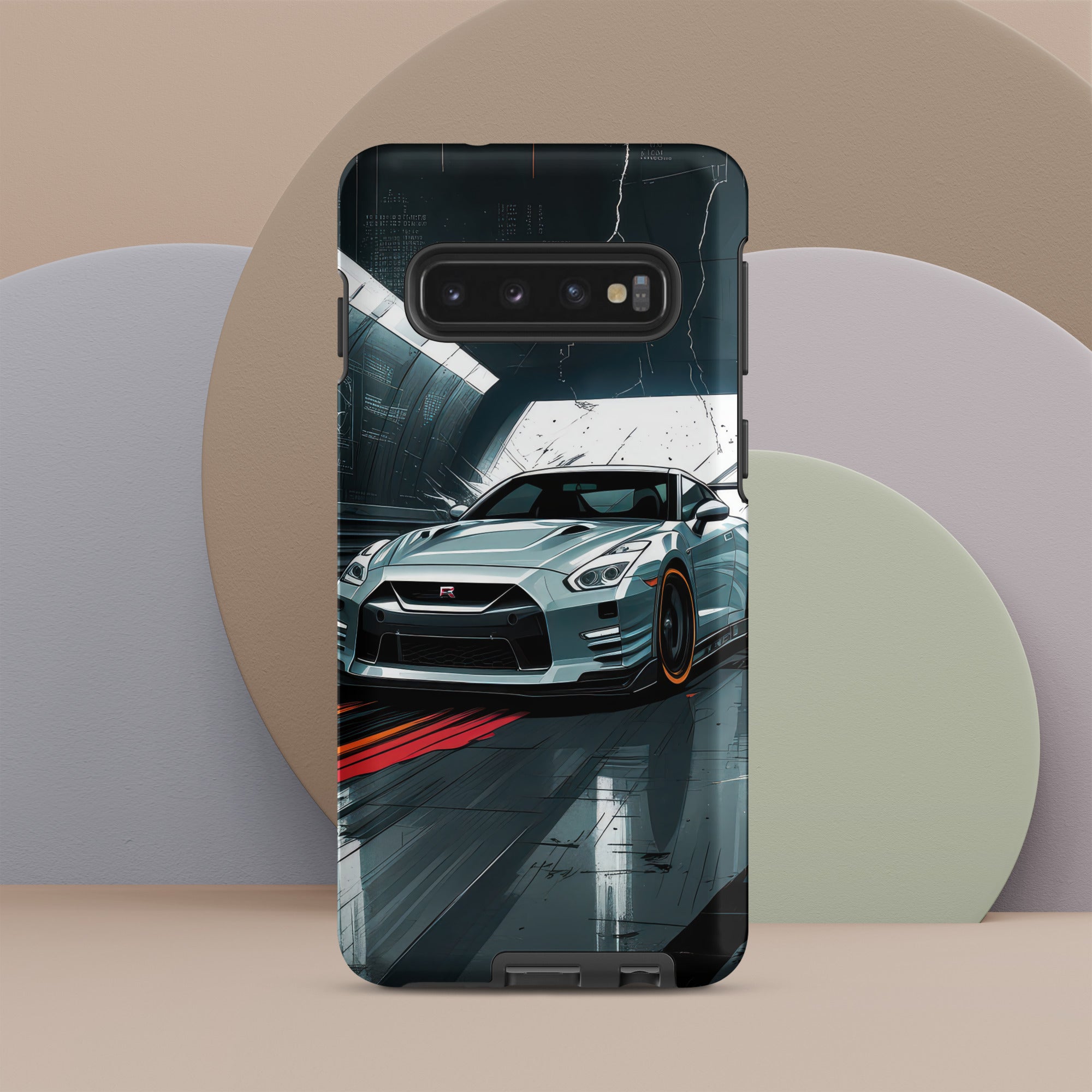The artwork features a sleek, light silver/gray sports car, likely a Nissan GT-R, bursting through a futuristic, metallic tunnel. Dynamic orange and red road lines streak past, contrasting with the cool grays and blues of the high-tech background, which includes abstract circuit patterns. The overall mood is one of exhilarating speed and cutting-edge design. This case offers a secure grip and a statement-making aesthetic for those who appreciate automotive power and modern artistry. Enjoy dependable dual-layer defense with this Tough Case for Samsung®.