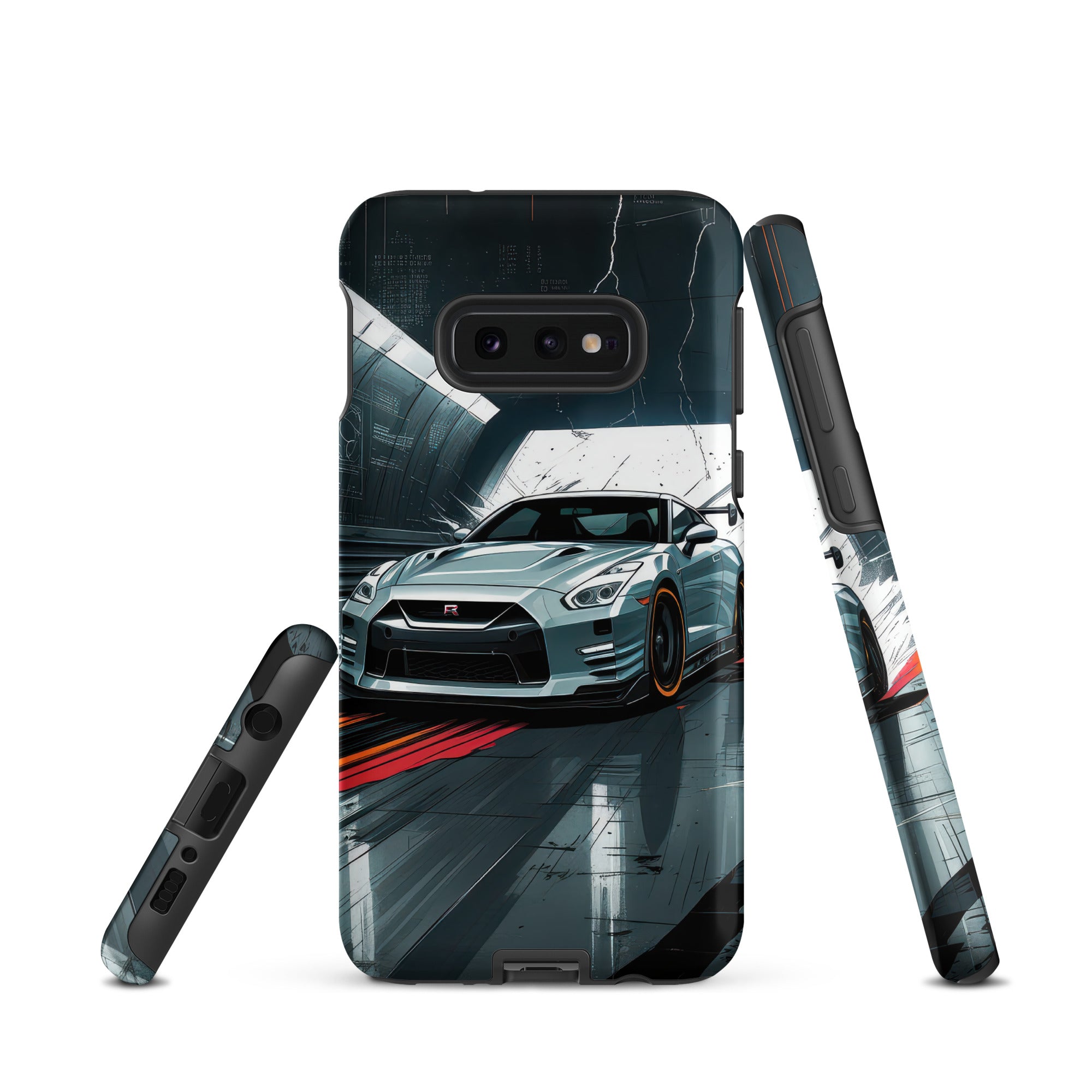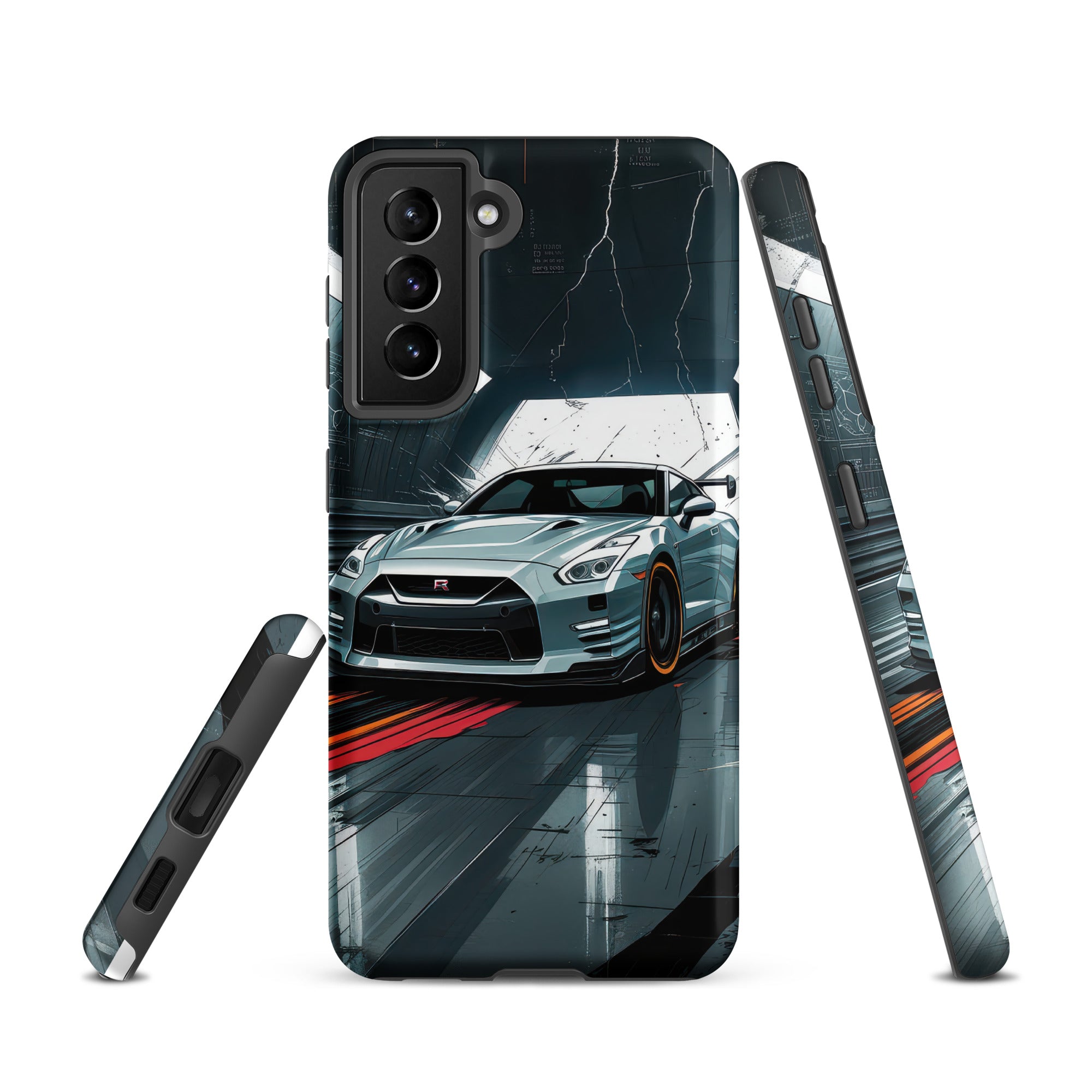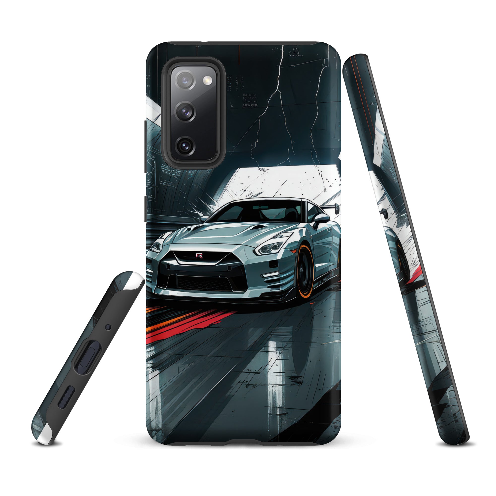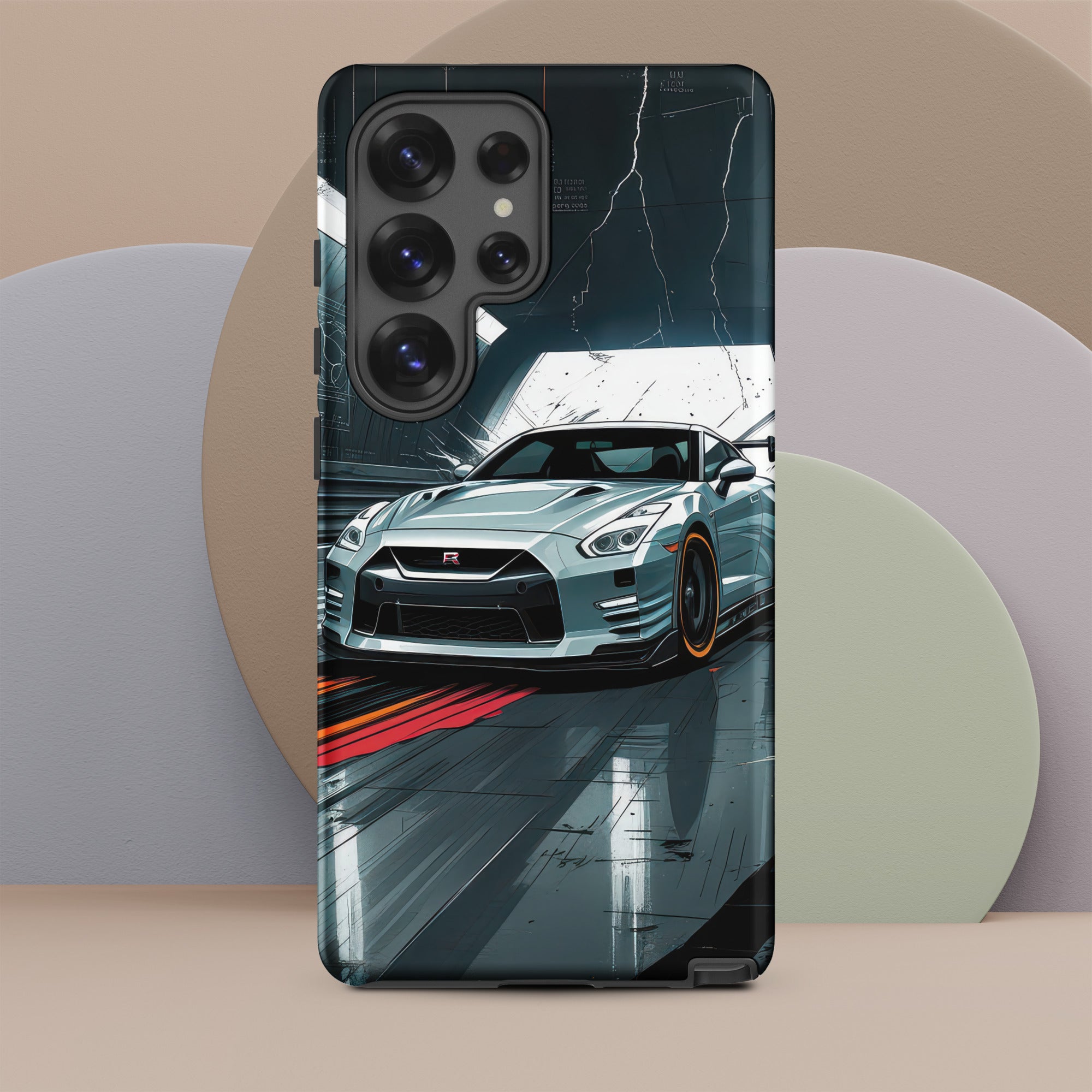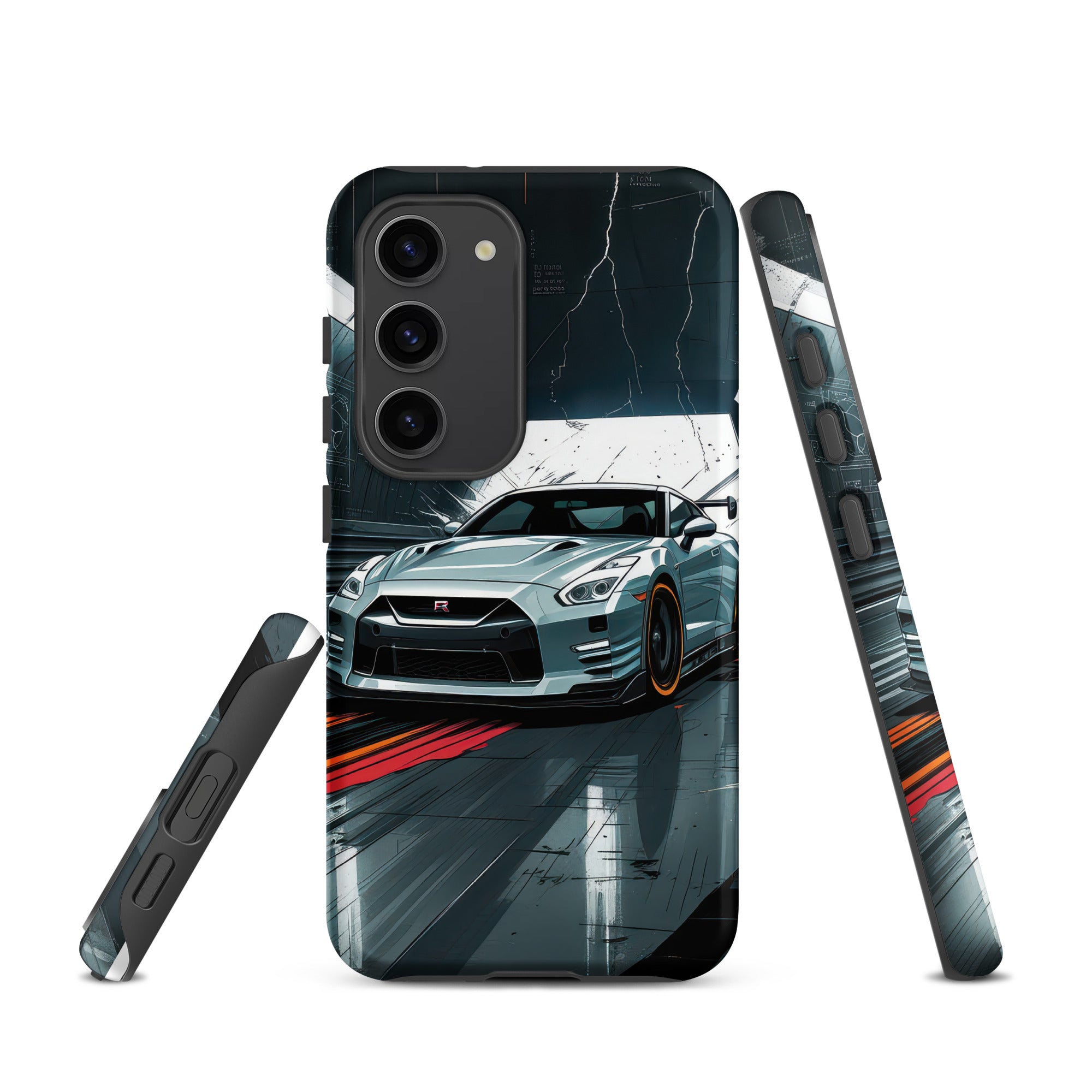 The artwork features a sleek, light silver/gray sports car, likely a Nissan GT-R, bursting through a futuristic, metallic tunnel. Dynamic orange and red road lines streak past, contrasting with the cool grays and blues of the high-tech background, which includes abstract circuit patterns. The overall mood is one of exhilarating speed and cutting-edge design. This case offers a secure grip and a statement-making aesthetic for those who appreciate automotive power and modern artistry. Enjoy dependable dual-layer defense with this Tough Case for Samsung®.
