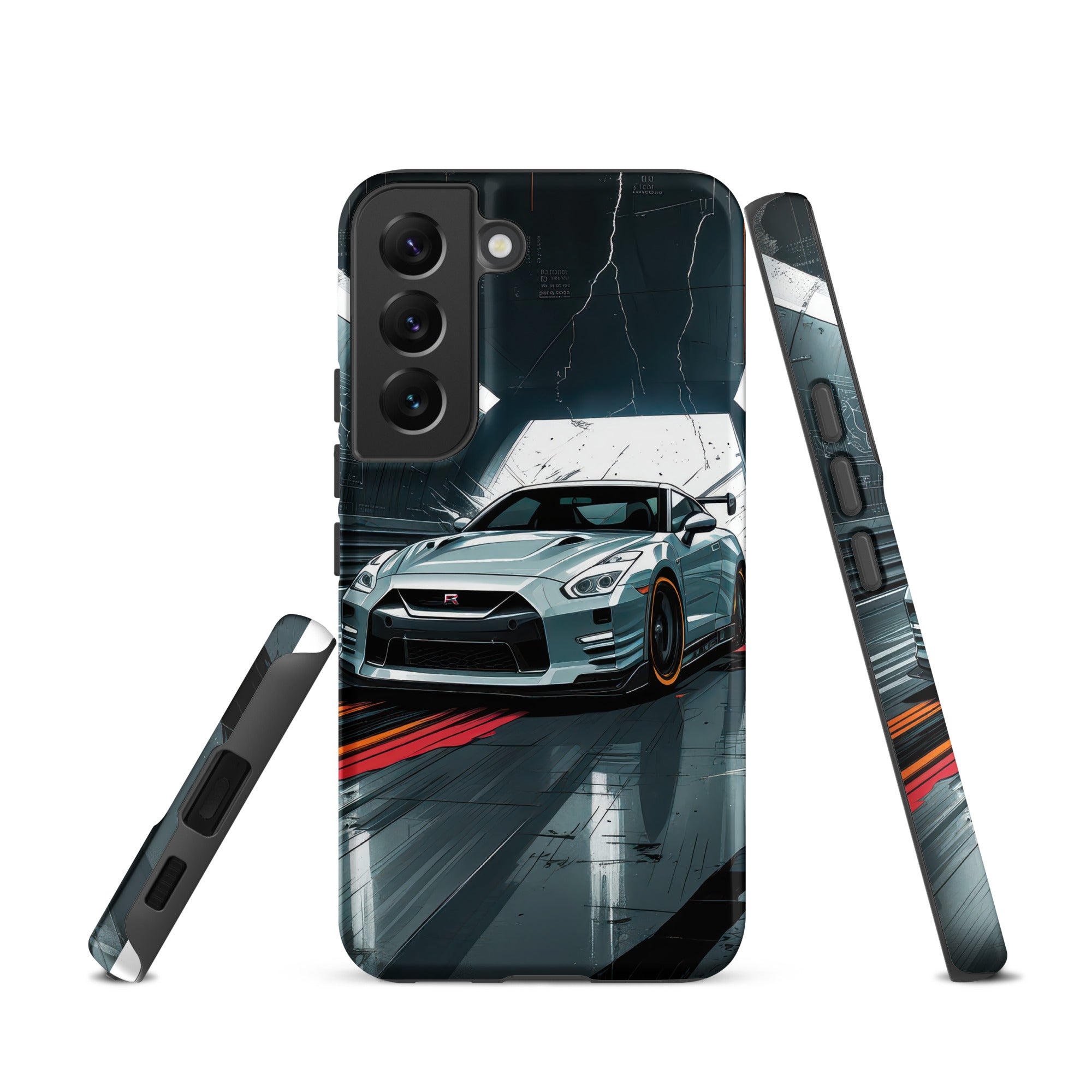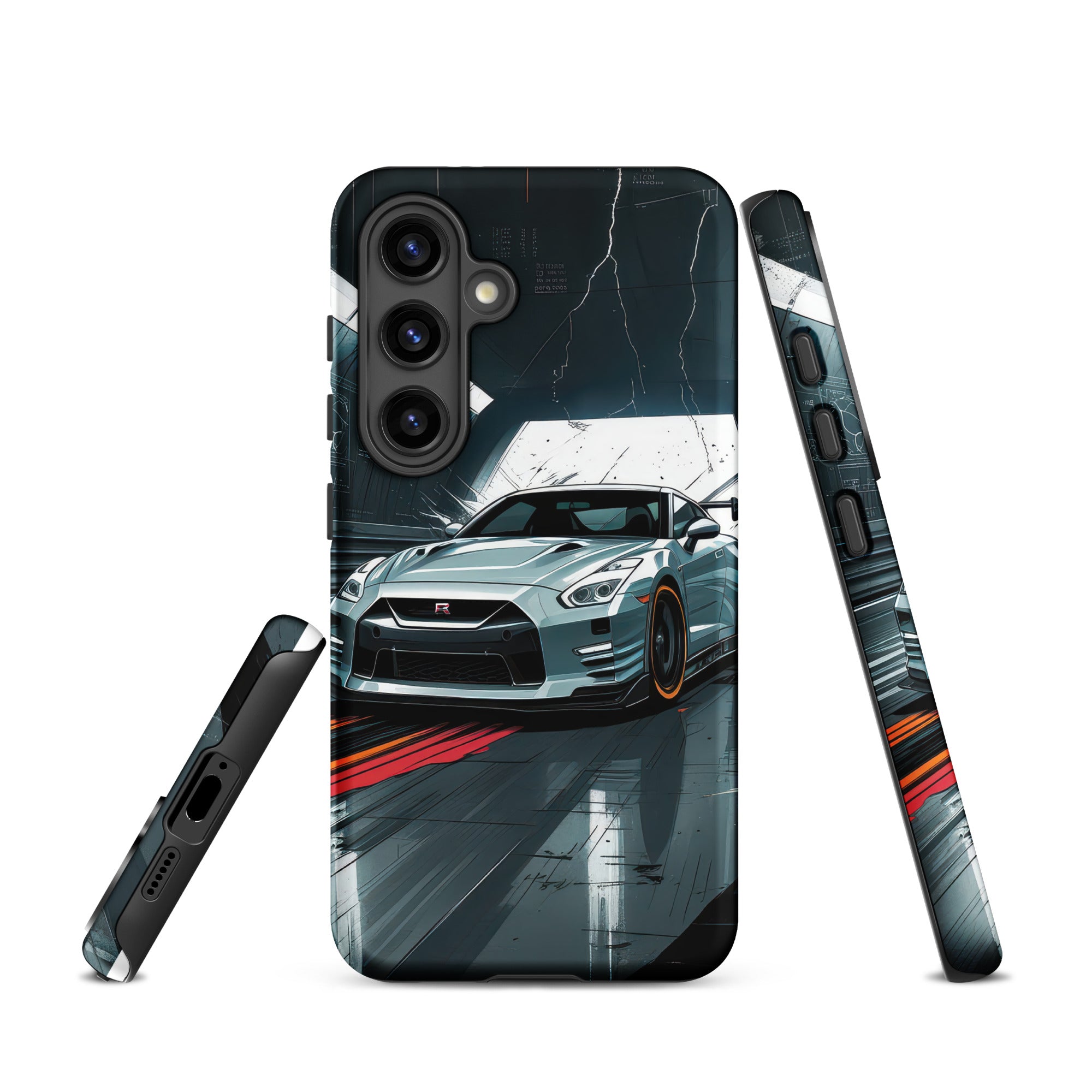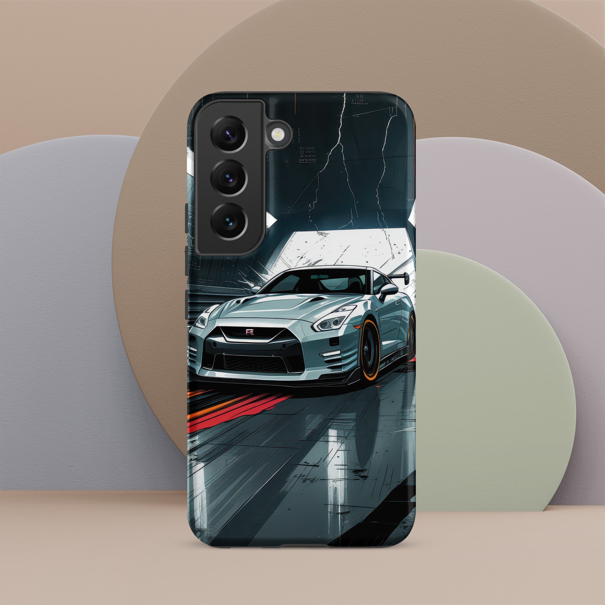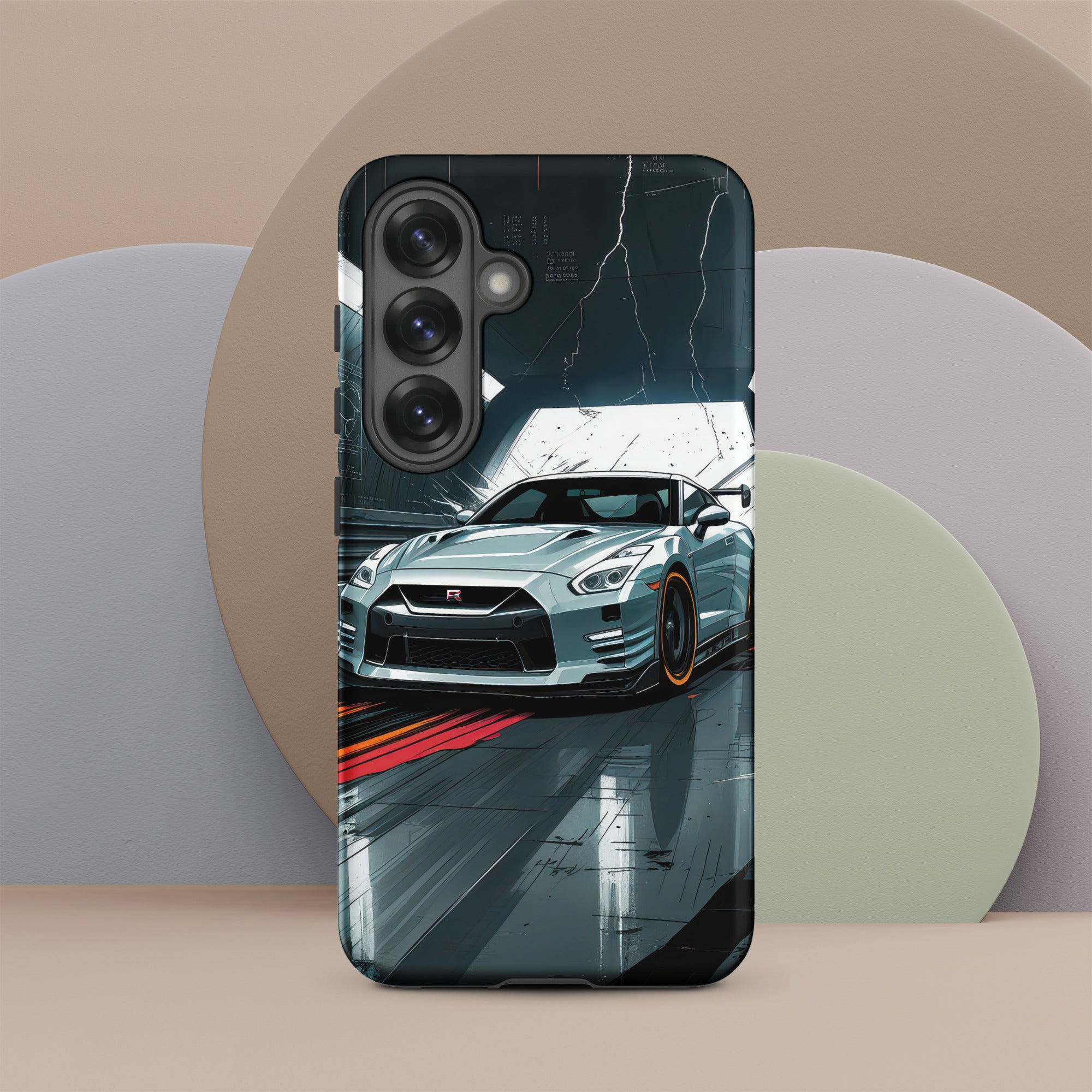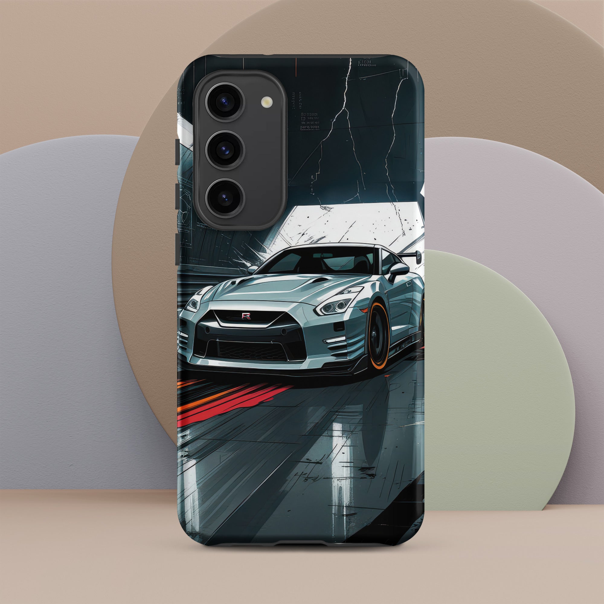 The artwork features a sleek, light silver/gray sports car, likely a Nissan GT-R, bursting through a futuristic, metallic tunnel. Dynamic orange and red road lines streak past, contrasting with the cool grays and blues of the high-tech background, which includes abstract circuit patterns. The overall mood is one of exhilarating speed and cutting-edge design. This case offers a secure grip and a statement-making aesthetic for those who appreciate automotive power and modern artistry. Enjoy dependable dual-layer defense with this Tough Case for Samsung®.