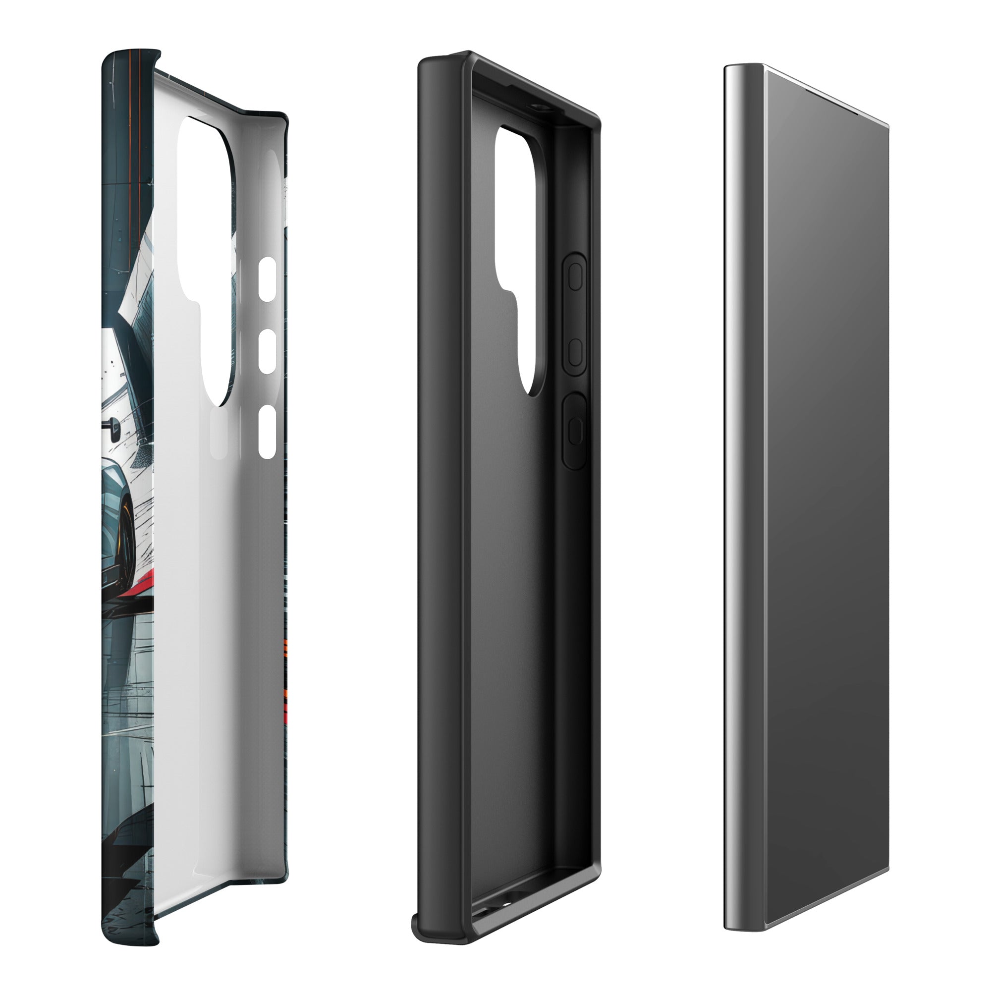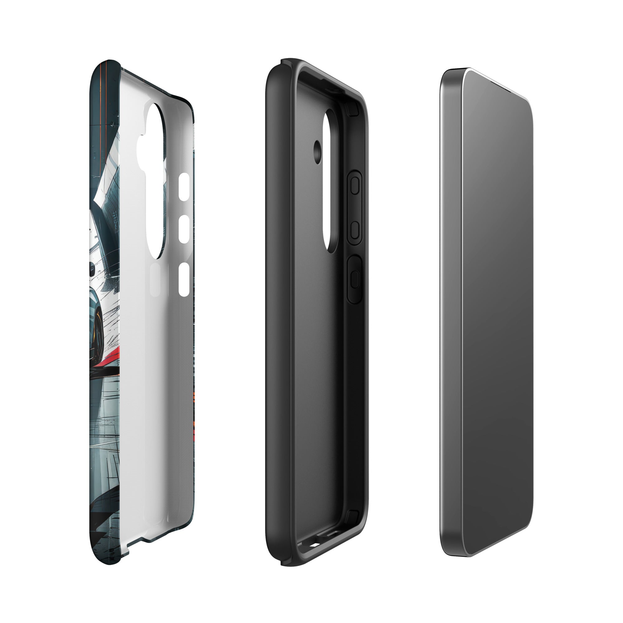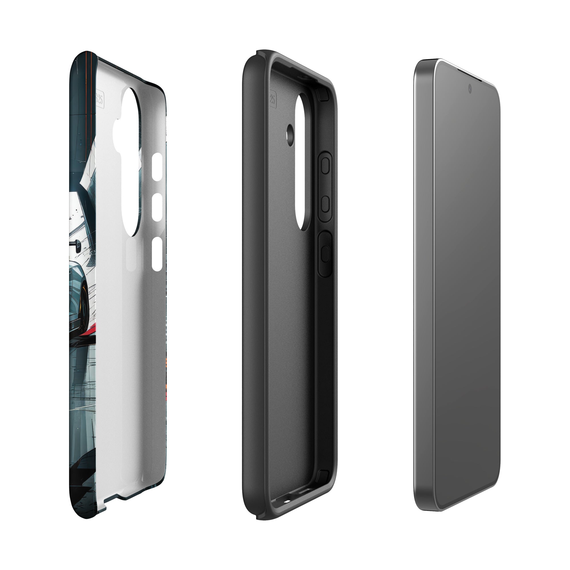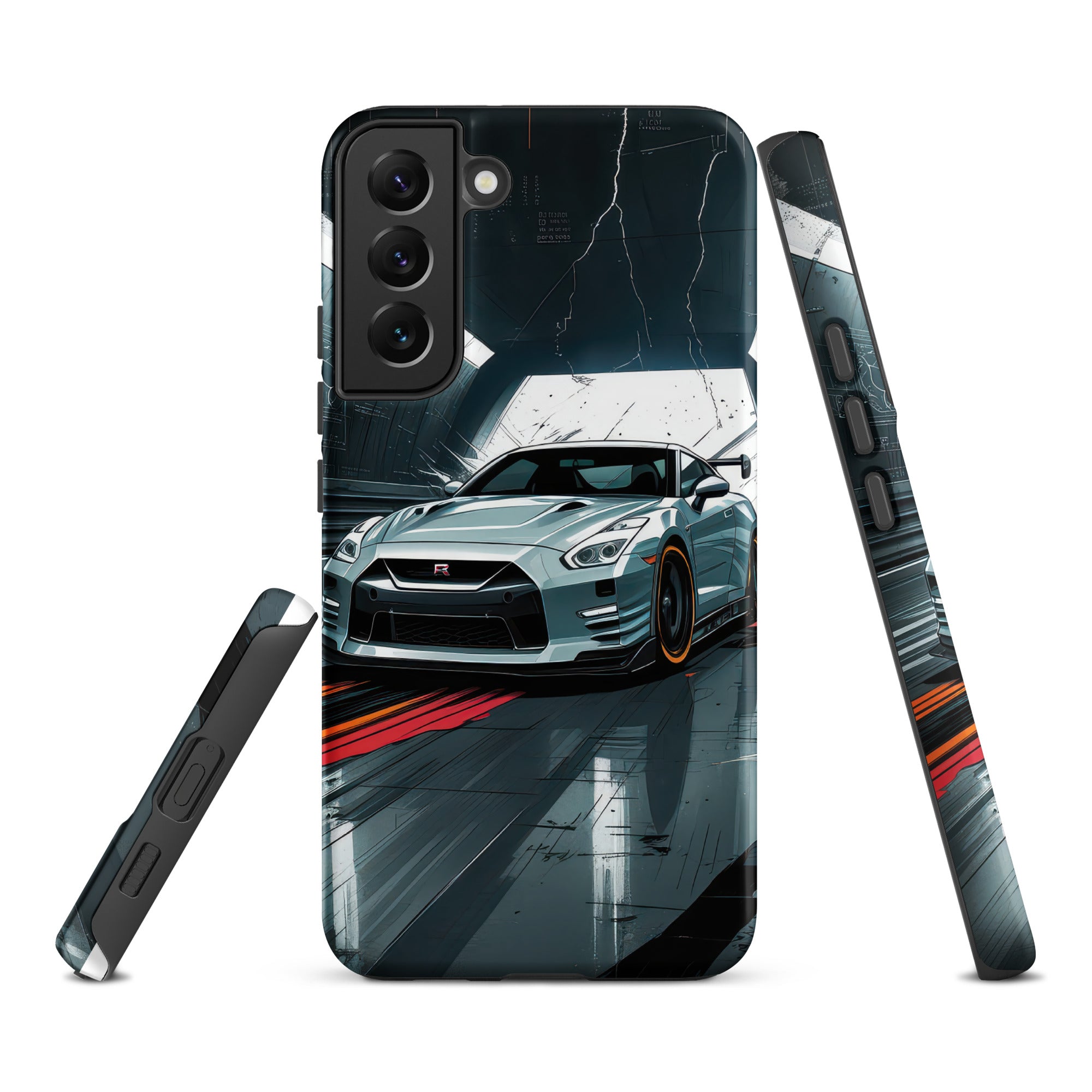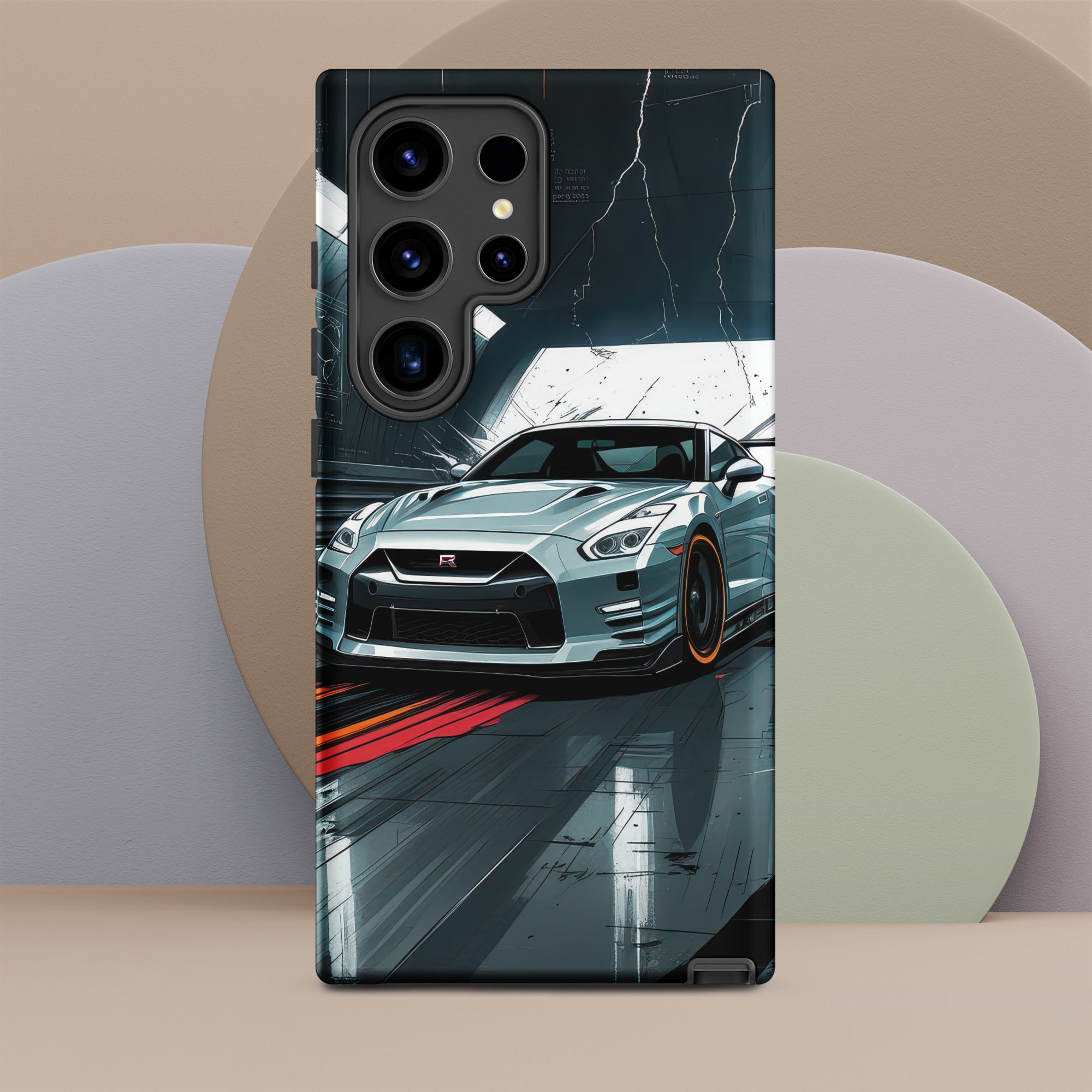 The artwork features a sleek, light silver/gray sports car, likely a Nissan GT-R, bursting through a futuristic, metallic tunnel. Dynamic orange and red road lines streak past, contrasting with the cool grays and blues of the high-tech background, which includes abstract circuit patterns. The overall mood is one of exhilarating speed and cutting-edge design. This case offers a secure grip and a statement-making aesthetic for those who appreciate automotive power and modern artistry. Enjoy dependable dual-layer defense with this Tough Case for Samsung®.