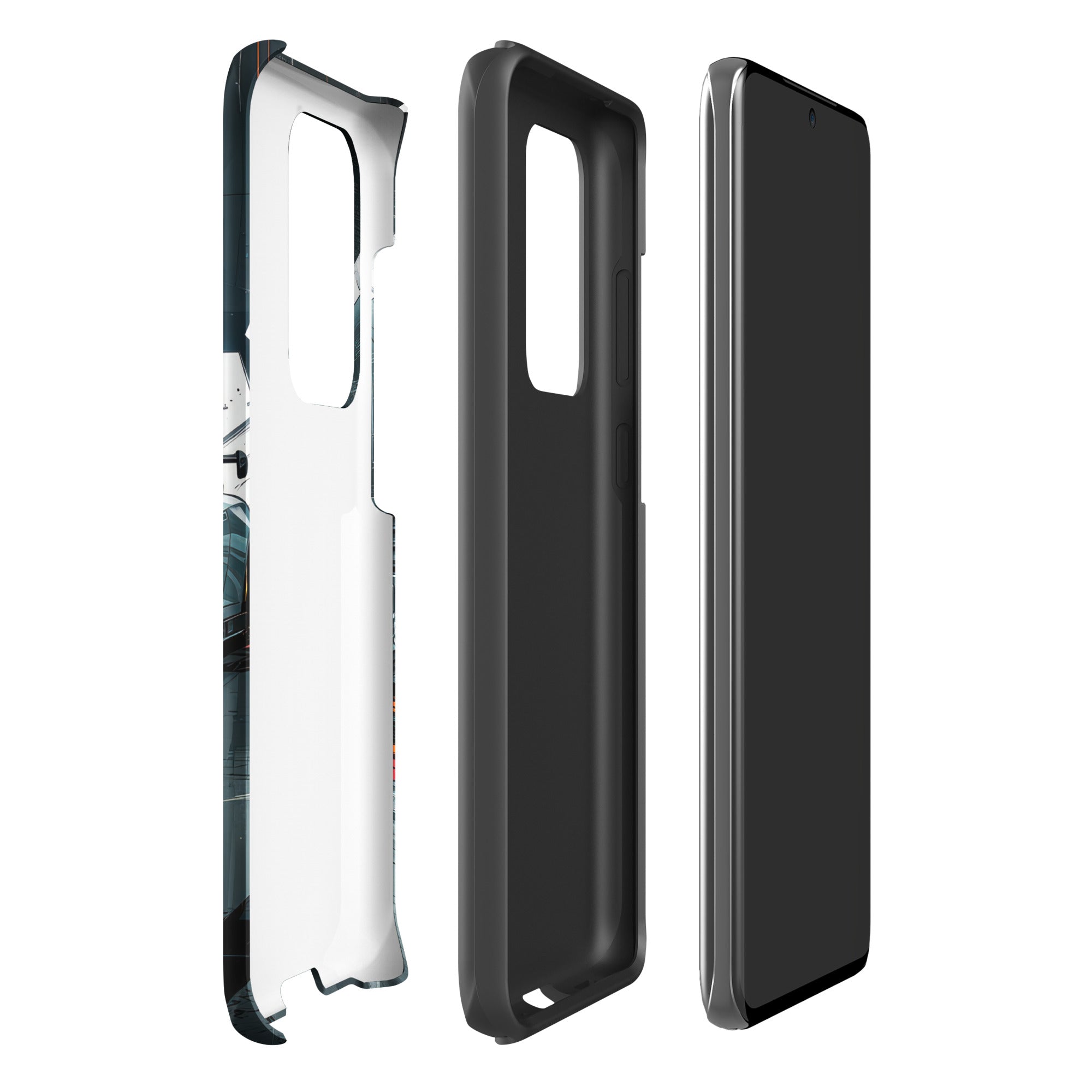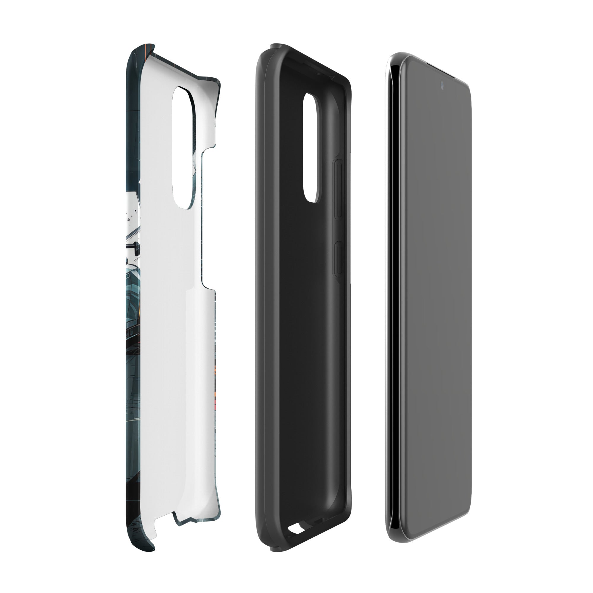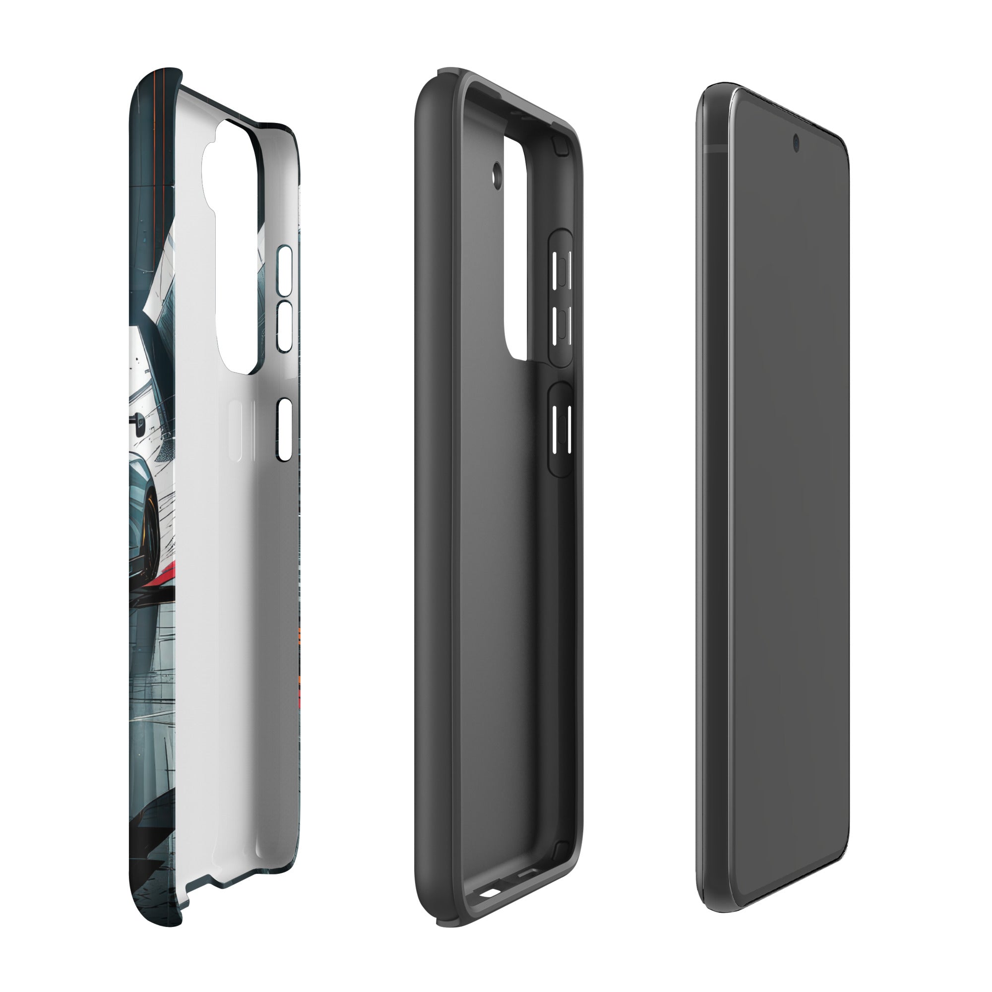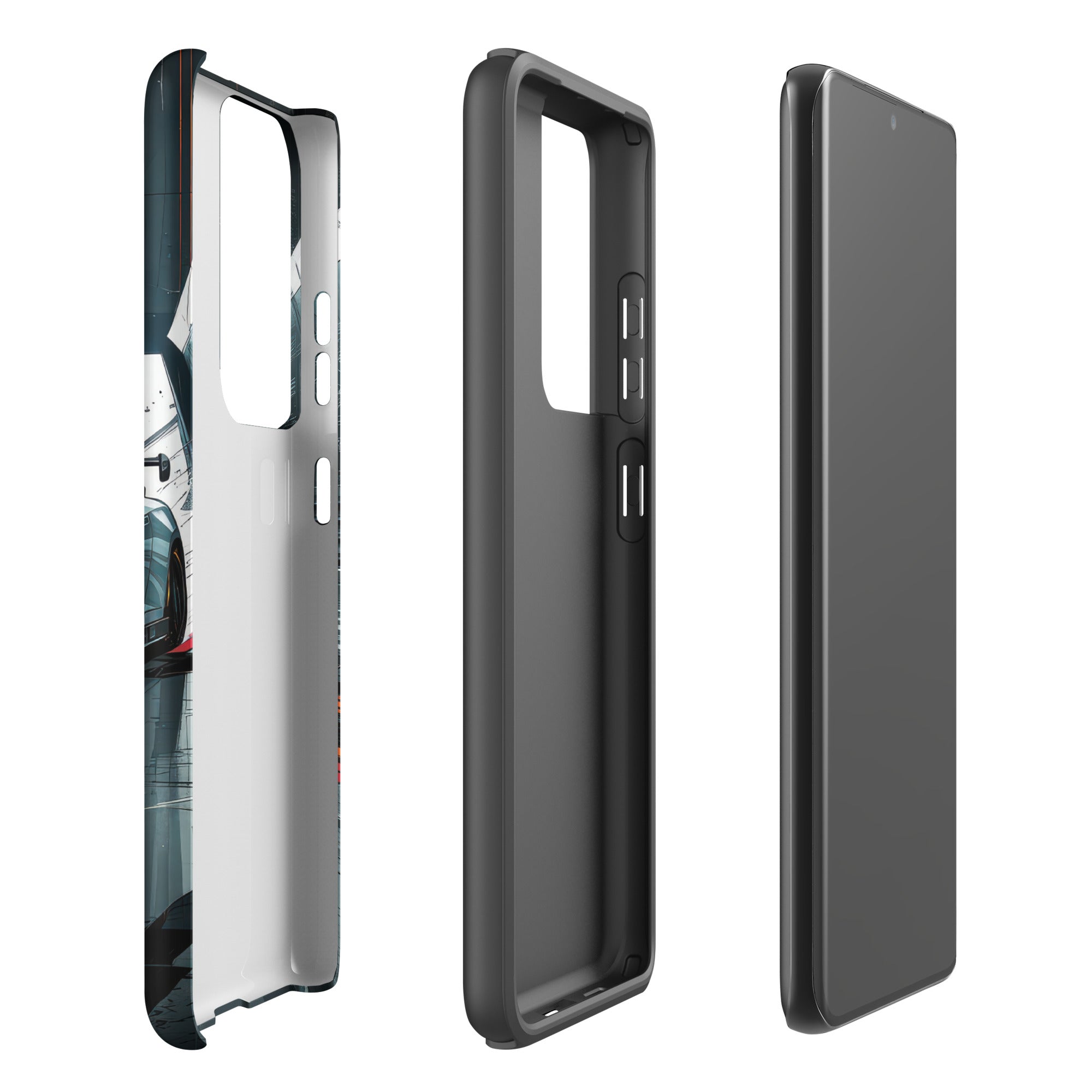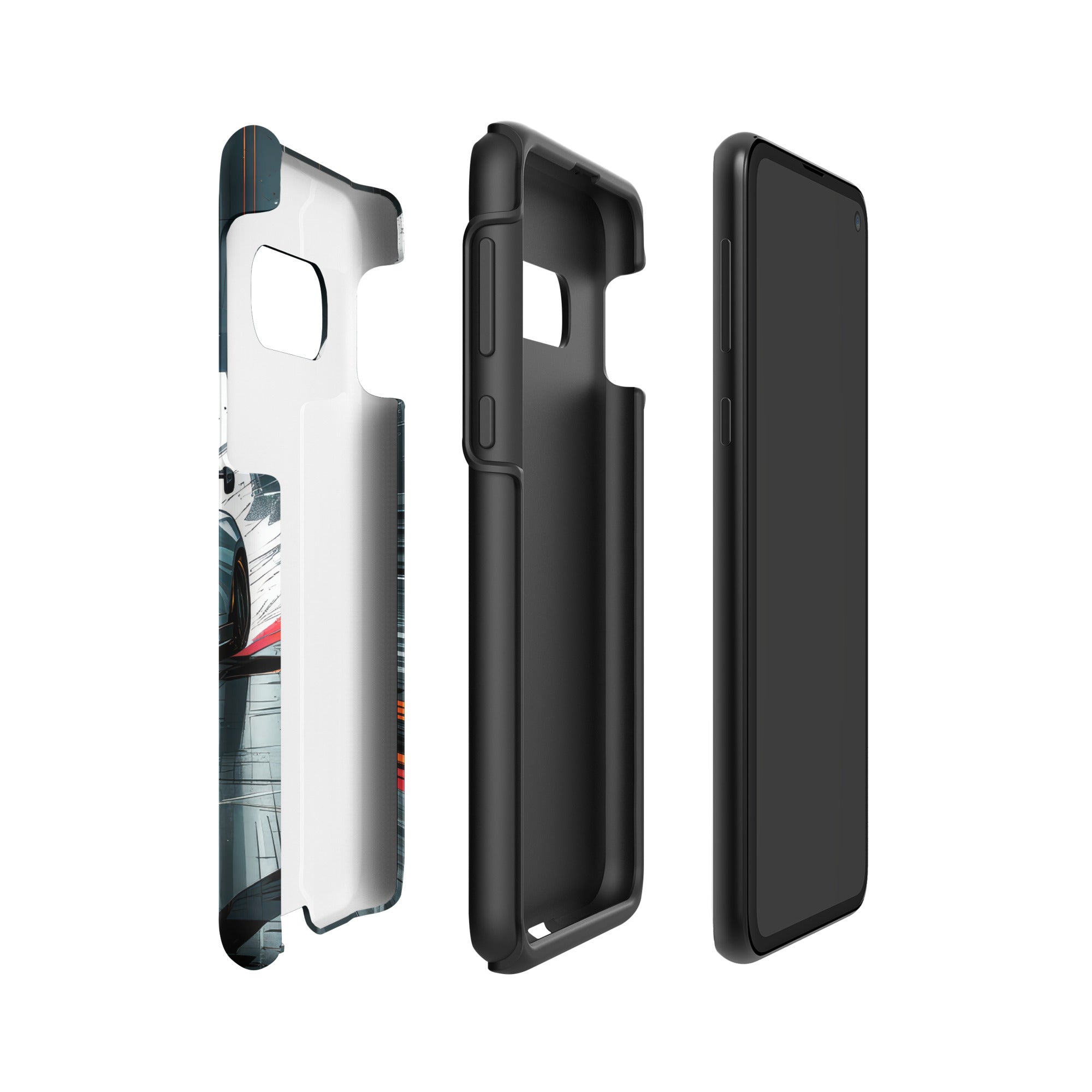 The artwork features a sleek, light silver/gray sports car, likely a Nissan GT-R, bursting through a futuristic, metallic tunnel. Dynamic orange and red road lines streak past, contrasting with the cool grays and blues of the high-tech background, which includes abstract circuit patterns. The overall mood is one of exhilarating speed and cutting-edge design. This case offers a secure grip and a statement-making aesthetic for those who appreciate automotive power and modern artistry. Enjoy dependable dual-layer defense with this Tough Case for Samsung®.